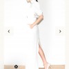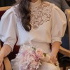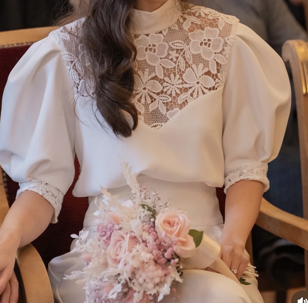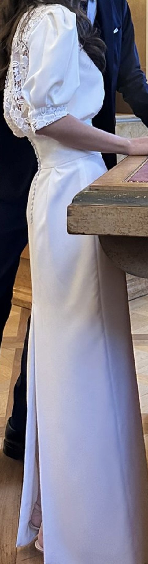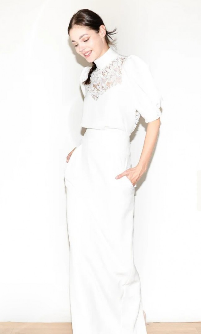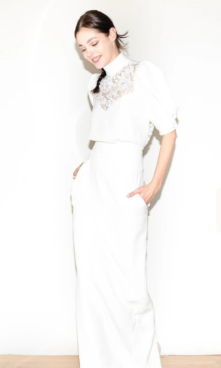 Ensemble jupe droite, fendue au dos et son top col montant, incrustation de guipure entièrement boutonné au dos.