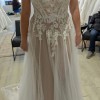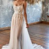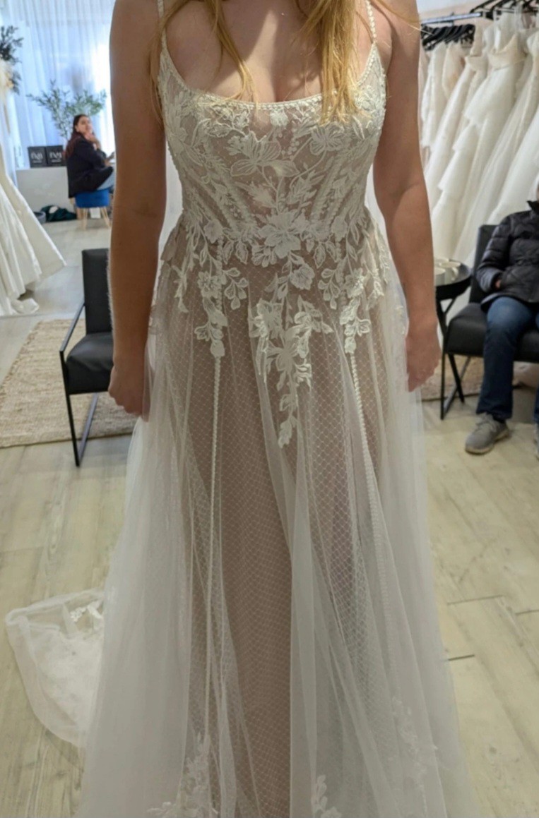 Delicate spaghetti straps provide a comfortable fit, perfectly complementing the floor-length skirt that gracefully flows as you walk down the aisle. The daring high slit introduces a contemporary twist, showcasing your legs and allowing for a hint of playfulness that sets this dress apart from traditional styles. Crafted for the adventurous spirit, this size 12 gown balances sophistication and whimsy, making it an unforgettable option for saying "I do."