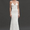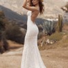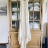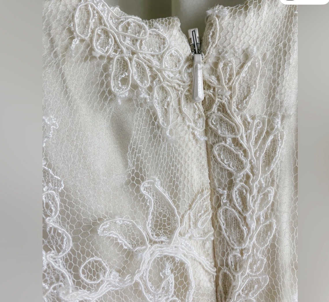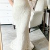 This is a sample gown, and the gown is made of delicate lace with a silk lining. There is visible wear on some of the lace. A hole is pictured near the back zipper, but a good seamstress could repair. Tag says size M with L hip, but would fit a size 0, 2 or maybe 4. Hips are wide, so would fit a girl with hips or has room to be taken in. Has been hemmed. Train remains long. 53” strap to bottom front hem, 82” strap to train hem. 16” across under bust, 22” widest point of hips.