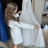 The dress also comes with detachable over-shoulder arm sleeves (not worn on the wedding day). Made from soft tulle with delicate floral and leaf embroidery, they offer a romantic, optional styling element and allow the look to be customized.