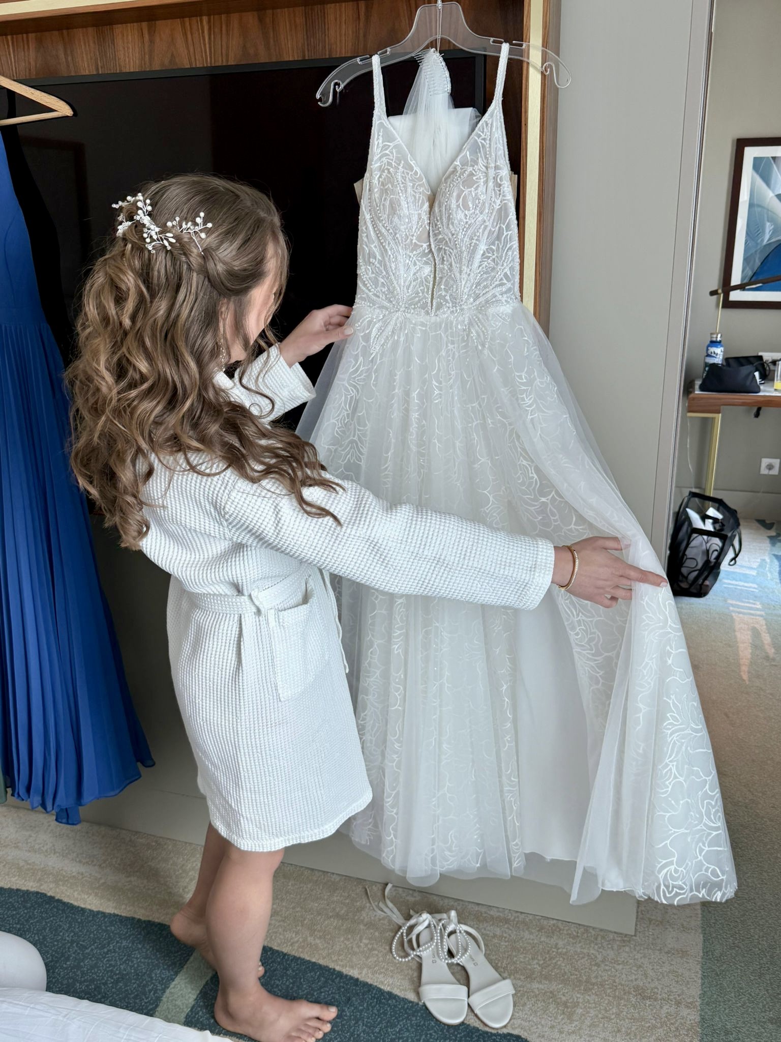 Veil included - a long, soft, flowy veil measuring approximately 160 cm at its longest point. The veil is beautifully staggered, with shorter layers that gradually extend into a longer length, creating an elegant, airy effect. It pairs perfectly with the dress and mirrors its movement for a magical effect. The veil is in excellent condition. A couple of teeth on the comb have broken off, which does not affect how the veil looks or wears.