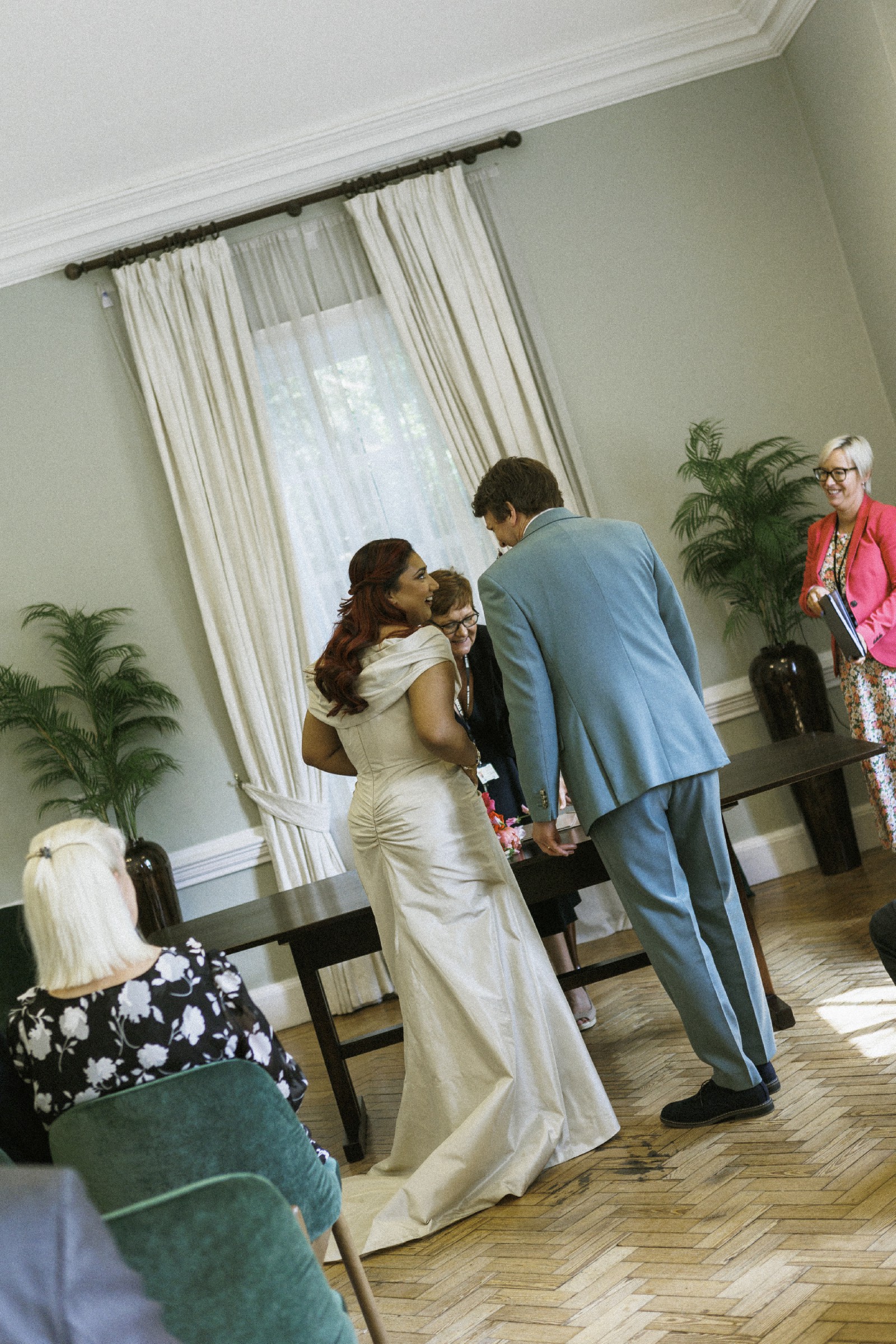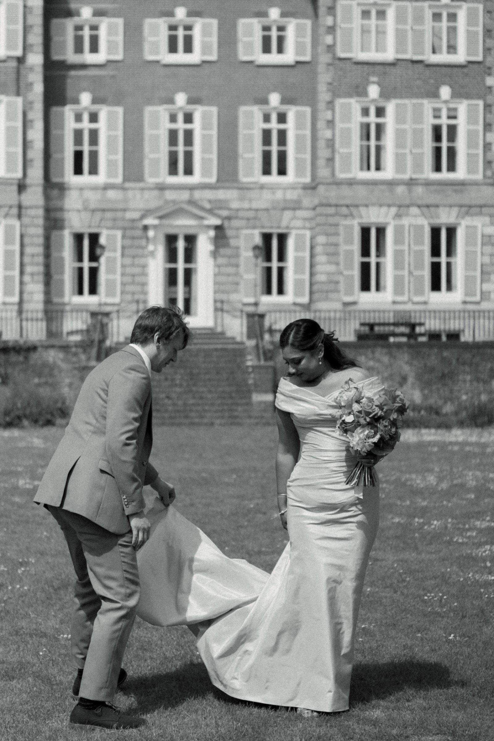 The mid-back design provides both comfort and support, allowing you to dance the night away with ease. Its floor-length hem flows beautifully, creating a striking image as you walk down the aisle. The fabric has a luxurious feel, making it perfect for a wedding in any season and at any venue.
