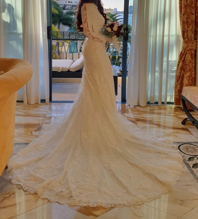 With its exquisite fit-and-flare silhouette, this gown contours beautifully to your body, accentuating your curves while allowing for graceful movement. The boat neckline adds a touch of classic charm, and the long sleeves offer an air of timeless refinement, making it the perfect choice for the romantic bride.