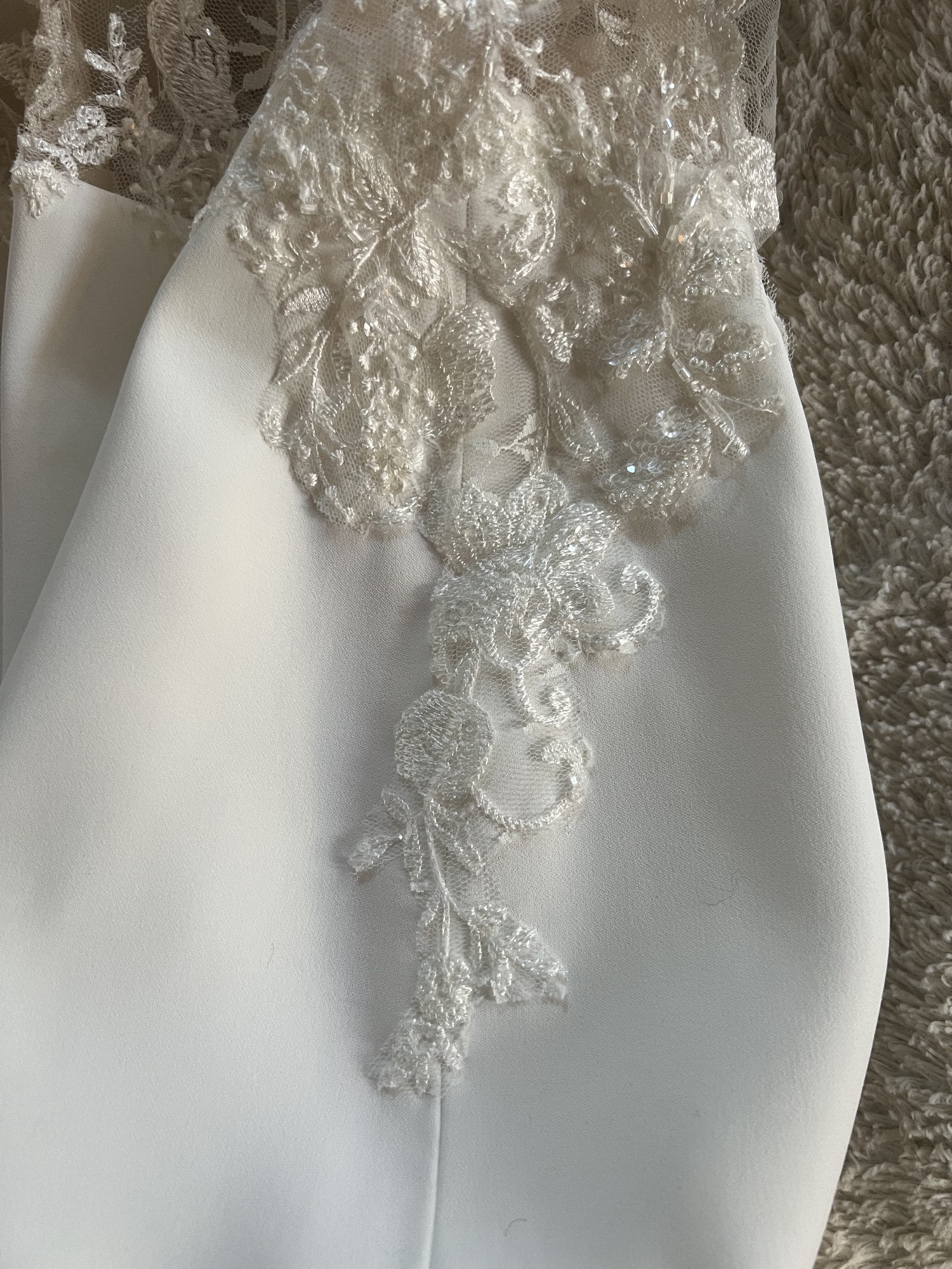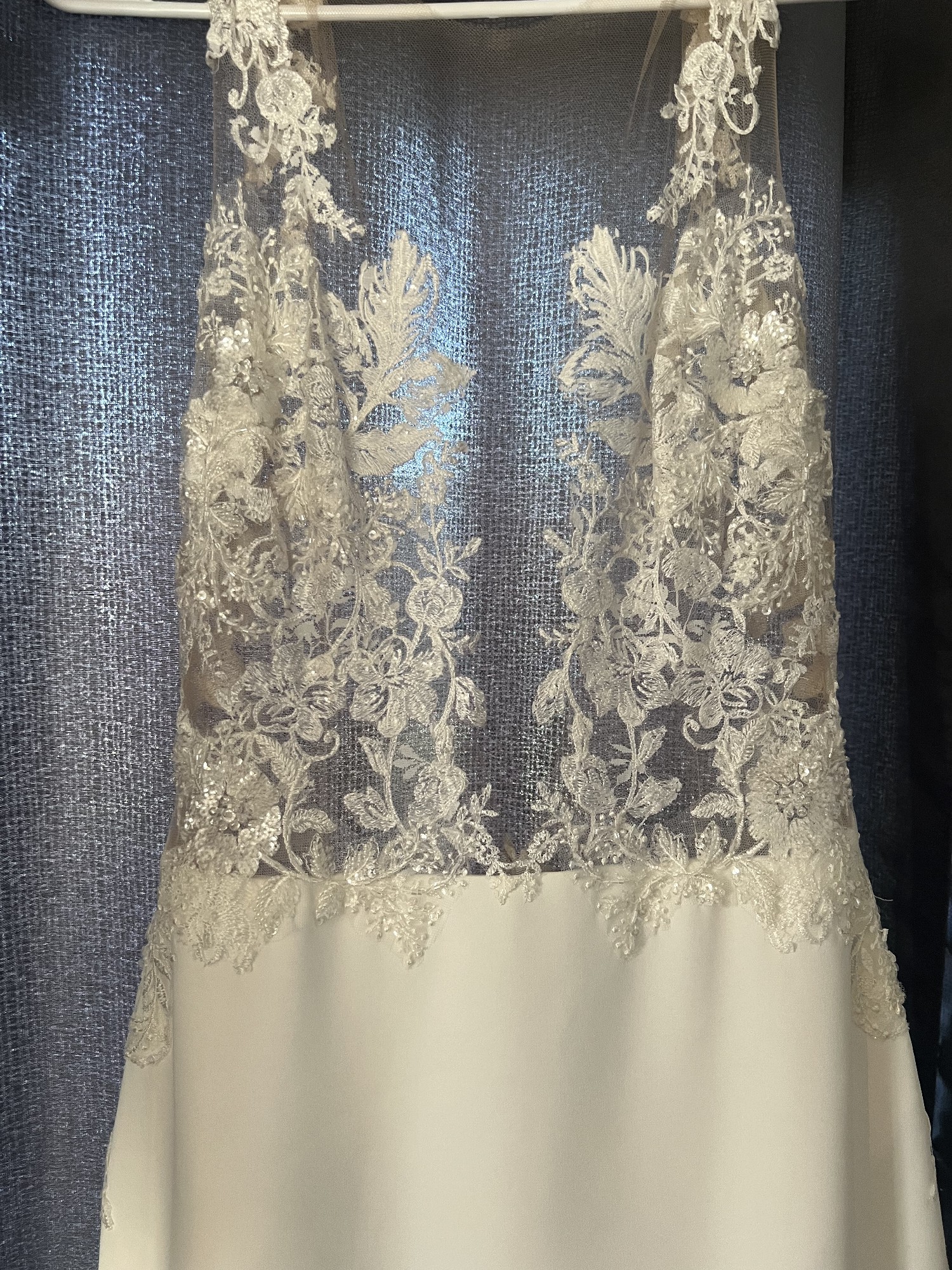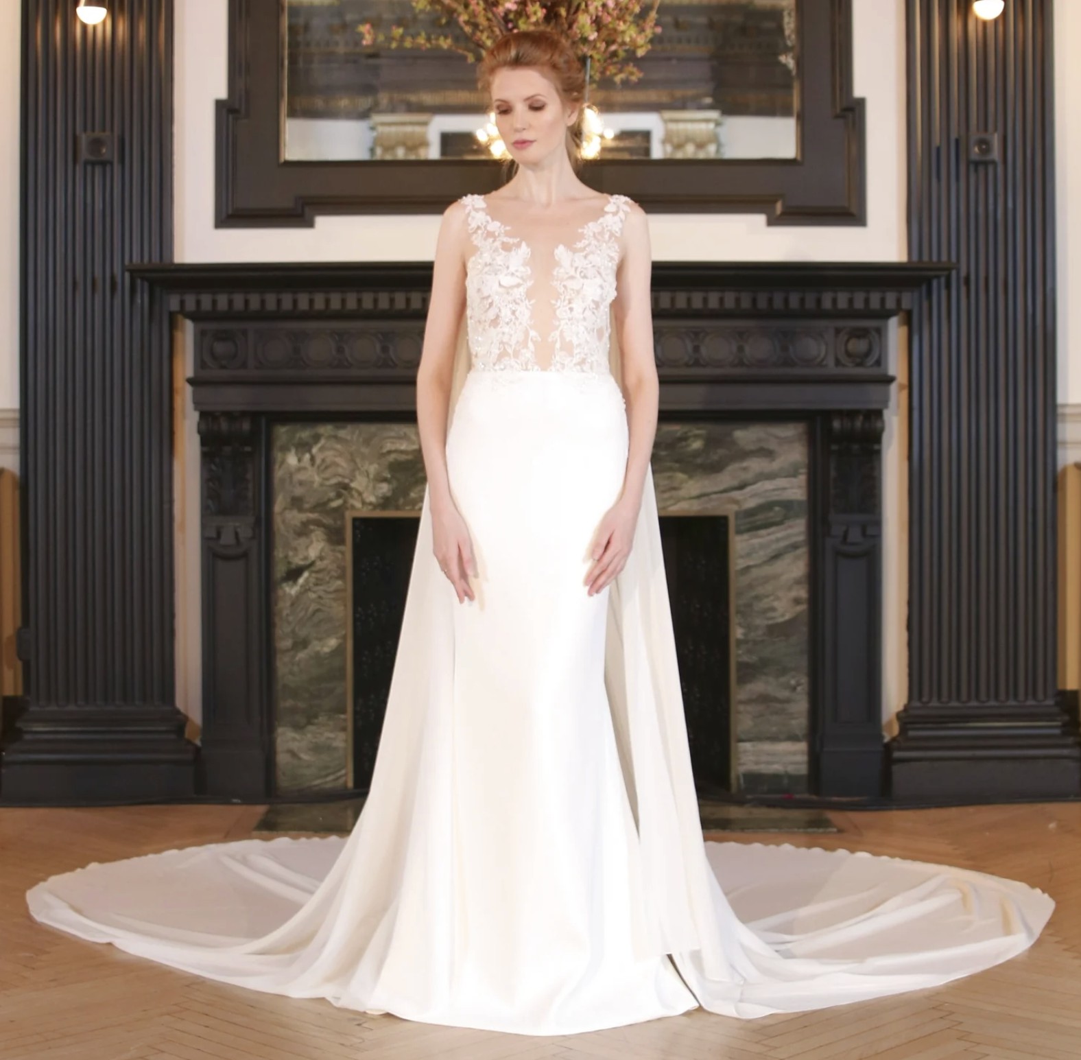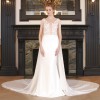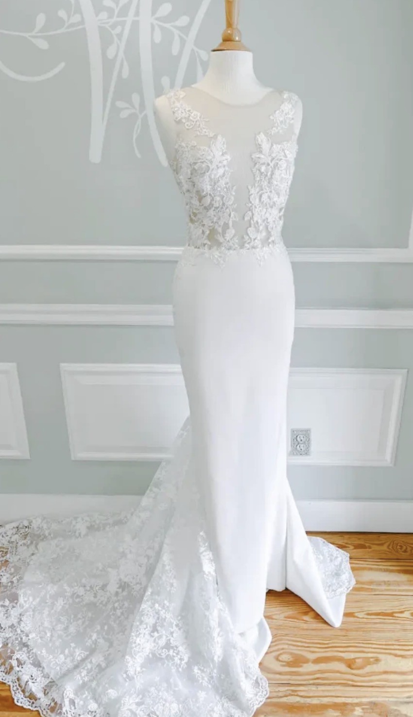 is a chic wedding gown featuring an illusion mesh bodice with intricate lace, beaded appliqués, and a deep, plunging neckline. It is paired with a sleek crepe skirt, low illusion back, and a graceful train. It offers a modern yet romantic, comfortable fit.