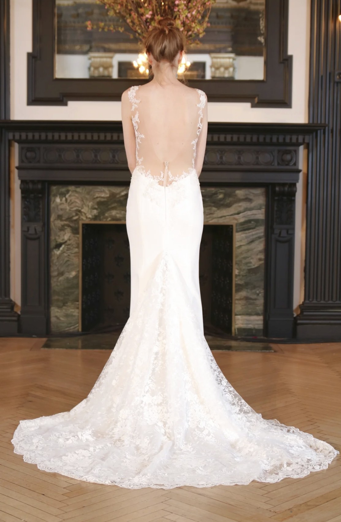 Design & Silhouette: A fitted bodice with a deep plunging V-neckline and open back, transitioning into a sleek crepe skirt.