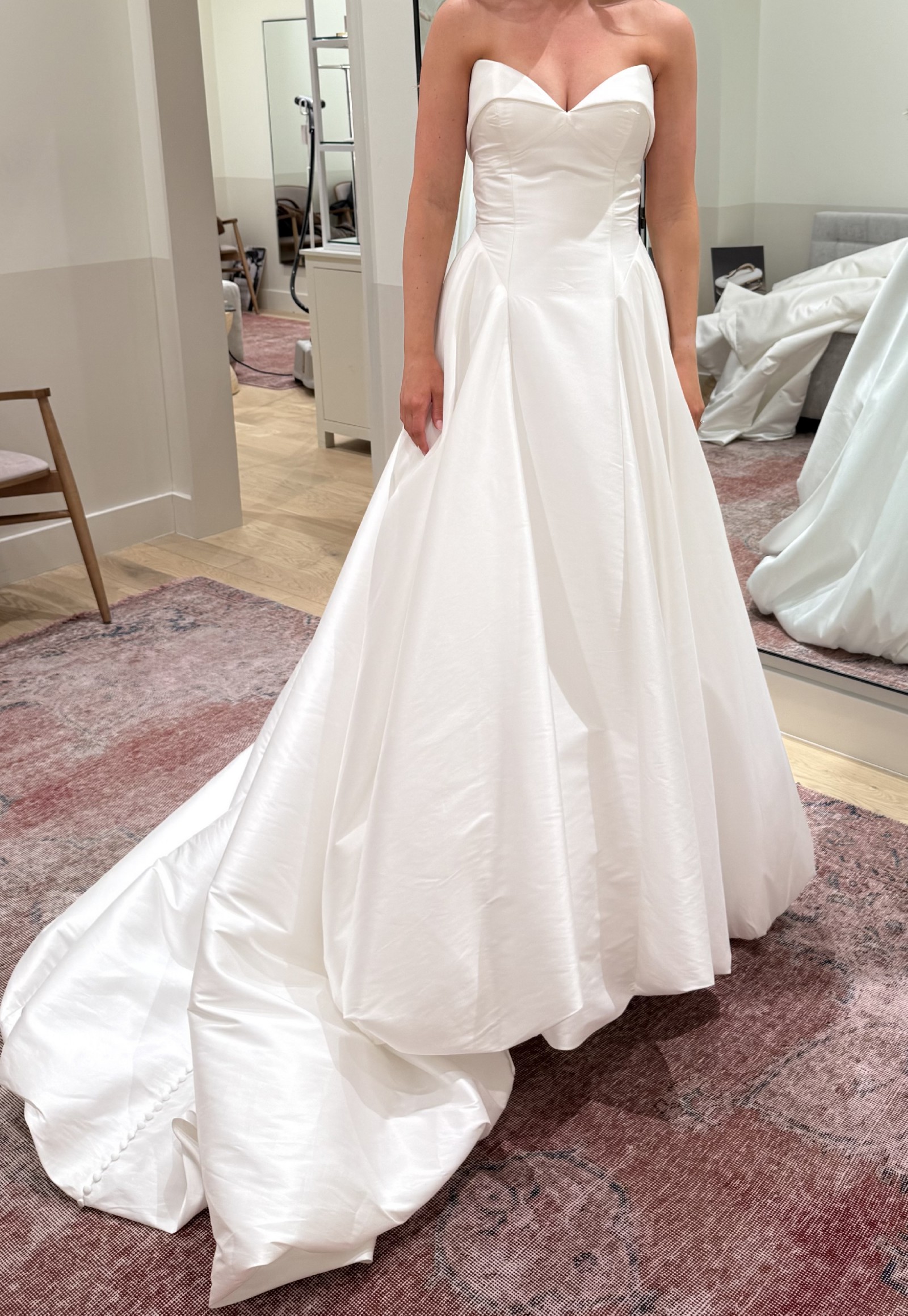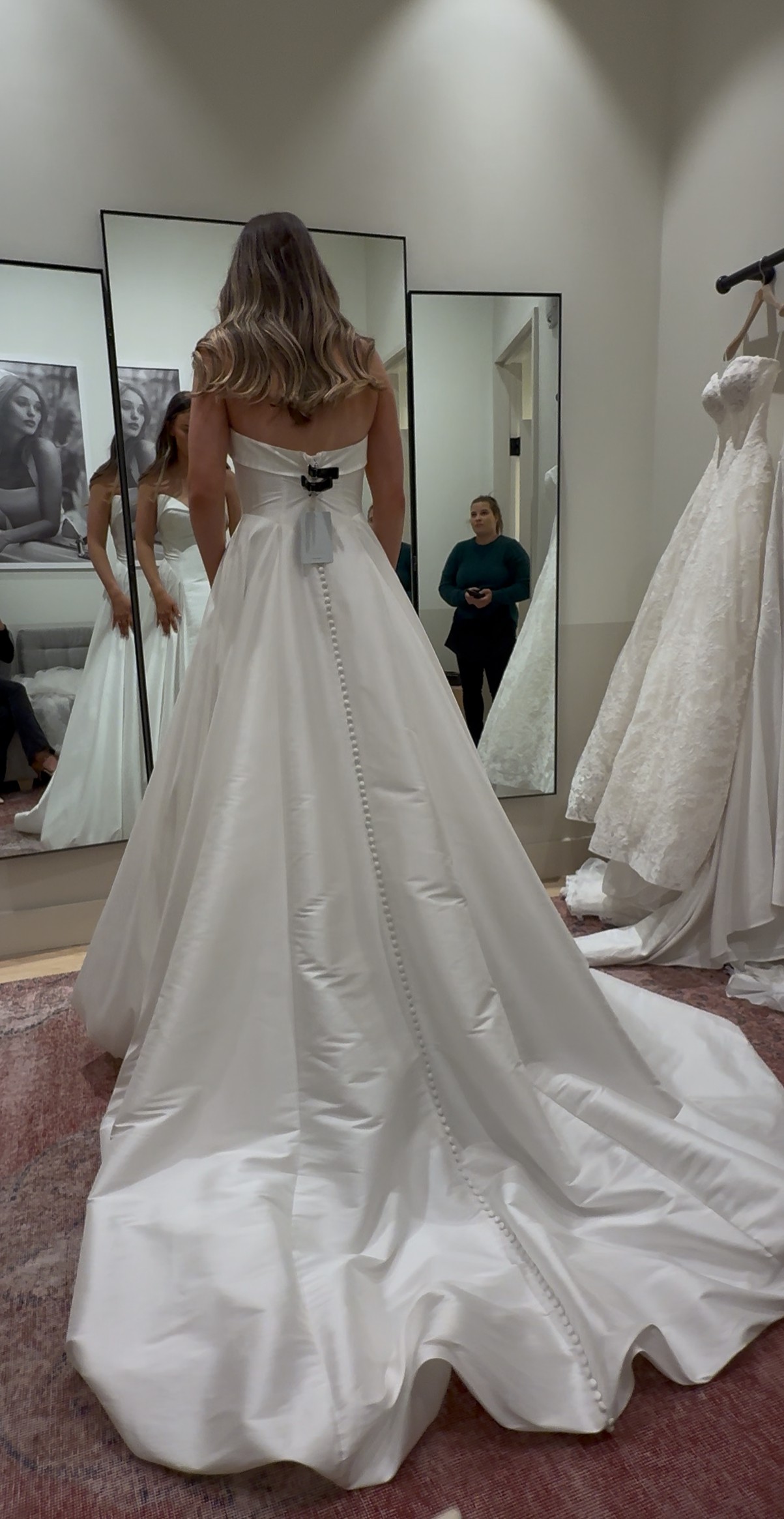 with tags! Never worn or altered only tried on. Beautiful and sublet basque waist, sweetheart neckline, bubble hem, and button detailing down the back. Boning in bodice makes for great structure and feel. Also has hidden pockets!