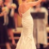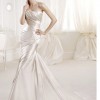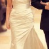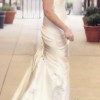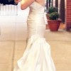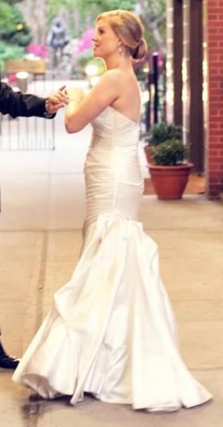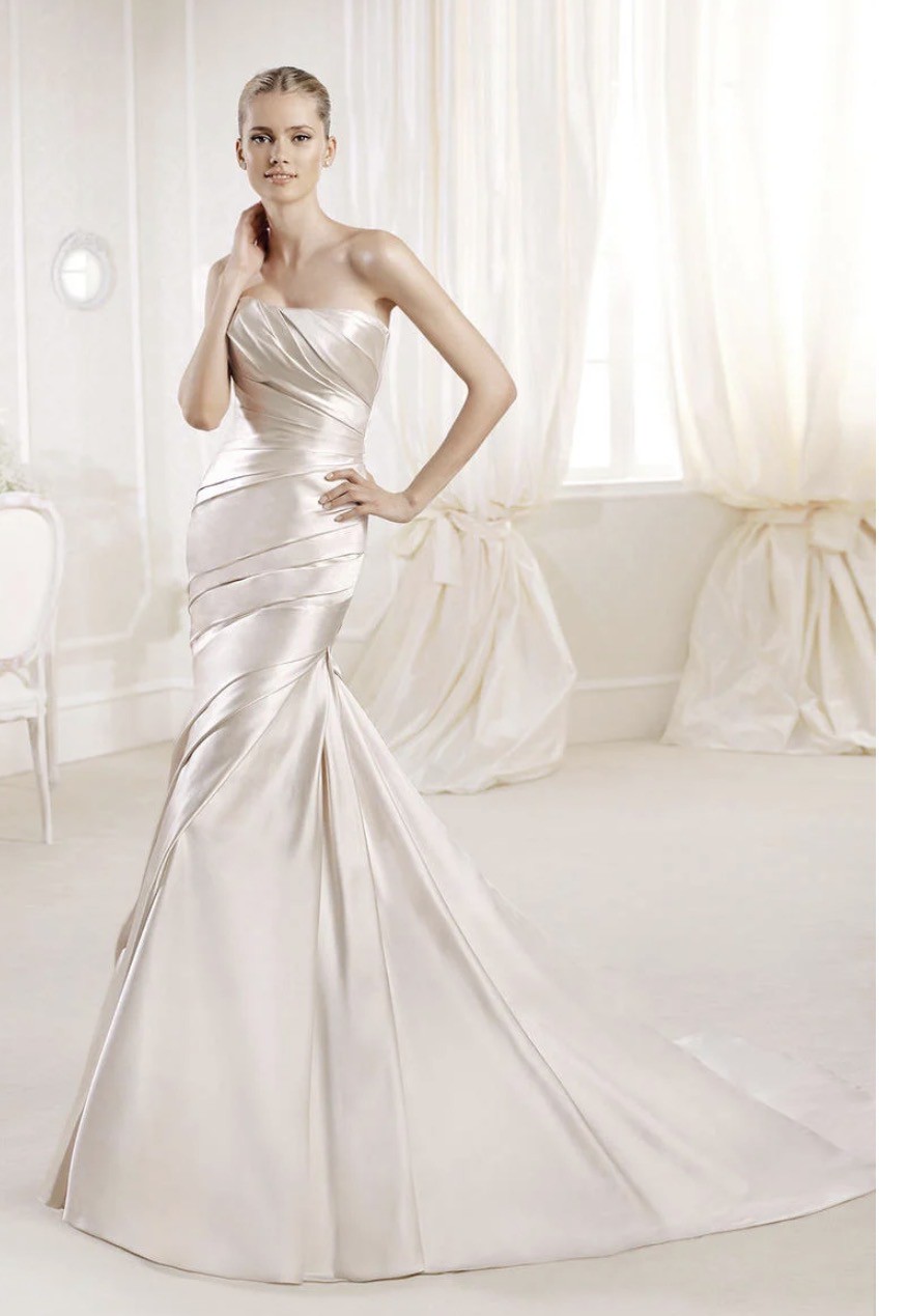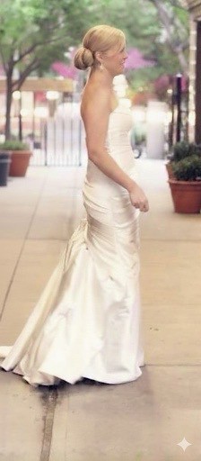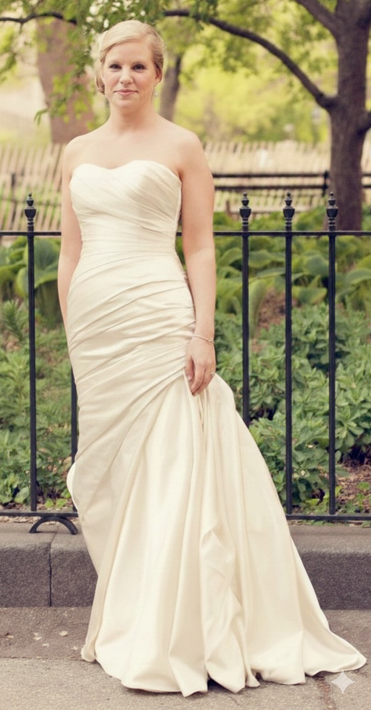 This elegant strapless wedding gown features a flattering sweetheart neckline with soft ruching through the bodice and hips, flowing into a graceful fit-and-flare silhouette with a subtle train. The smooth satin fabric creates a timeless look with a touch of Old Hollywood–inspired elegance and photographs beautifully.