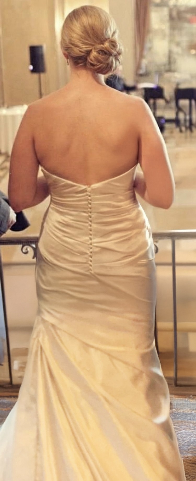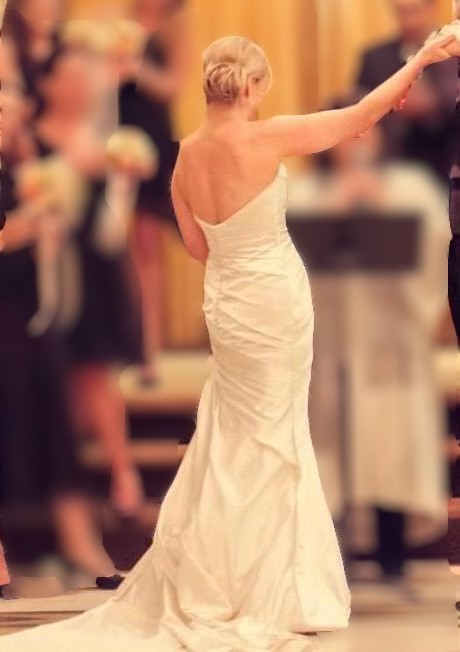 The dress was worn once and is in excellent condition. It was professionally tailored by a bridal seamstress for a clean, flattering fit through the bodice, waist, and hips, while maintaining the original design and length. A bustle was added for ease of movement during the reception. Cups were added for support and can be easily removed if desired.