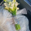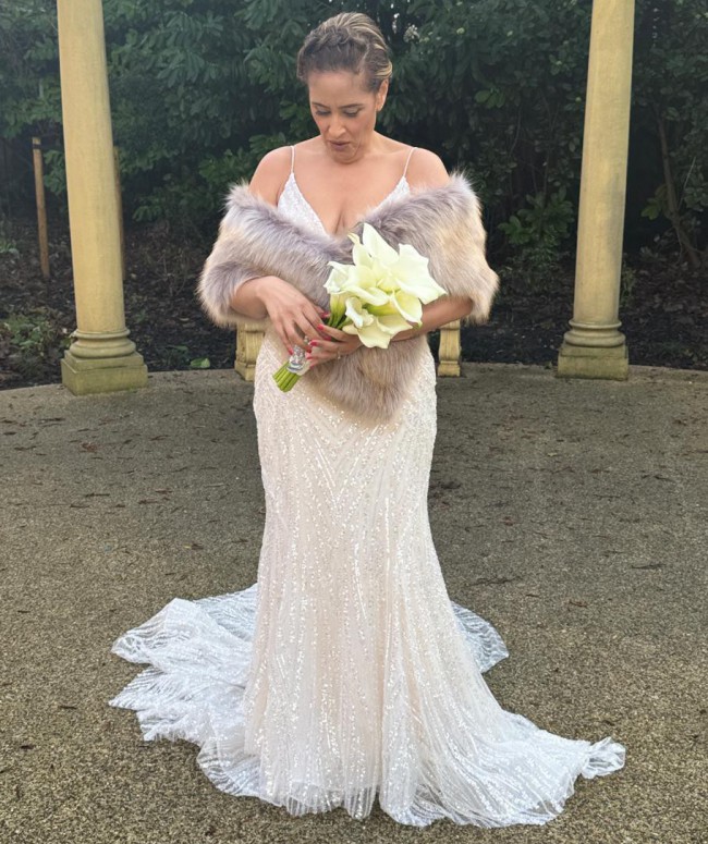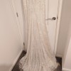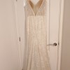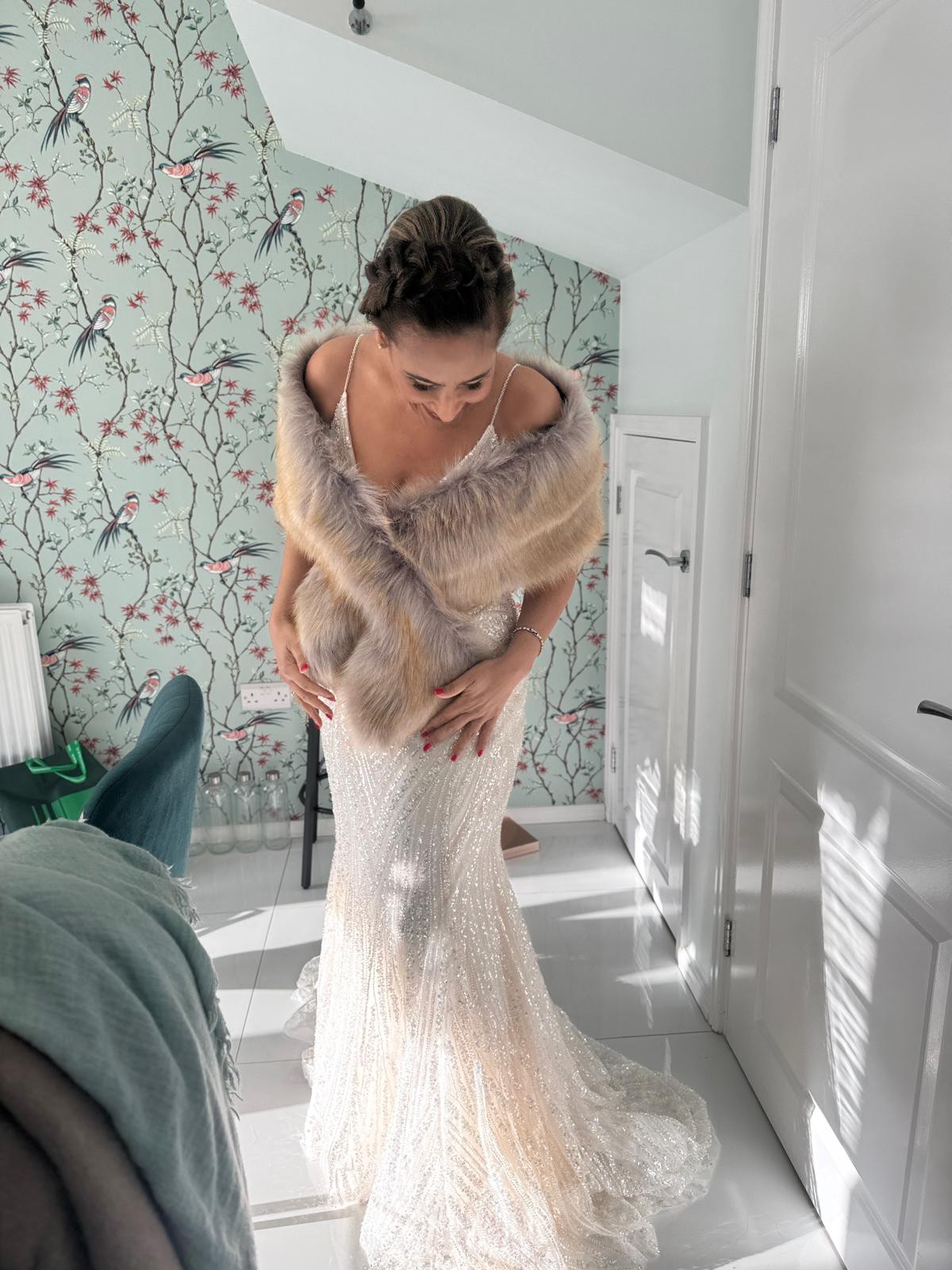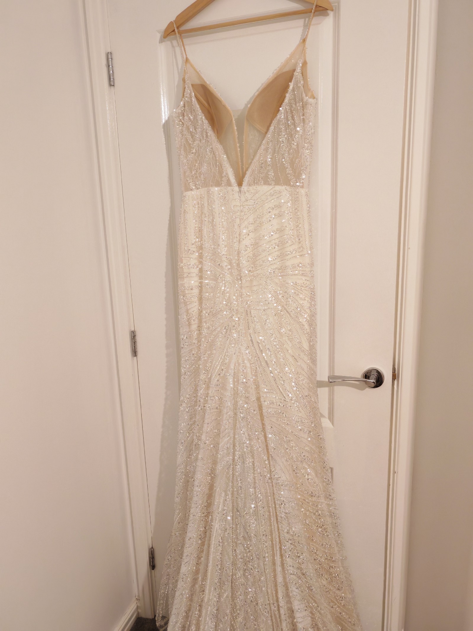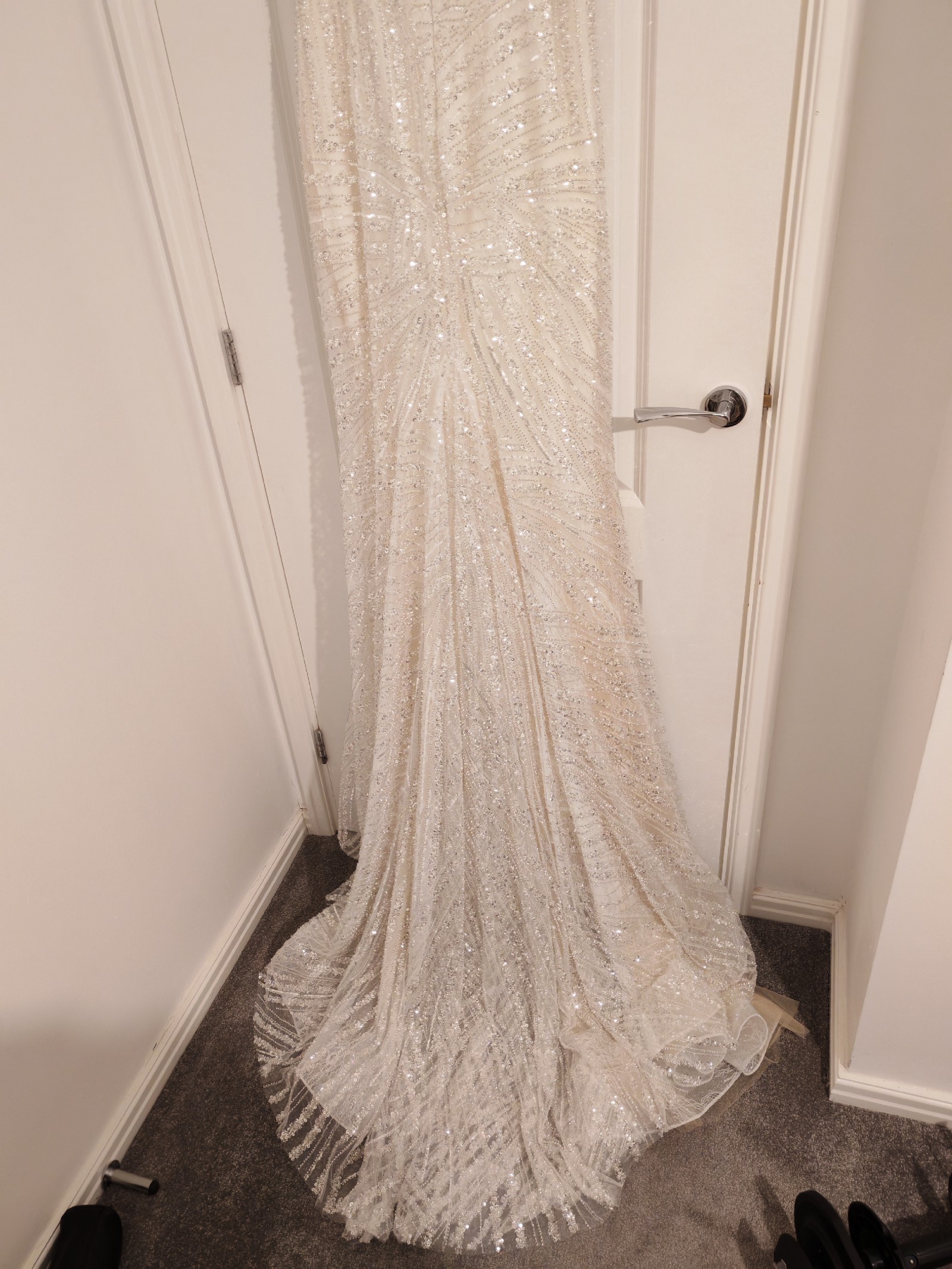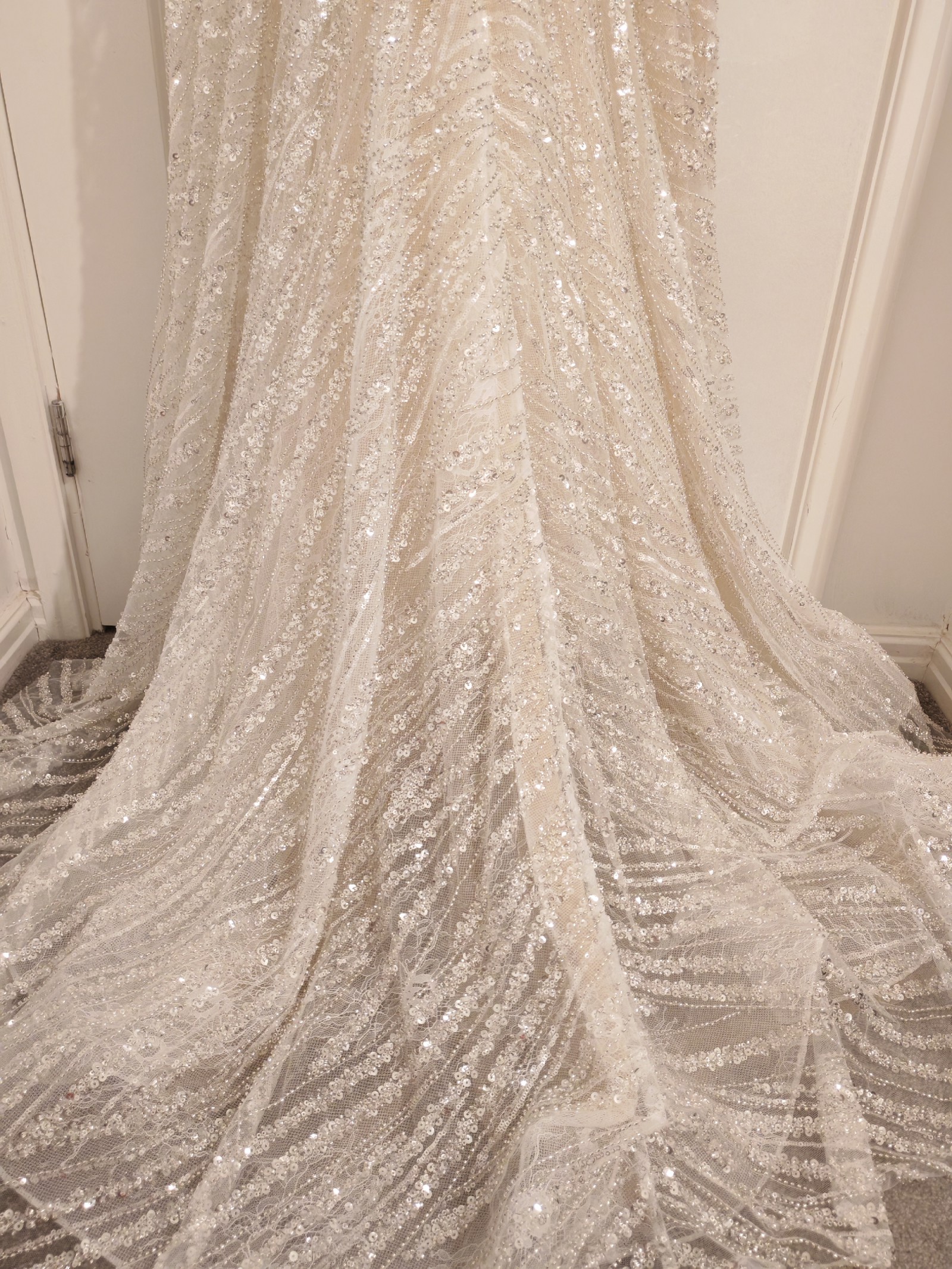 The gown is adorned with intricate all-over beadwork that subtly sparkles, creating a luminous effect as it moves. The fitted shape flows effortlessly into a gentle train, giving a classic bridal finish that photographs beautifully from every angle.