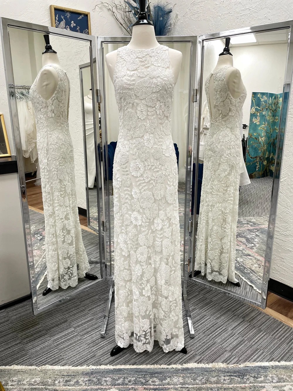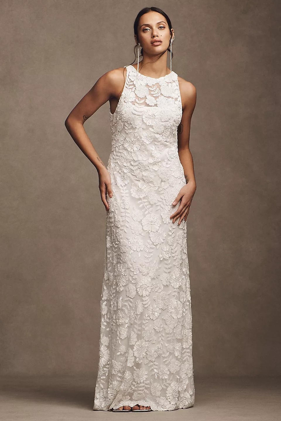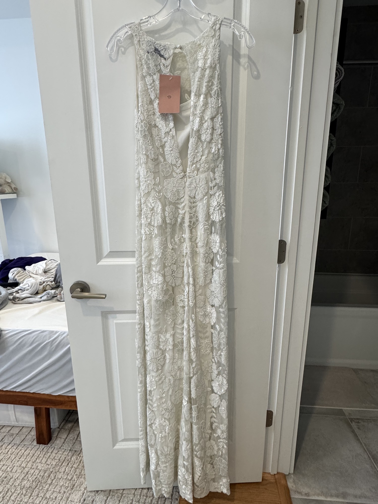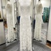 Brand new dress, never worn, and with tags! Accepting offers on price. Dress no longer sold online or in stores. This Winnie Floral Column Gown by BHLDN is a breathtaking piece that encapsulates romance and elegance. Its sheath silhouette gracefully hugs the body, creating a flattering figure while allowing for comfortable movement. The enchanting boat neckline frames the collarbone beautifully, adding a touch of refinement to your bridal look.