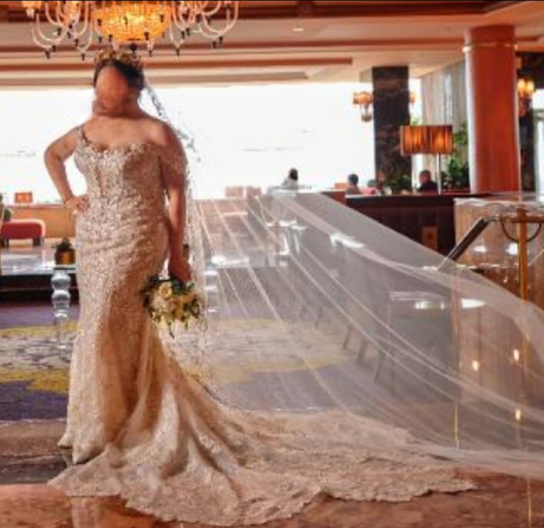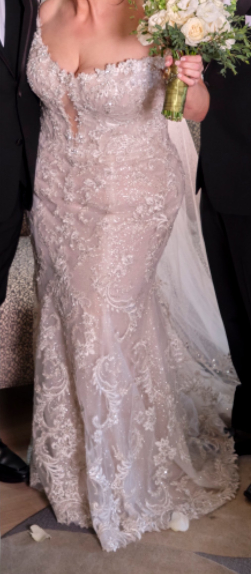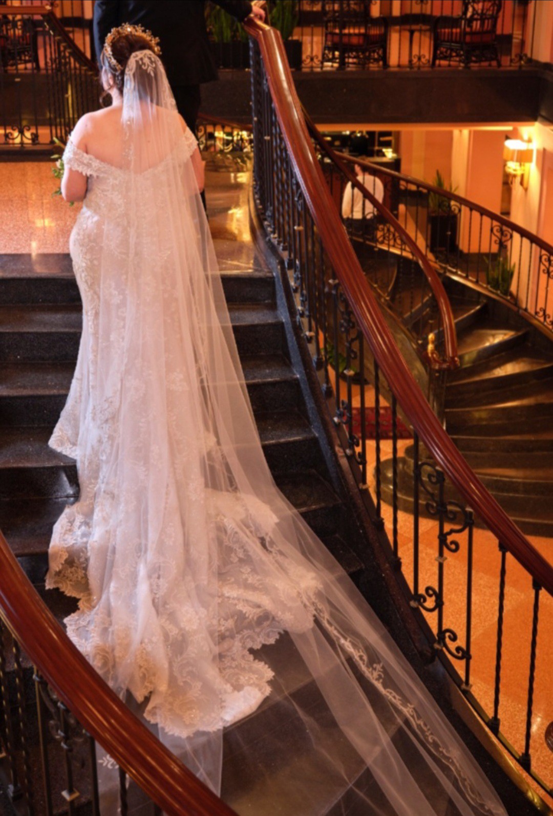 As a size 22, this dress offers both comfort and style without sacrificing elegance. I hope this dress brings as much joy to you as it did for me on my special day. It deserves to be worn again, creating new memories and moments. The matching veil is very long and impressive