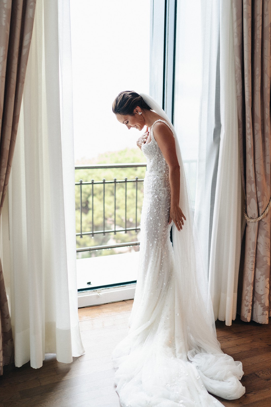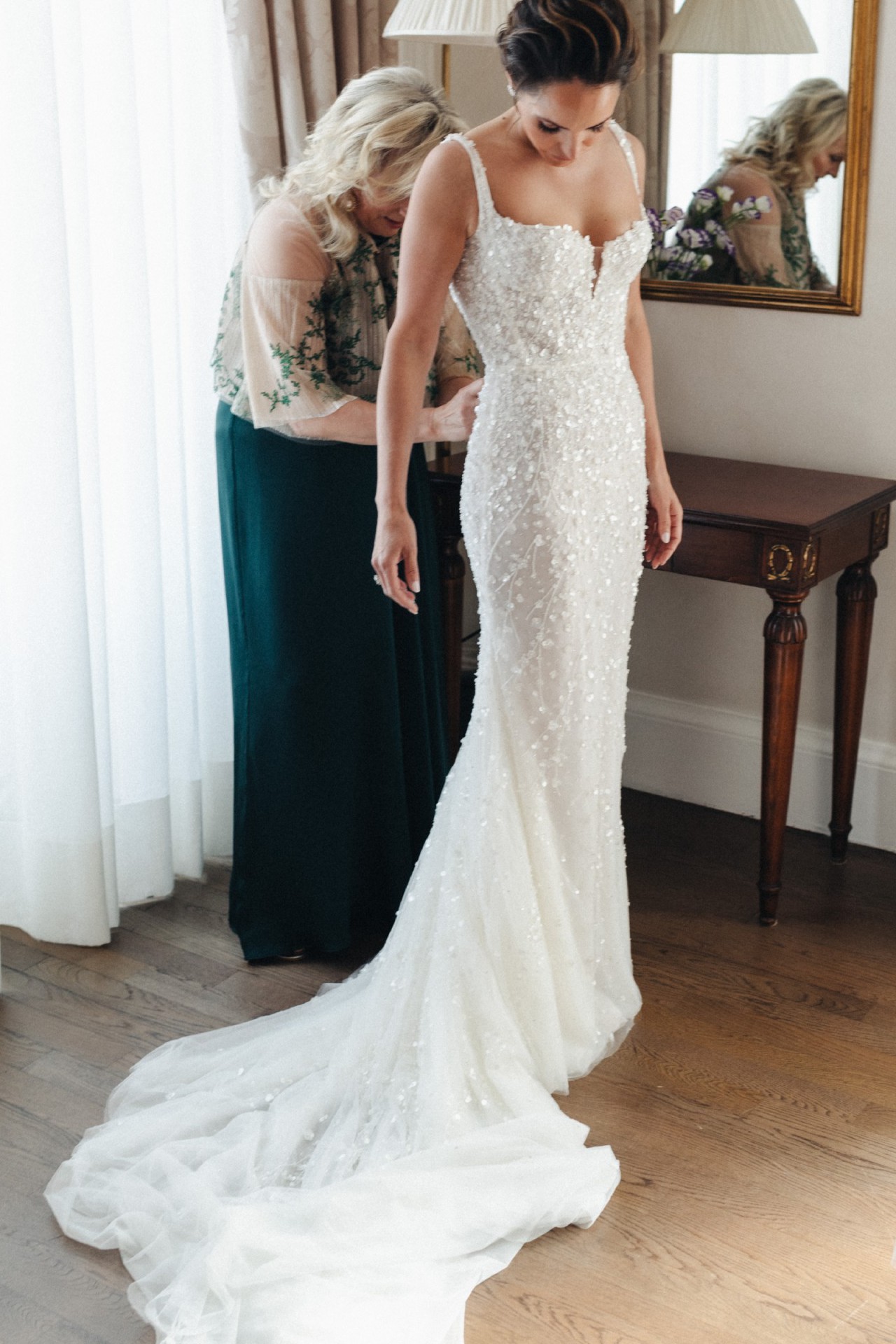 We designed this dress with 'layers of fine tulle to create a subtle transparency and compliment the bespoke bead work flowing down the dress. Using a mixture of pearls, diamanté and iridescent sequins we wanted to create a dress that would glisten in the sunlight and sparkle in candlelight.'