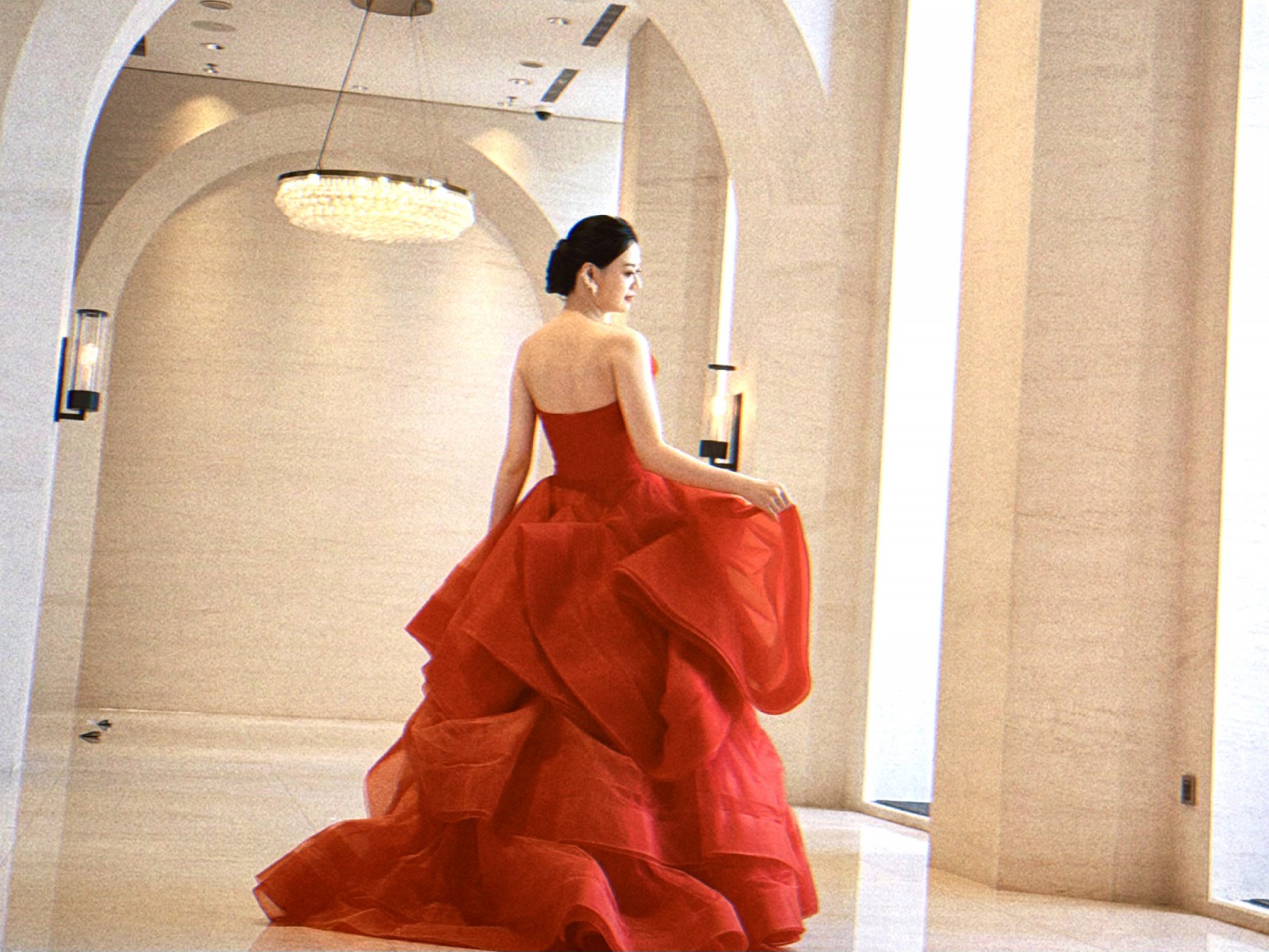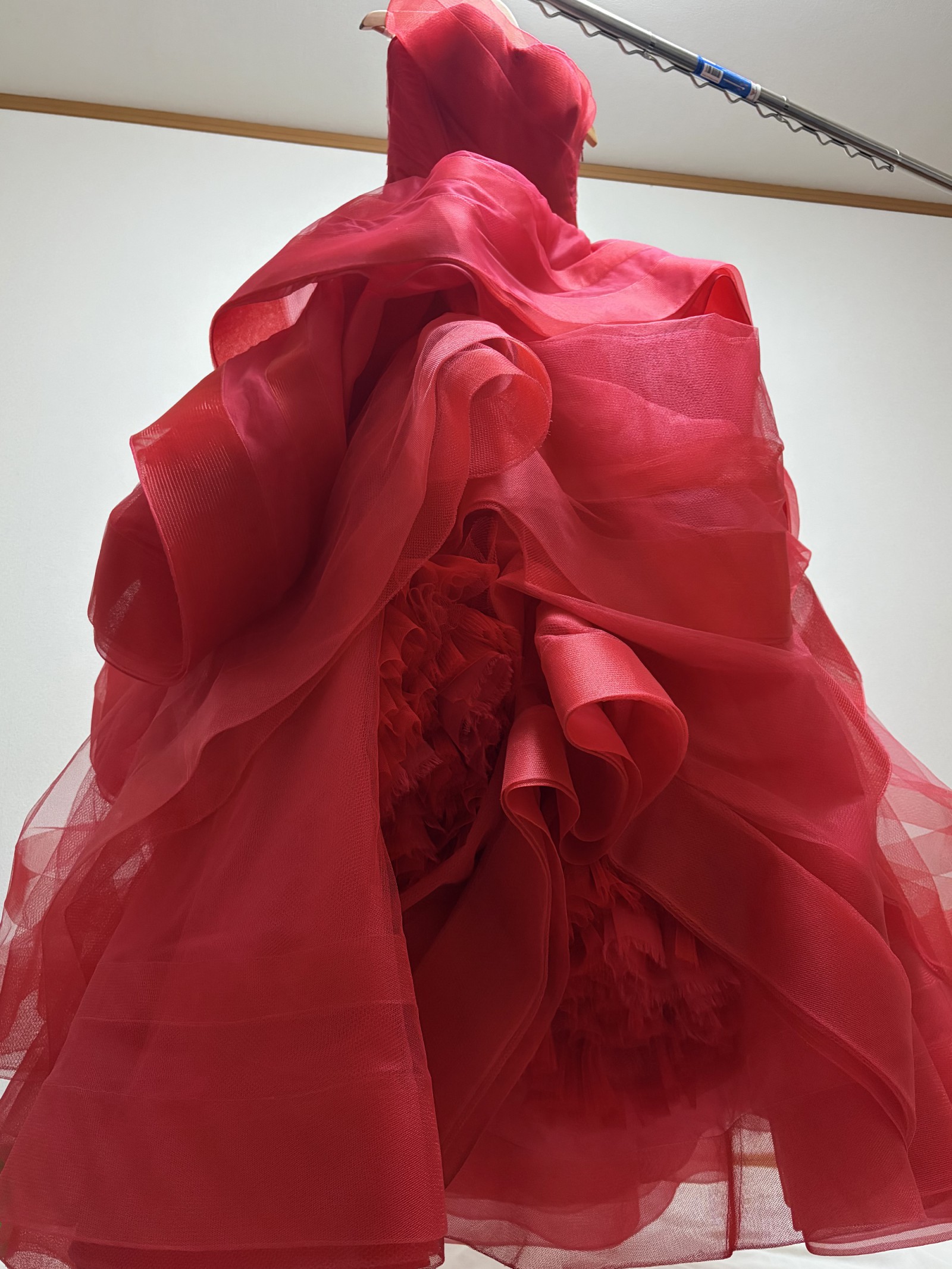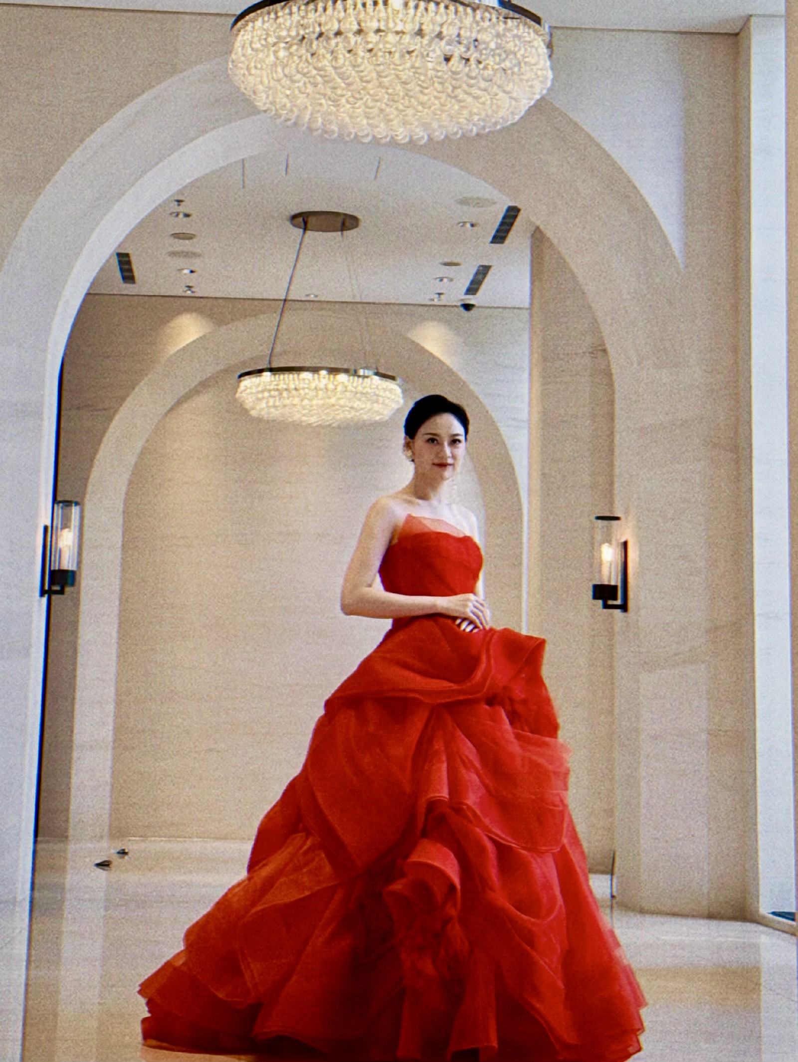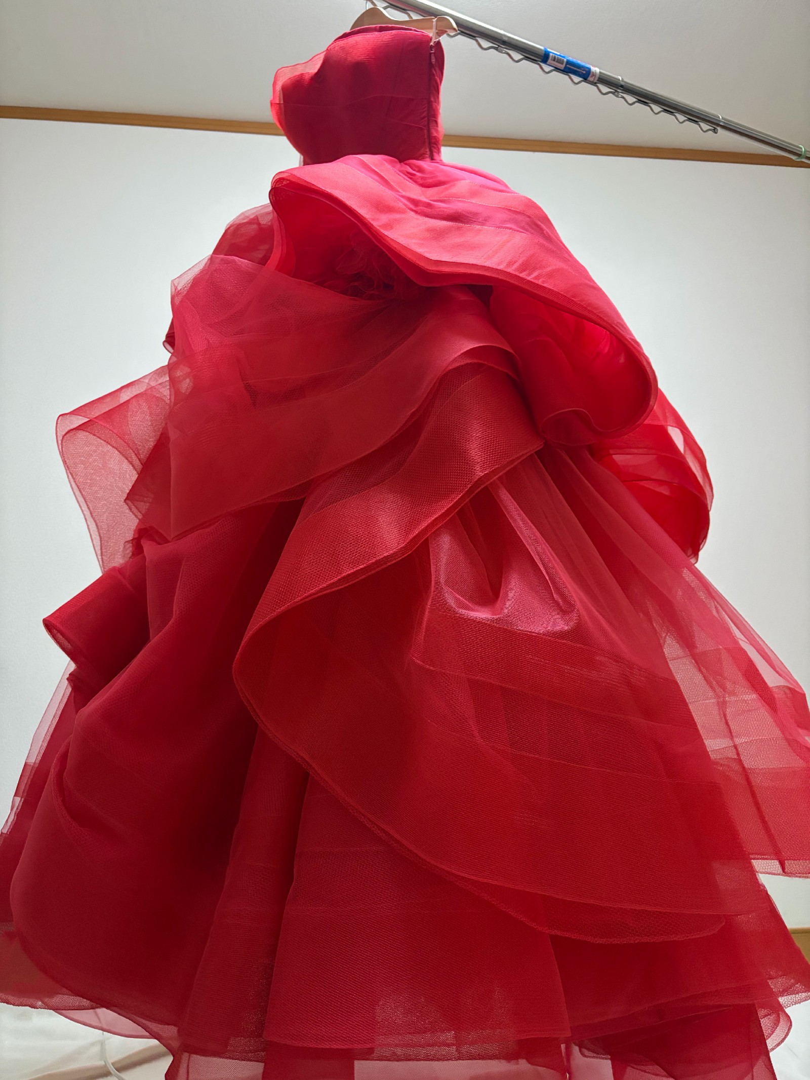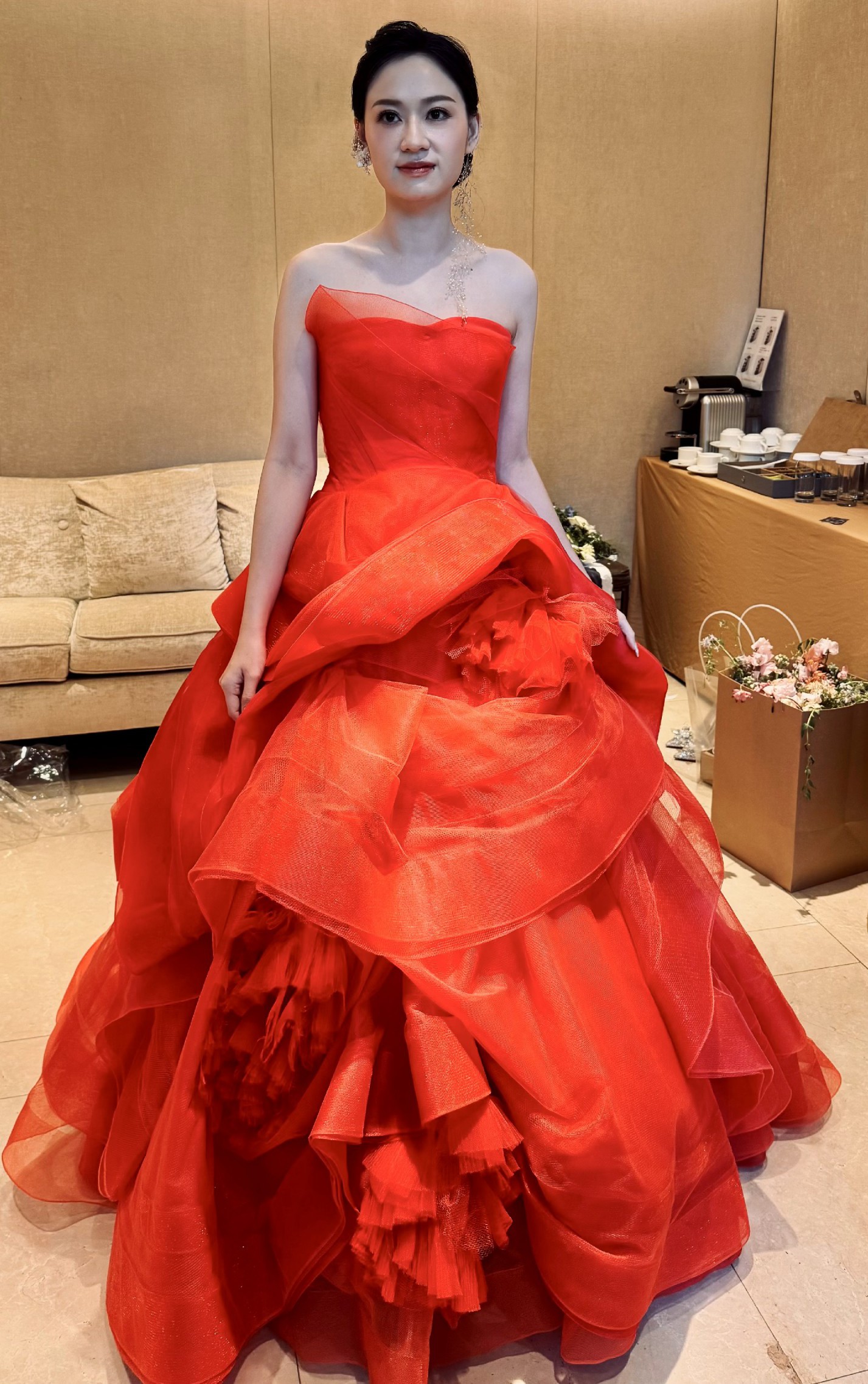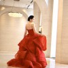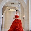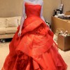 This is the classic Vera Wang Katherine gown in the iconic Cardinal red, a shade known for flattering all skin tones.