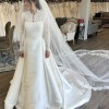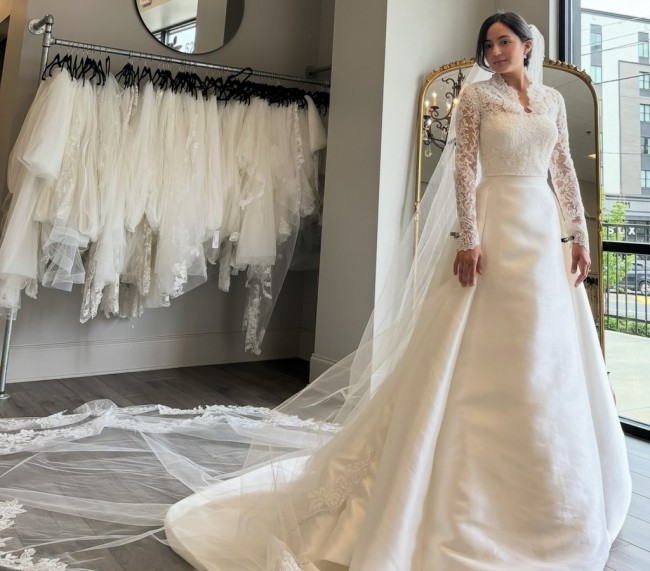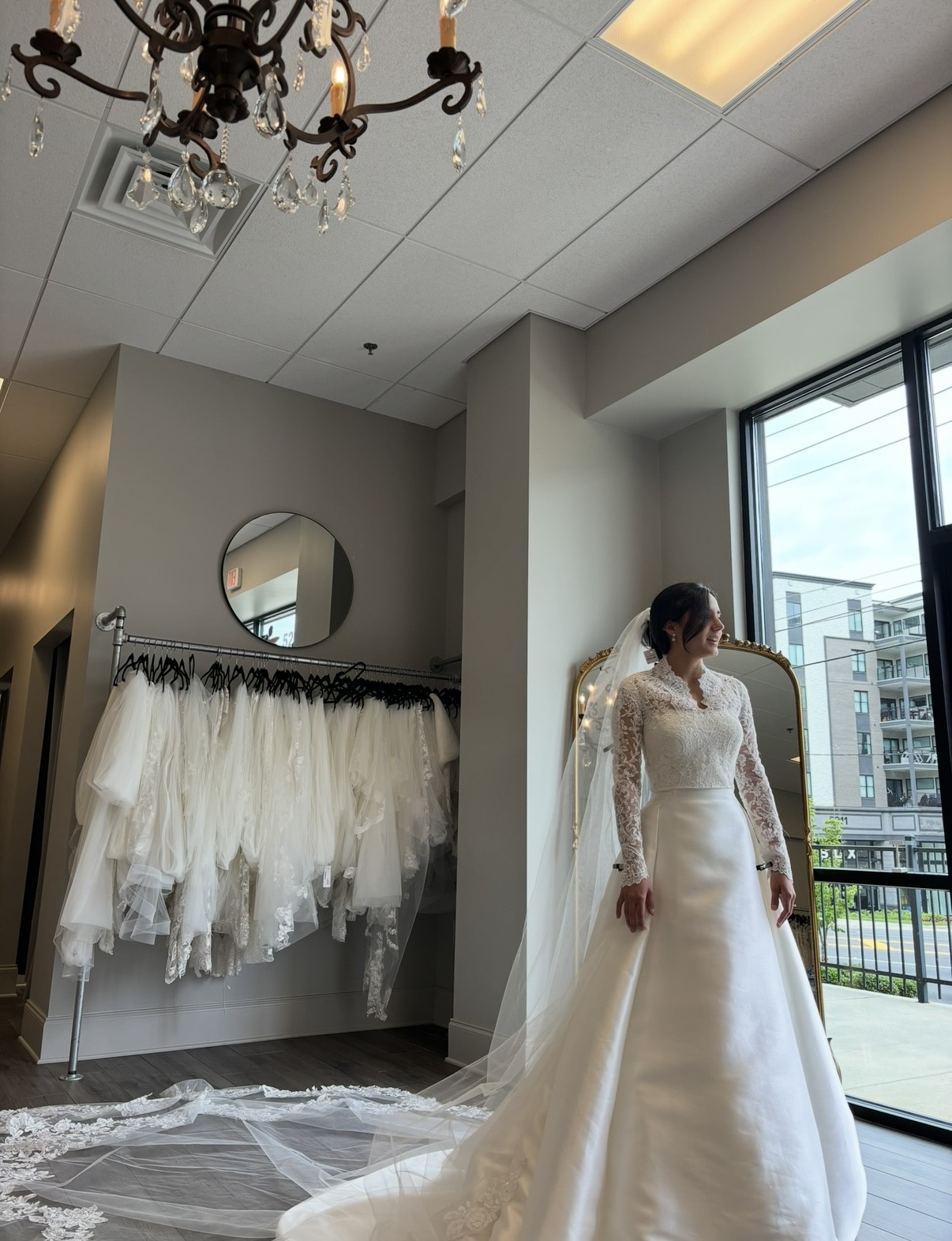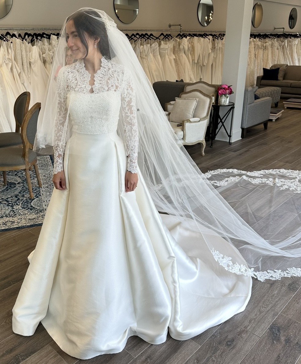 This dress was bought in Madrid, Spain, and flew with me all the way to Atlanta, GA. I bought it when I just got engaged, and then I realized I wanted a totally different style for my wedding day. So, I'm selling it.