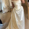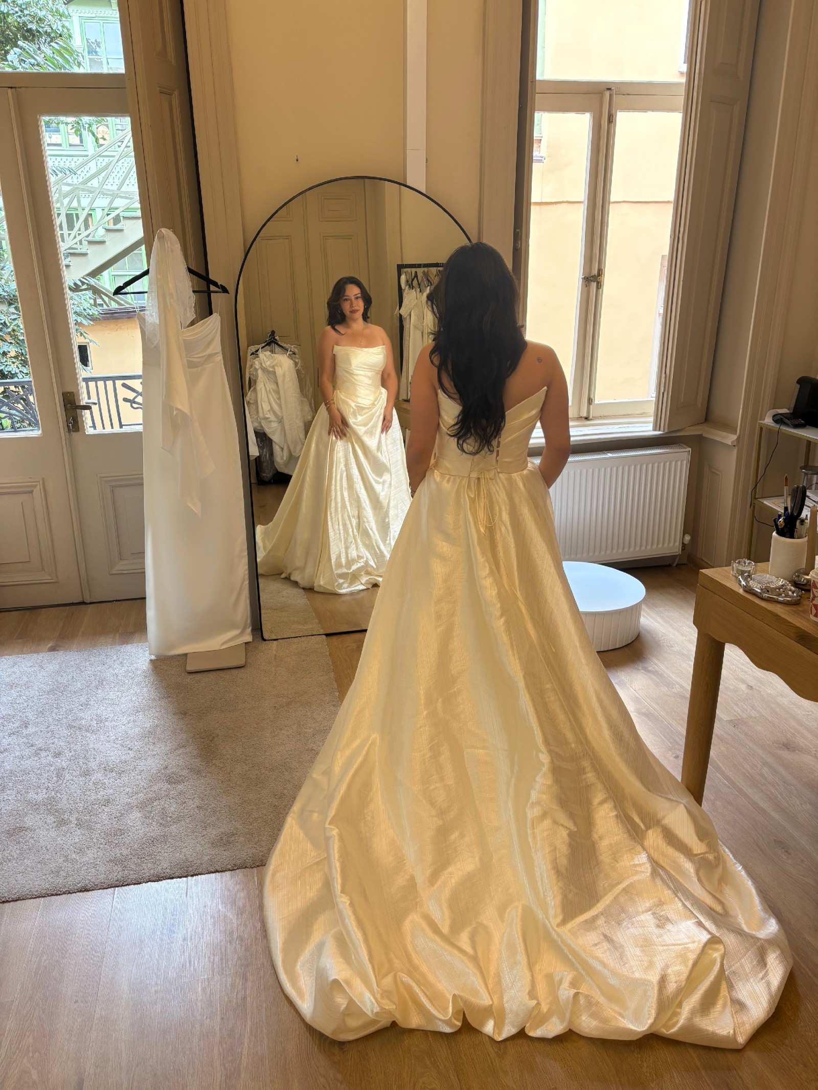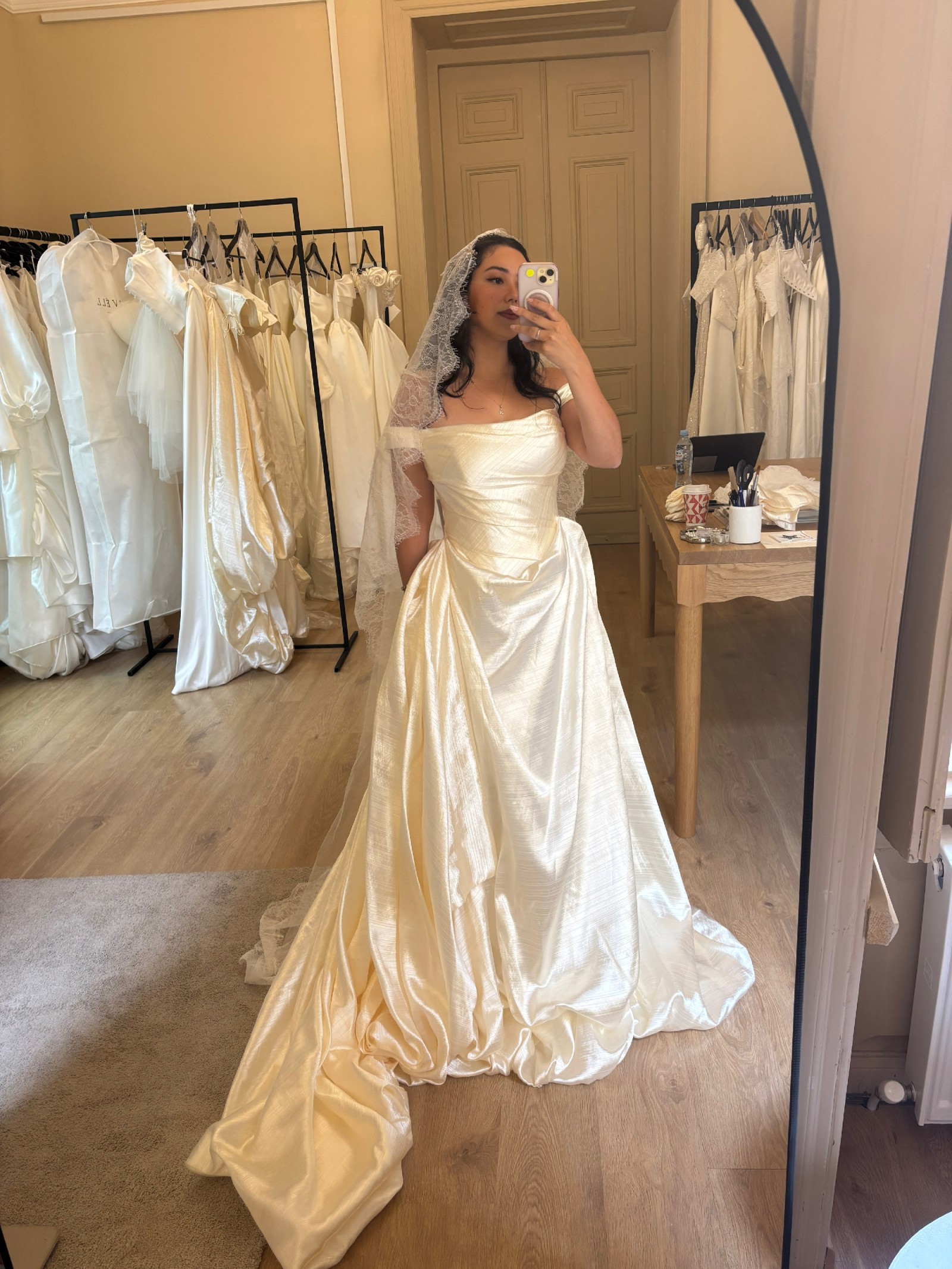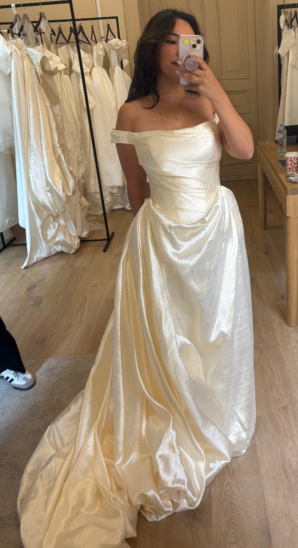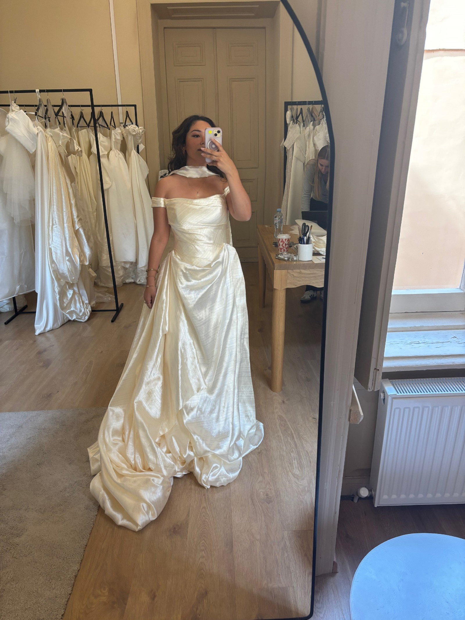 The gown features a low-waisted corset with elegant asymmetrical draping that elongates the figure, paired with a soft A-line skirt with deep pleats at the waist for graceful volume and movement. The puffy skirt flows into a light, romantic train, creating a silhouette that feels both timeless and effortlessly elegant. Also including the neck scarf which I paid separately for is so perfect for this dress. Truly reminiscent of designer dresses like Danielle Frankel, Cinq, and House of Flora but a fraction of the price it is truly a hack of any bride out there looking for a high end look on a lower budget.