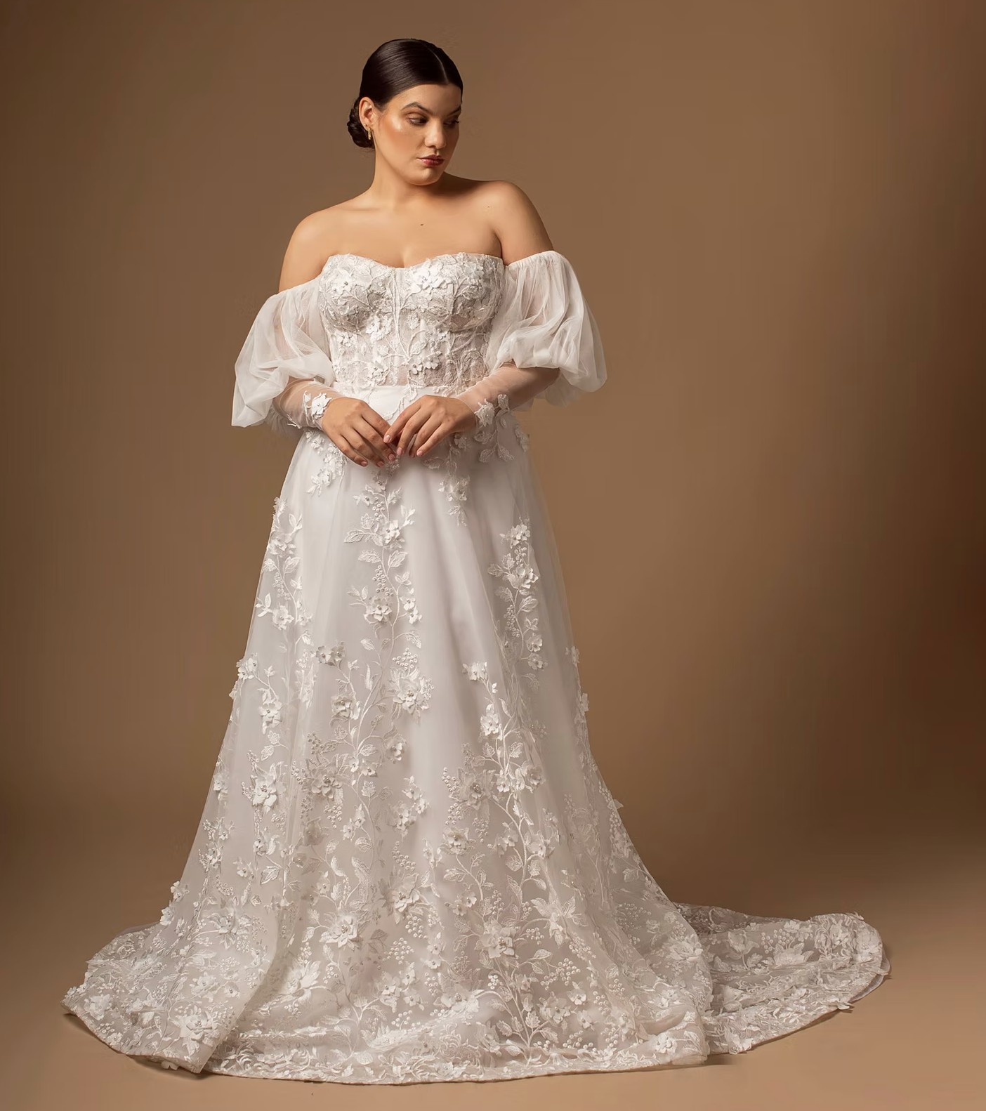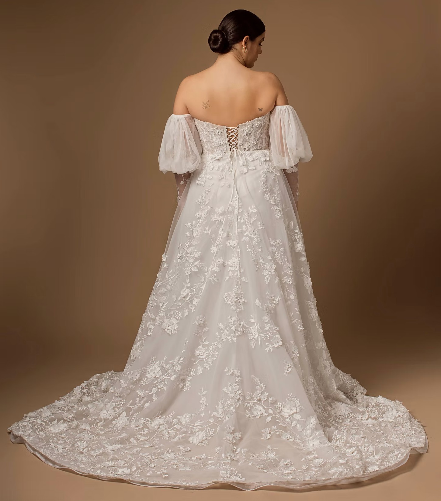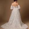 The corset back provides an adjustable fit while also adding a touch of sophistication. This gown features detachable puff sleeves, allowing you to customize your look from ceremony to reception. And let’s not forget the practical yet stylish pockets – a modern touch for a timeless piece.
