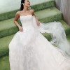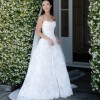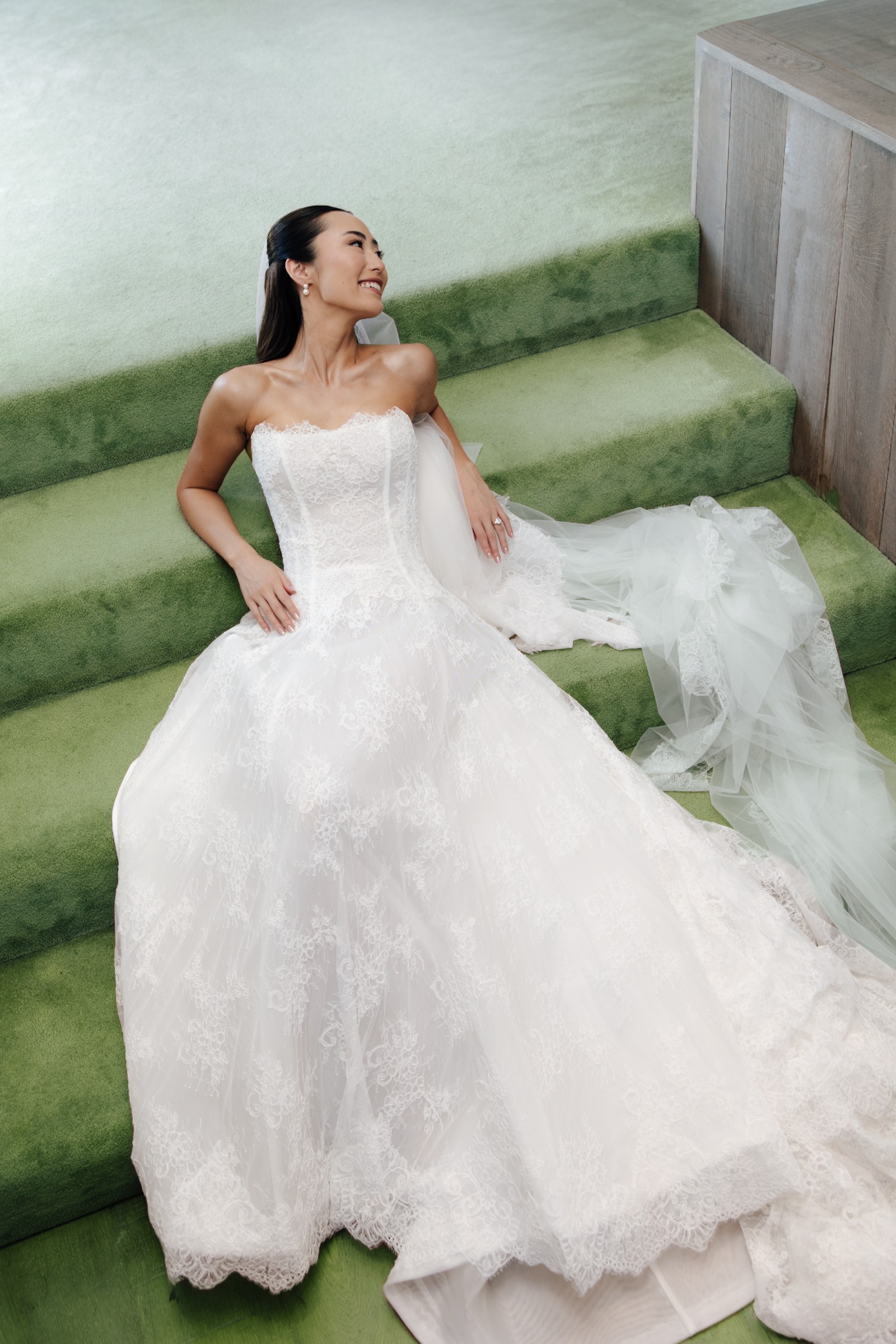 The dress has a classic A-line shape that’s flattering and easy to move in, with a strapless bodice, soft curved neckline, and a low back. There are custom buttons down the back seam for detail, with a hidden zip underneath for ease and comfort.