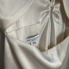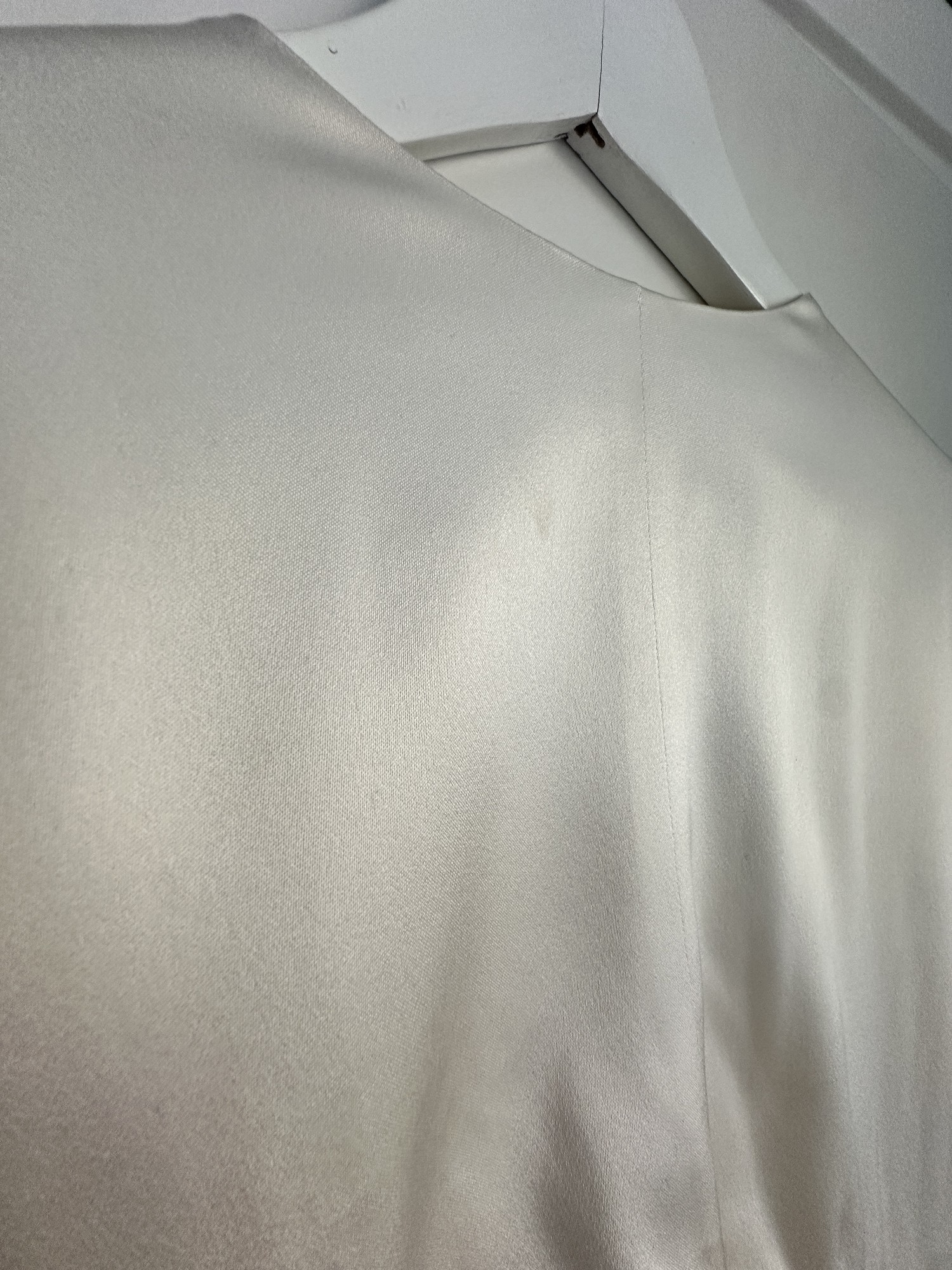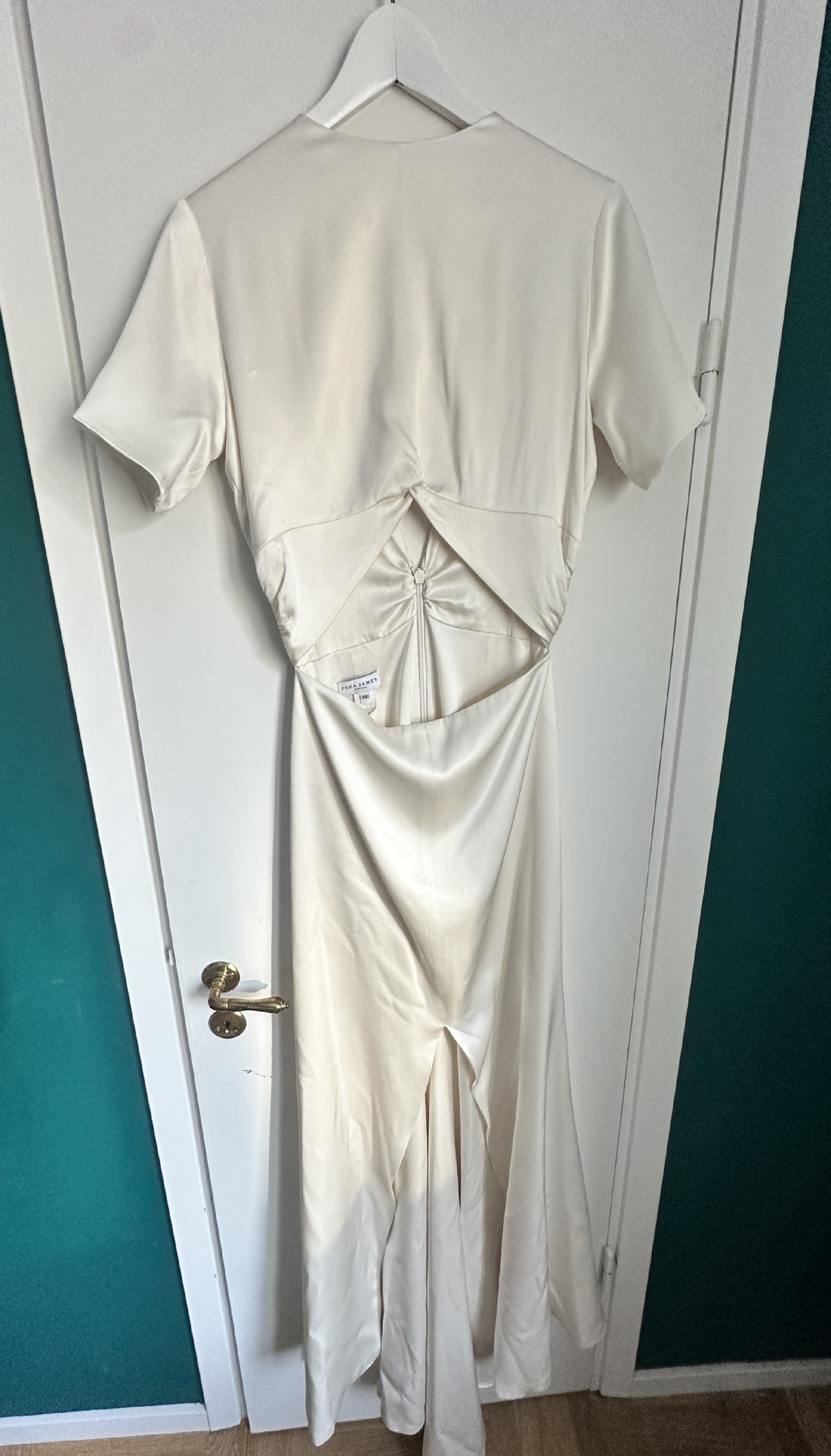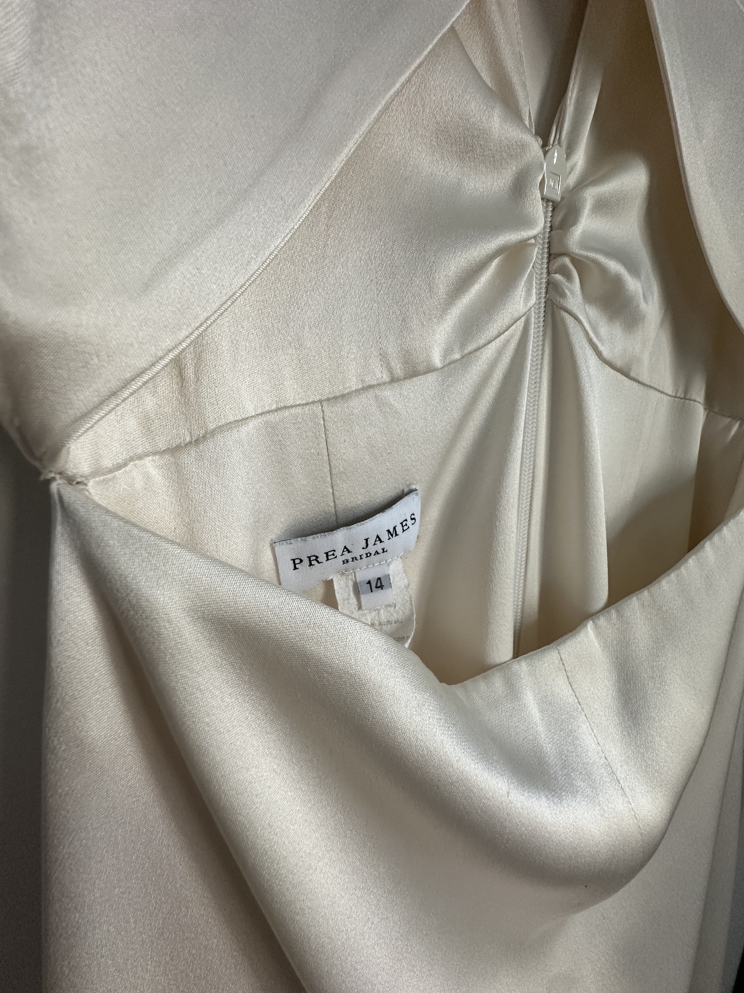 Selling my amazing Prea James Cara Dress. The perfect combination of a modern, minimalistic, stunning yet comfortable dress. Bought it in AU size 14/ EU40 but lost some weight and had it sewn in to fit my measurements, so it's more an AU size 12/EU38. Lenght of the dress was shortened to fit my height + heels (167cm + 5cm heels). My tailor also added a train loop (on the inside of the train, not visble) to hold up the dress when walking. The dress was worn for only a few hours, professionally dry cleaned, and has been carefully stored in a dust cover ever since. It is in excellent condition and truly ready to be worn by its next bride. On close inspection, there are two very minor details to note: a small mark at the very edge of the train (side/back of the dress), which is not visible when worn, and a barely perceptible colour variation on the front that only appears in certain lighting and does not affect the overall look of the dress. The dress photographs beautifully and looks pristine when worn. I’m happy to answer any questions or share additional photos if helpful. Information from Prea James: The Cara Gown is made from a luxurious heavy weight 100% silk satin. The top of the dress features a modern high neckline, with a deep V back and a fitted short sleeve. The twist front is created using a Japanese form of pattern making. Loop The top attaches to the skirt along the back waist to give the look of a top and skirt with the practicality of dress. The skirt sits high on the waist and the cutout at front reveals only a slither of skin. The centre front seam and a split that starts from just above the knee. There is little extra flare in the skirt that gives a beautiful flowing silhouette and leads to a 30cm train. The beautiful lustre of the silk satin gives this relaxed wedding gown a luxury feel and look