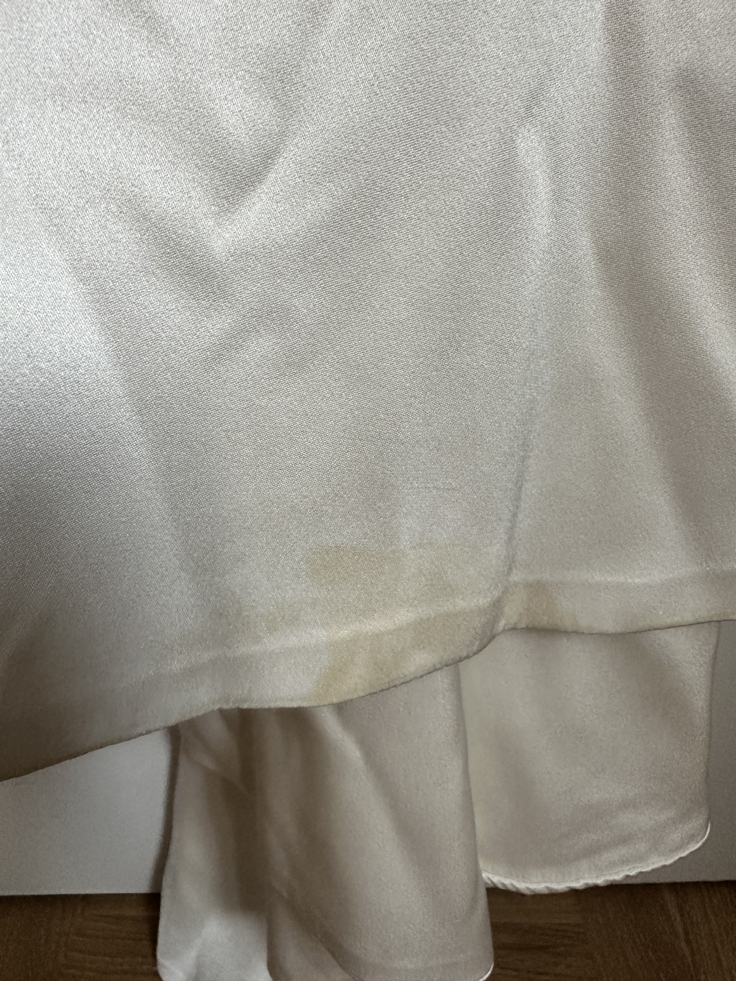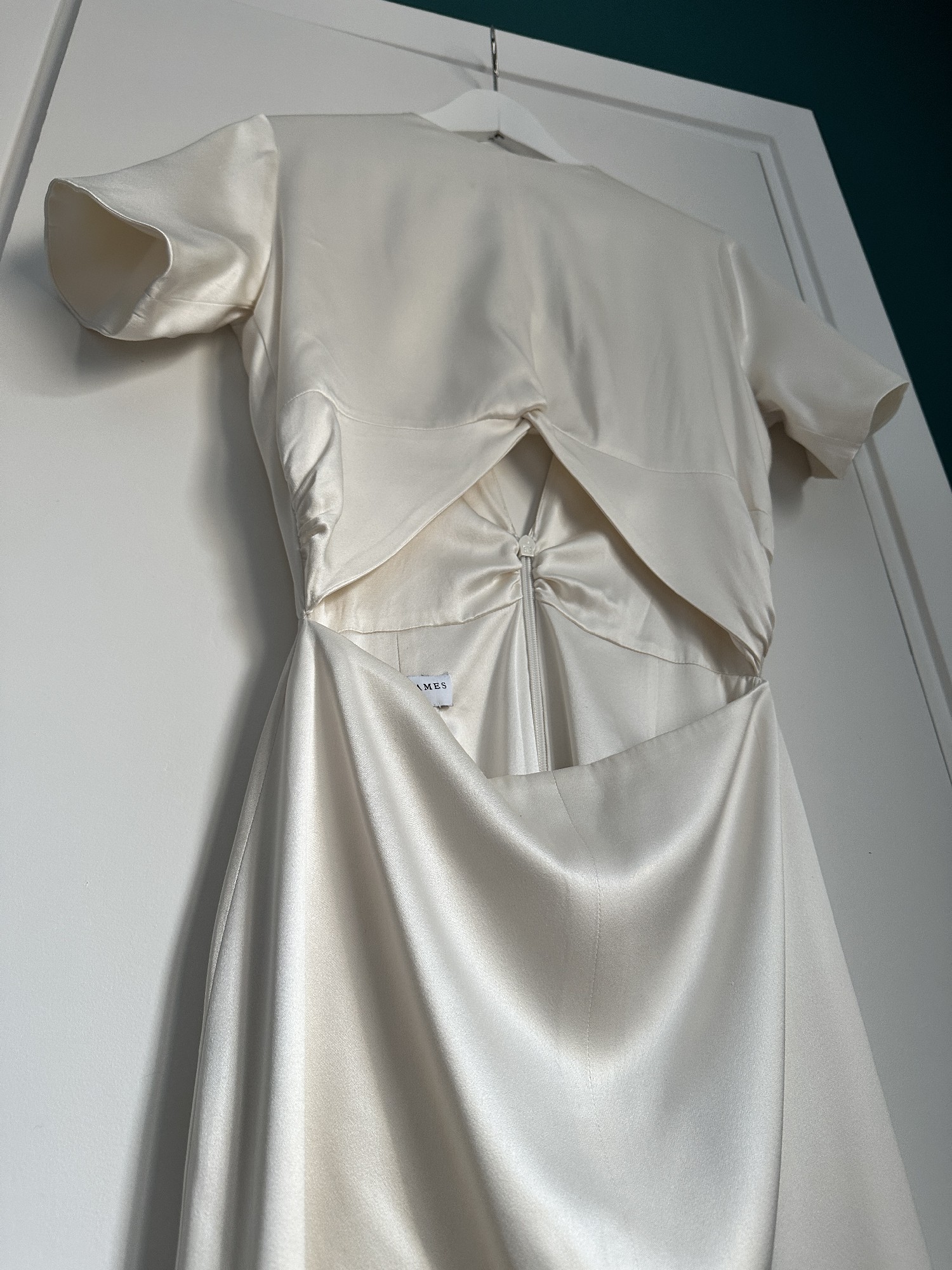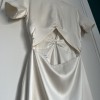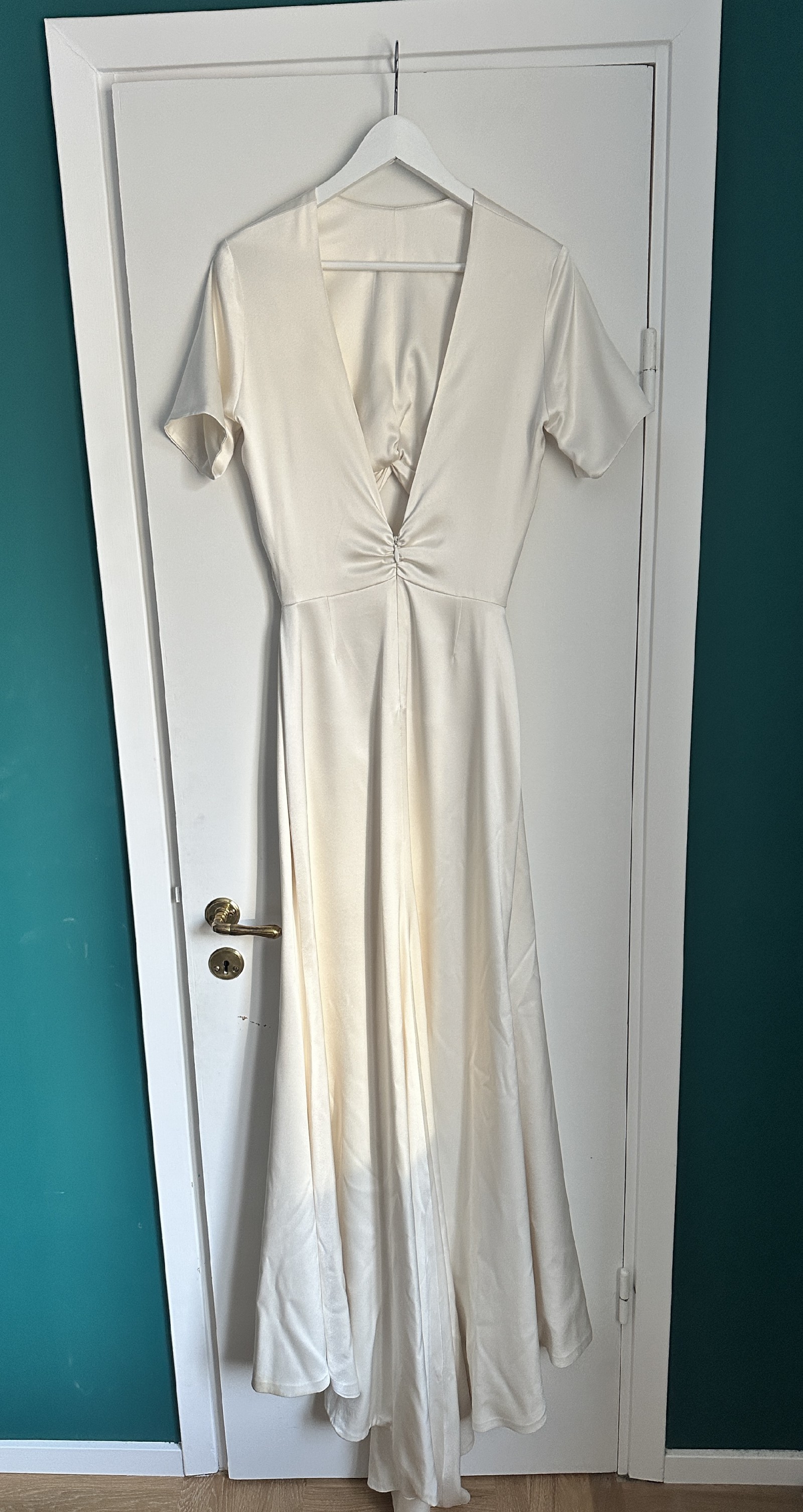 Selling my amazing Prea James Cara Dress. The perfect combination of a modern, minimalistic, stunning yet comfortable dress. Bought it in AU size 14/ EU40 but lost some weight and had it sewn in to fit my measurements, so it's more an AU size 12/EU38. Lenght of the dress was shortened to fit my height + heels (167cm + 5cm heels). My tailor also added a train loop (on the inside of the train, not visble) to hold up the dress when walking. The dress was worn for only a few hours, professionally dry cleaned, and has been carefully stored in a dust cover ever since. It is in excellent condition and truly ready to be worn by its next bride. On close inspection, there are two very minor details to note: a small mark at the very edge of the train (side/back of the dress), which is not visible when worn, and a barely perceptible colour variation on the front that only appears in certain lighting and does not affect the overall look of the dress. The dress photographs beautifully and looks pristine when worn. I’m happy to answer any questions or share additional photos if helpful. Information from Prea James: The Cara Gown is made from a luxurious heavy weight 100% silk satin. The top of the dress features a modern high neckline, with a deep V back and a fitted short sleeve. The twist front is created using a Japanese form of pattern making. Loop The top attaches to the skirt along the back waist to give the look of a top and skirt with the practicality of dress. The skirt sits high on the waist and the cutout at front reveals only a slither of skin. The centre front seam and a split that starts from just above the knee. There is little extra flare in the skirt that gives a beautiful flowing silhouette and leads to a 30cm train. The beautiful lustre of the silk satin gives this relaxed wedding gown a luxury feel and look