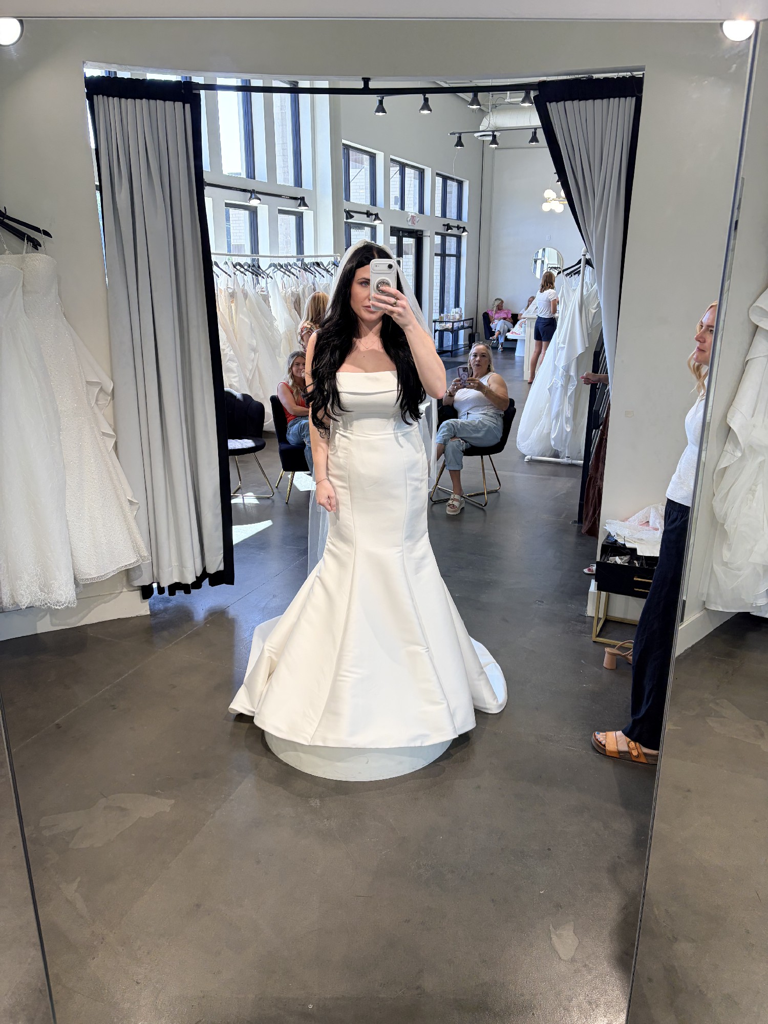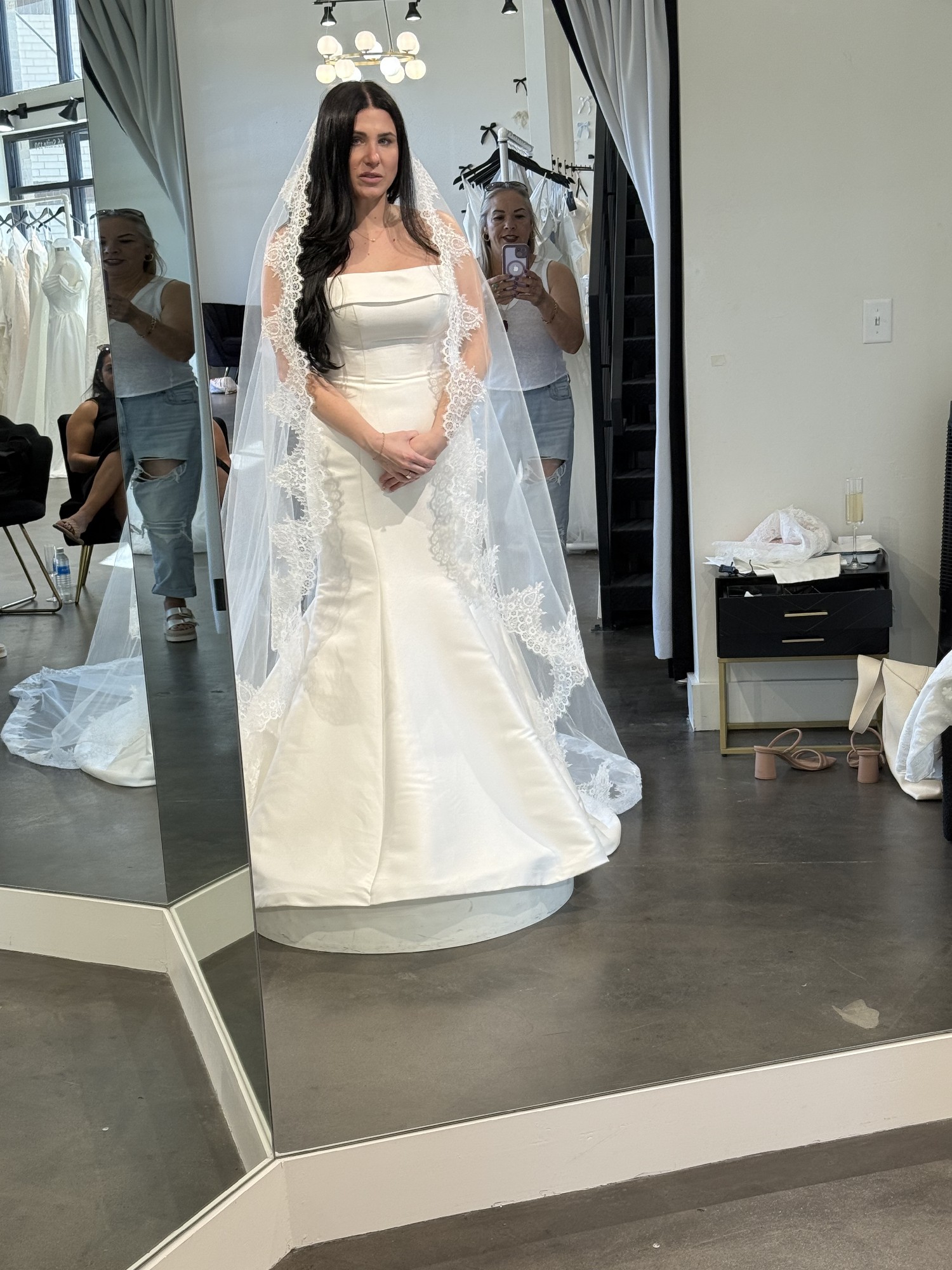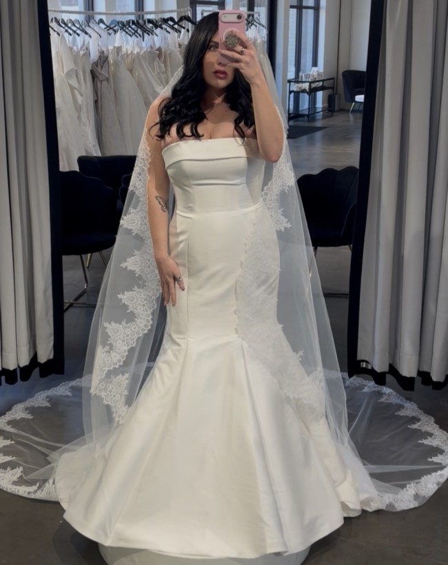 Beautiful Stella York 7099 fit-and-flare wedding dress with a clean, straight neckline and strapless design. It’s incredibly flattering, fits great, and is super comfortable to move in.