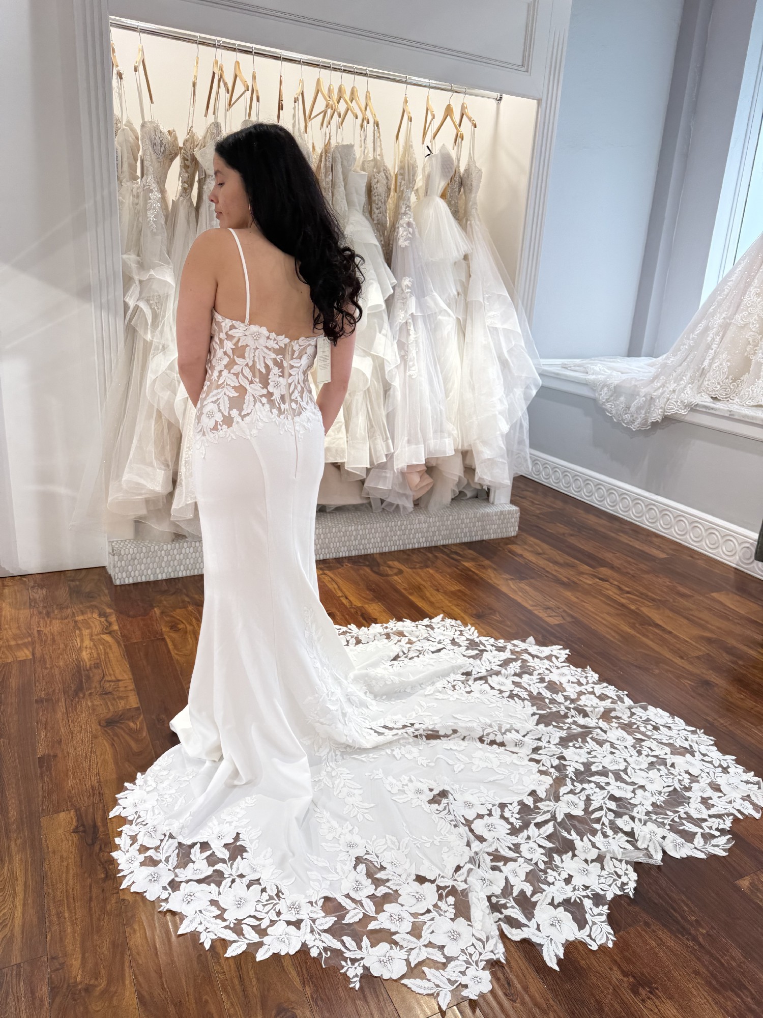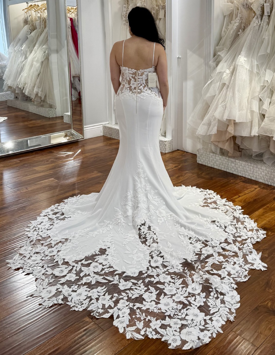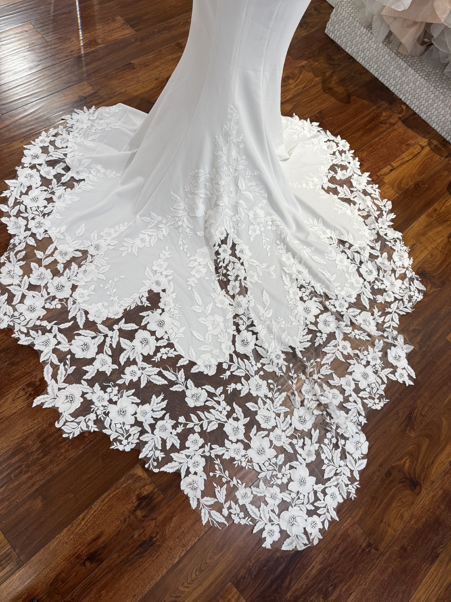 The unlined illusion lace back adds a romantic touch, while the gown finishes with a breathtaking 89-inch scalloped lace train for a true statement look. Perfect for the modern, minimalist, romantic bride.