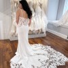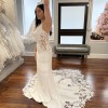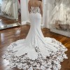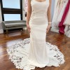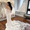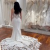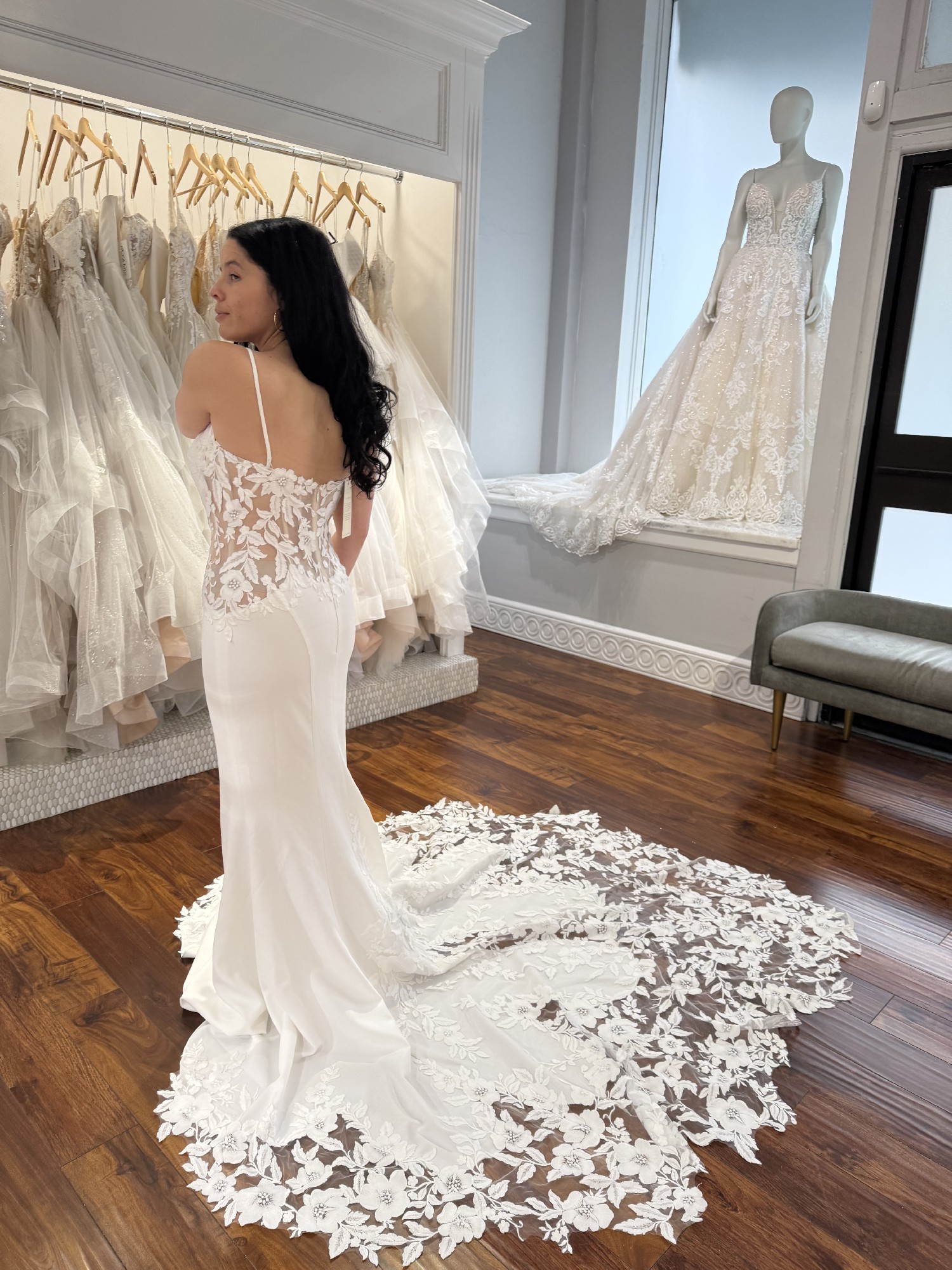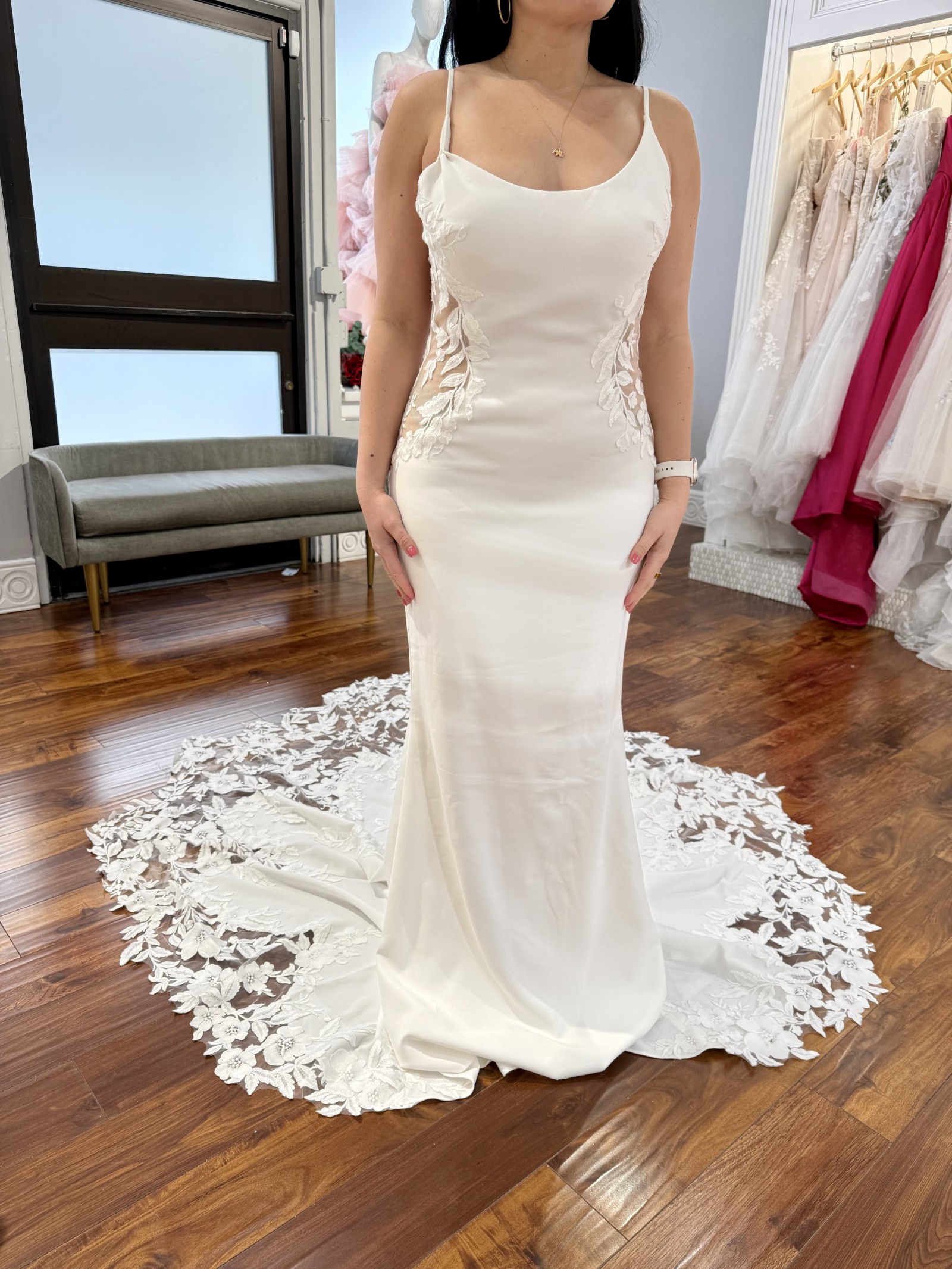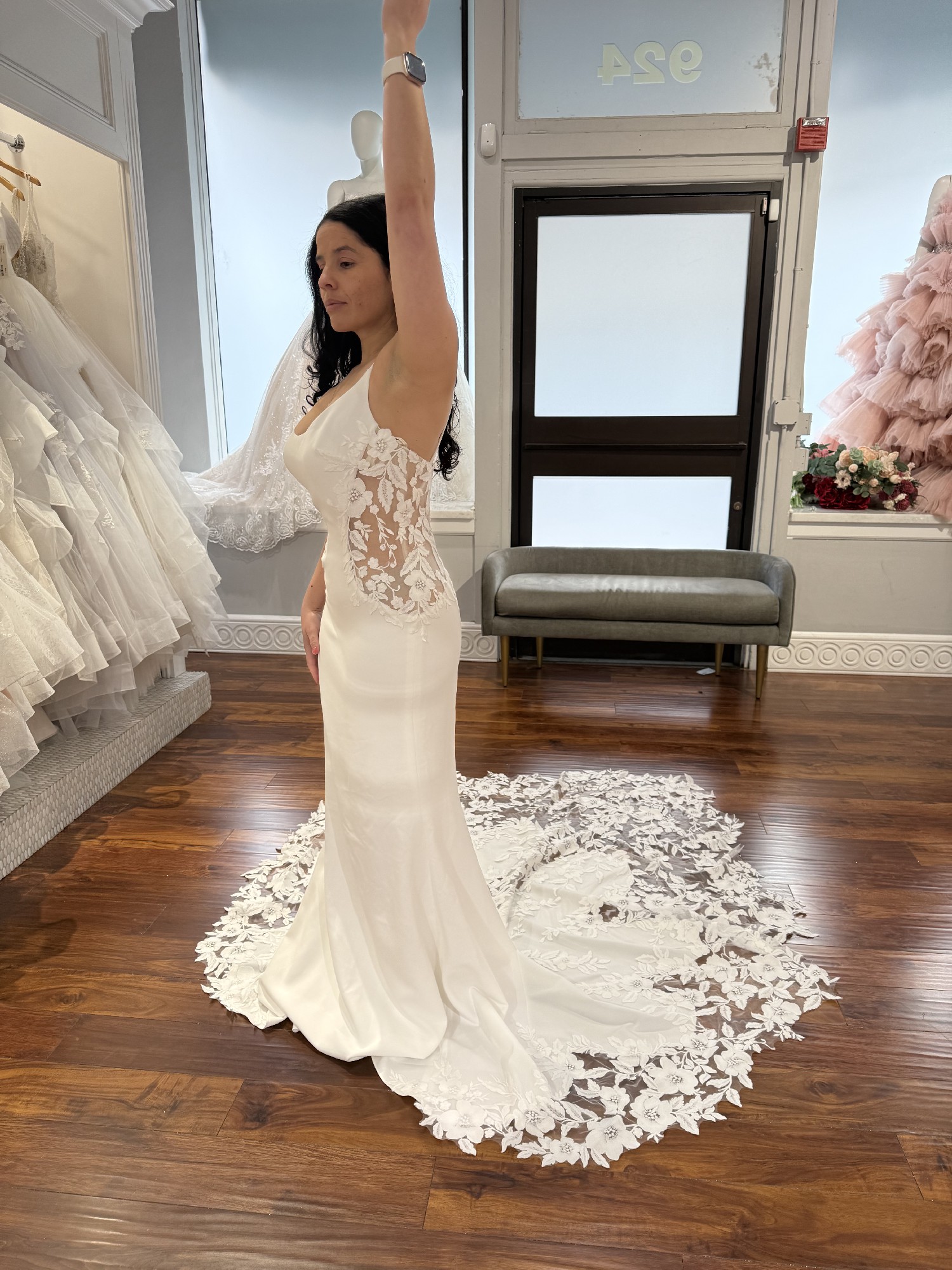 The unlined illusion lace back adds a romantic touch, while the gown finishes with a breathtaking 89-inch scalloped lace train for a true statement look. Perfect for the modern, minimalist, romantic bride.