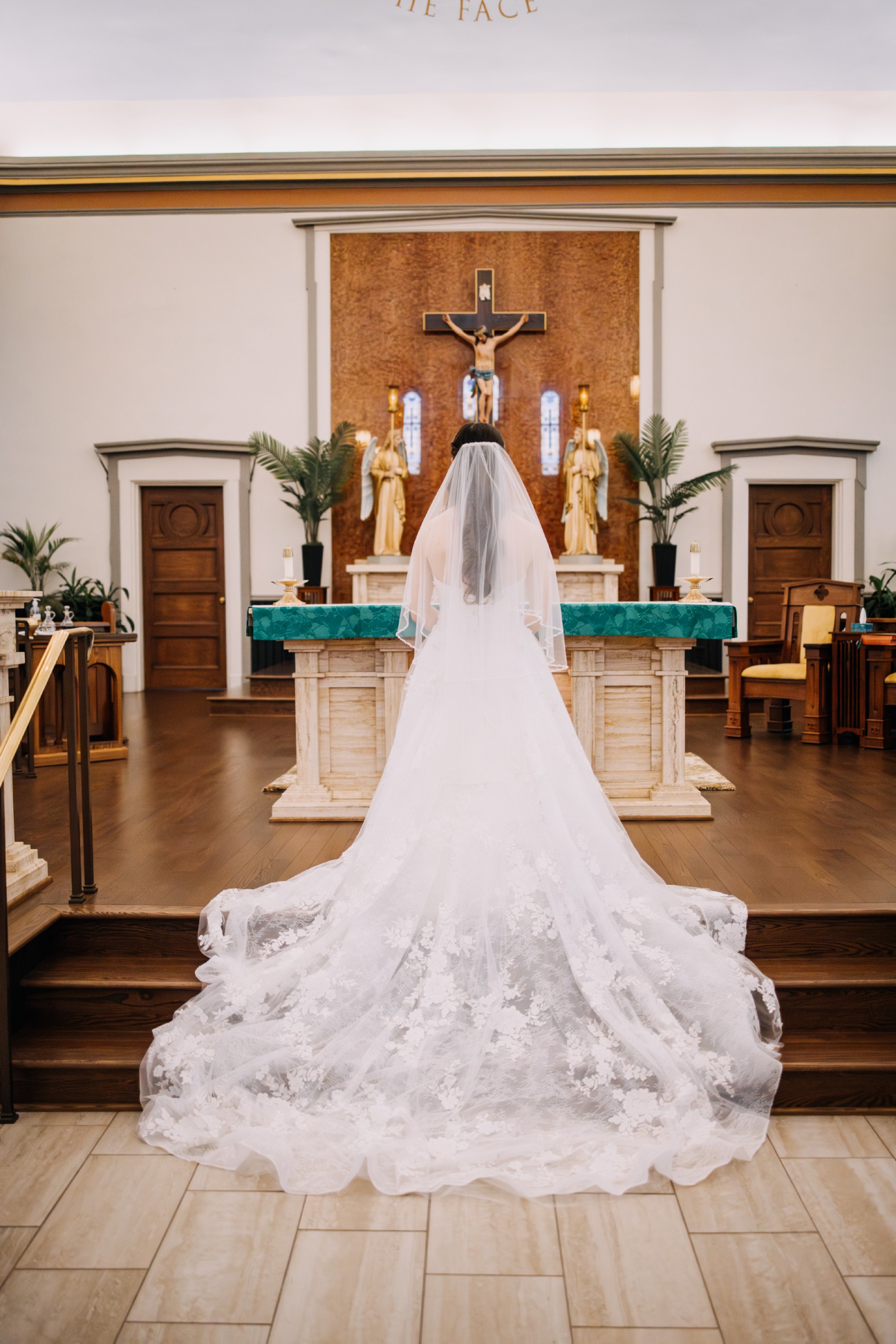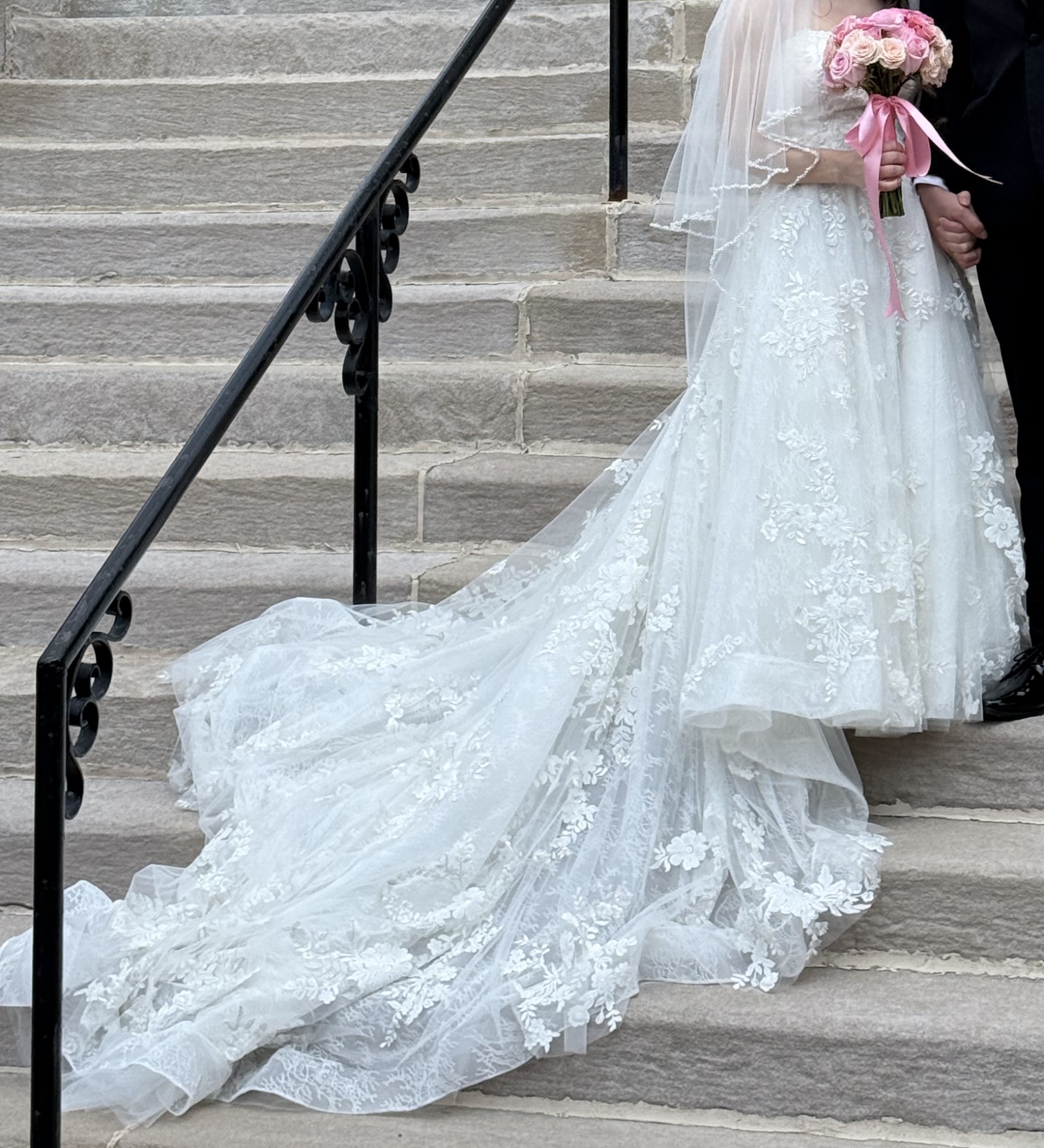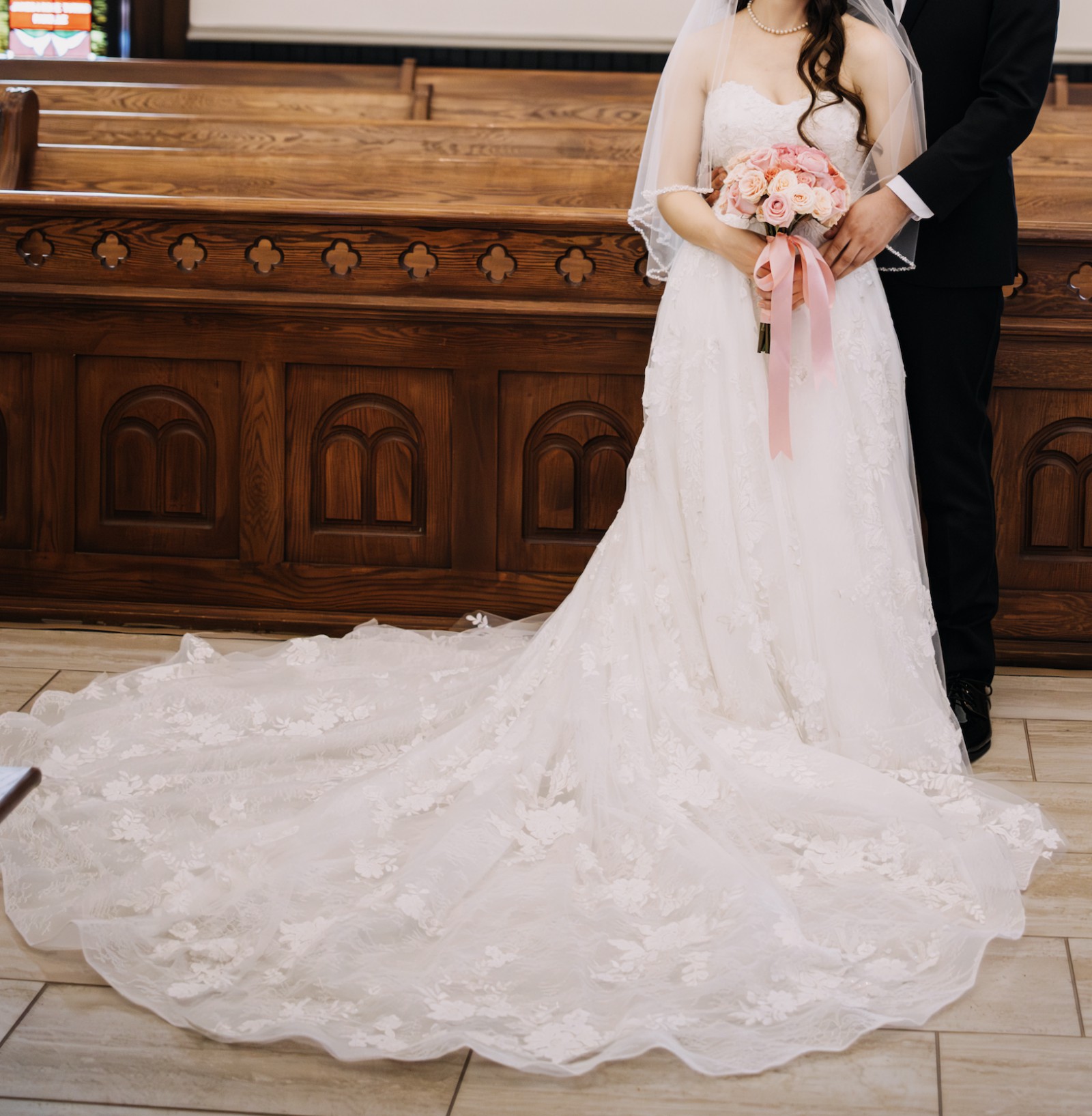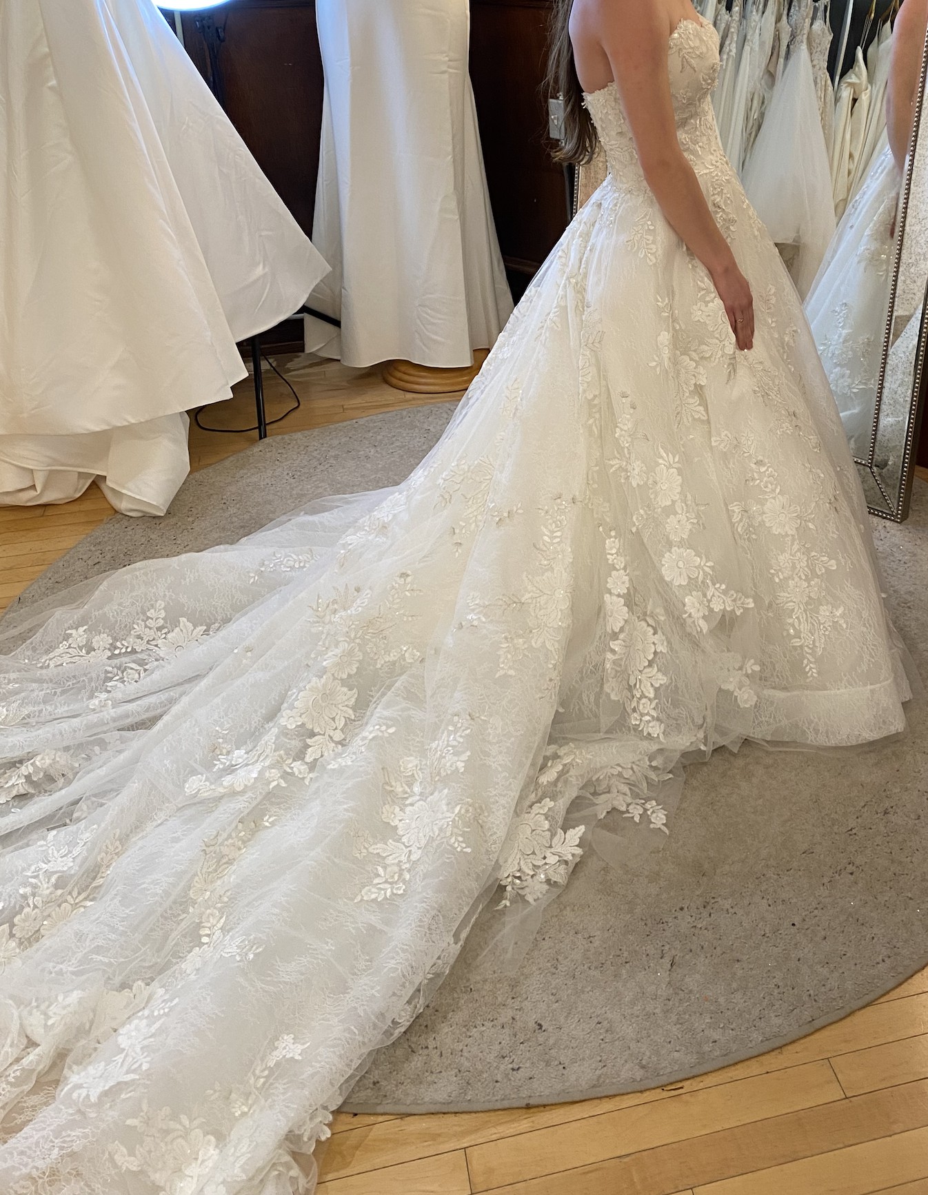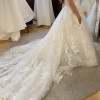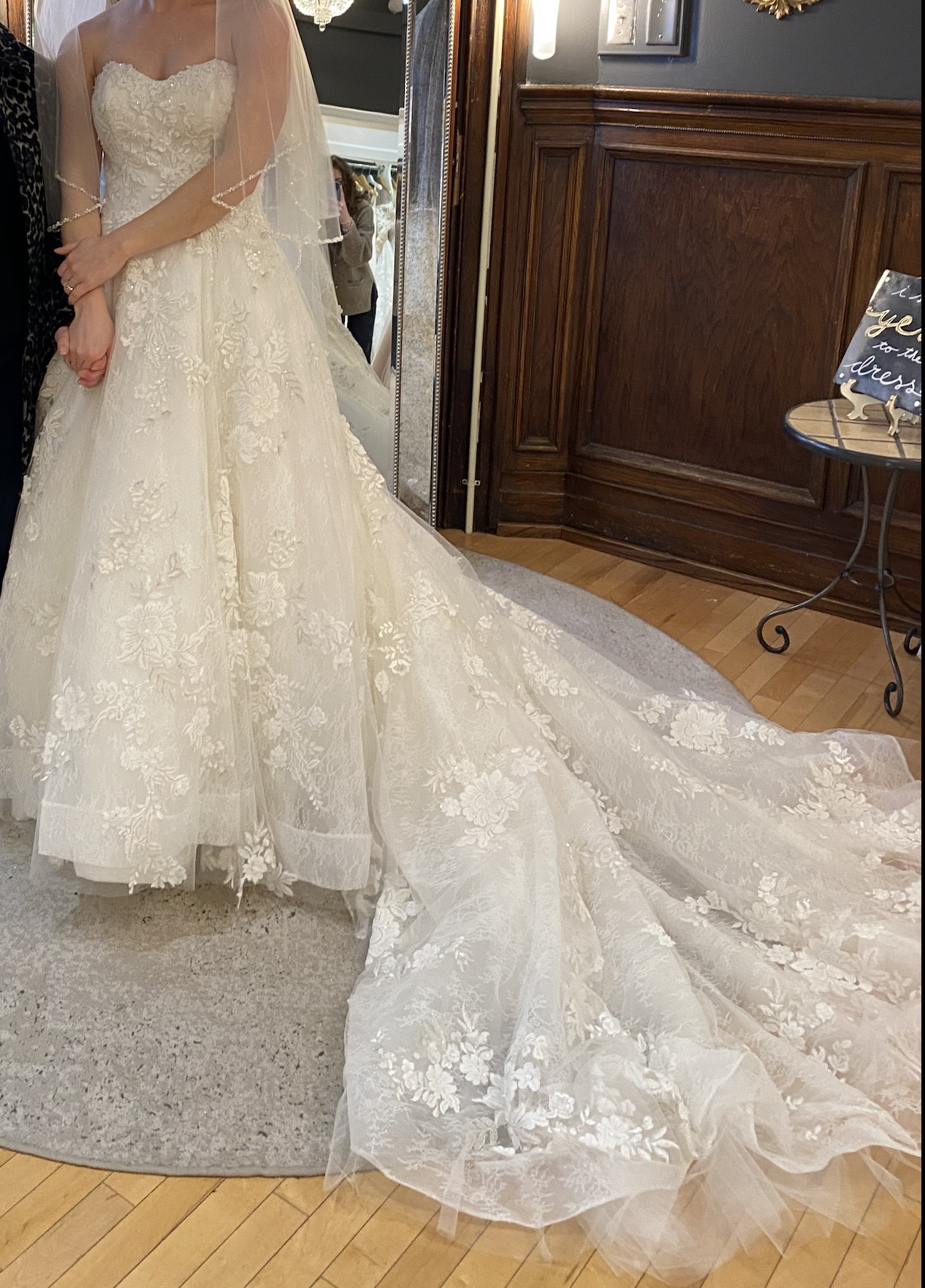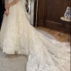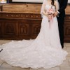 A standout feature of this dress is that it has a full, 85-inch train perfect for a cathedral, a garden, or any other formal setting. The dress already has subtle loops/buttons already built in to bustle the dress so that it can be worn comfortably during a reception. Hemmed for a 5'3" bride wearing flats — perfect for petite brides!