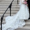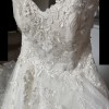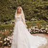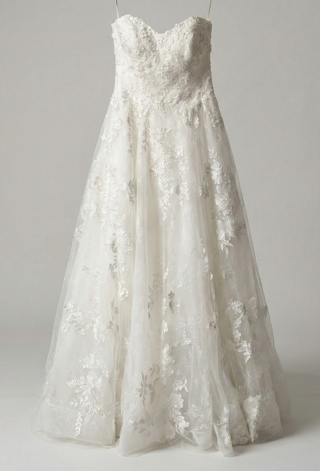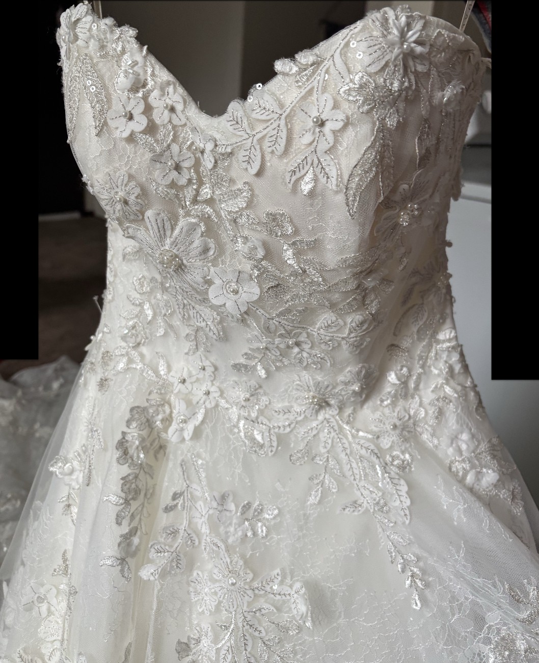 The dress has rich floral details with 3D floral appliqués, soft beading, and pearly accents on top of multiple layers of floral Chantilly lace and tulle. The bodice has a natural waist and snug fit with built-in bra cups to support the bust.