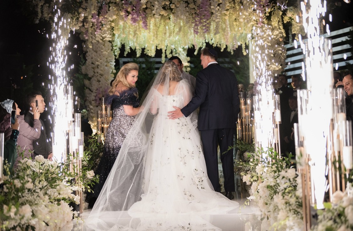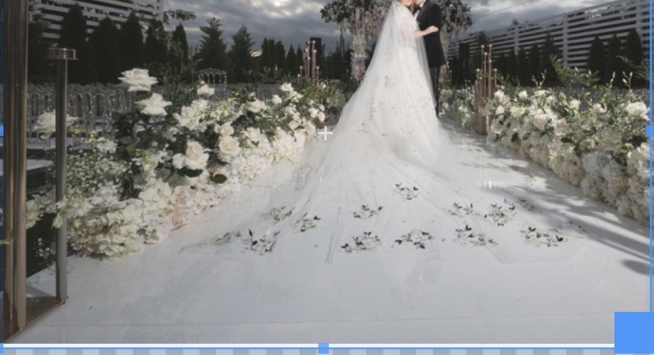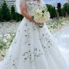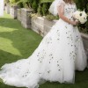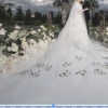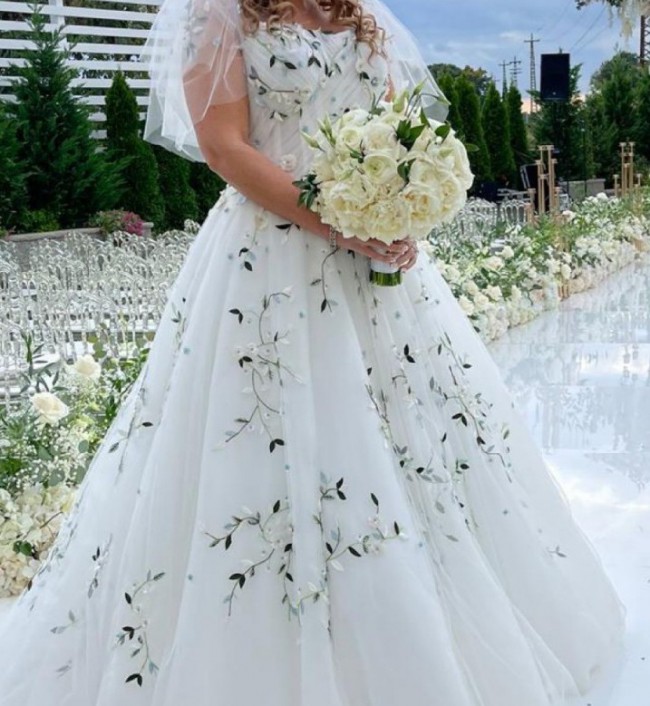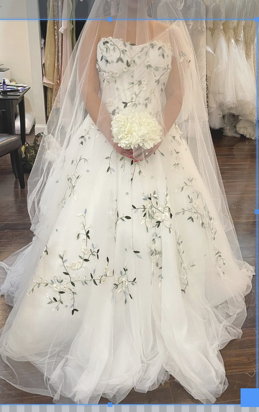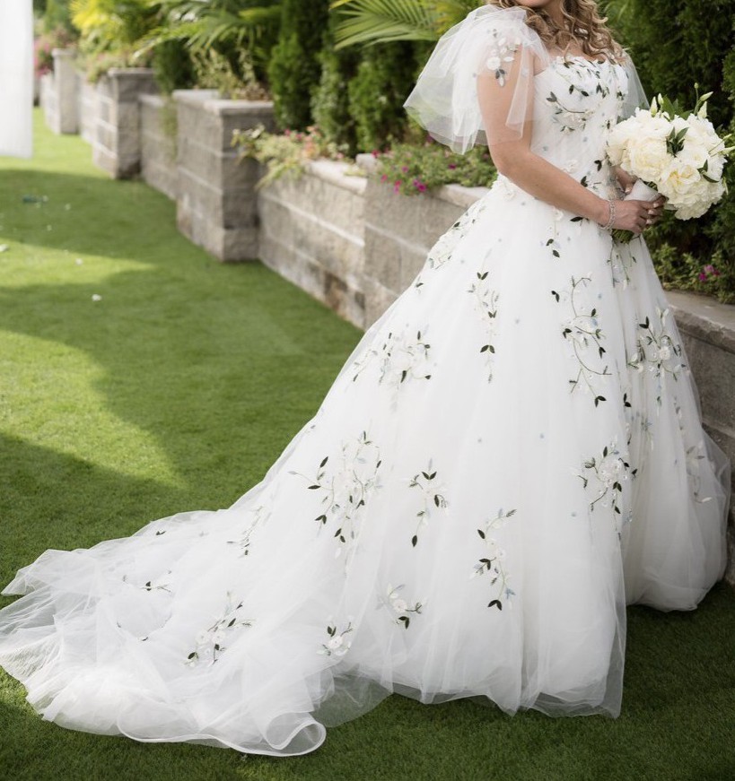 This gown is an actual showstopper!!! It’s an exact copy of the Monique Lhuillier gown we saw in the window of a very upscale wedding salon. It was $15,000 there. I found a custom wedding gown designer who worked for ML for many years as a head designer before she went out on her own and used the exact same beaders and fabrics that ML used. I paid $8000 for the gown plus $2,000 for the matching veil. The flutter sleeves are attached but you definitely can easily remove.