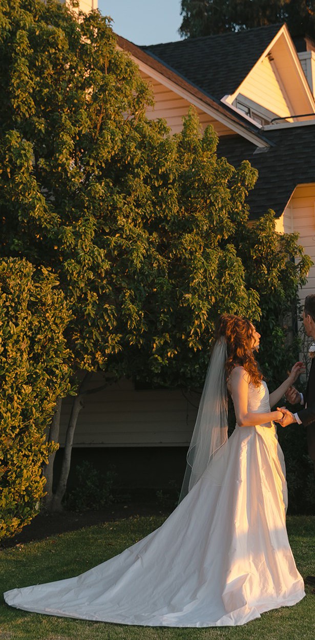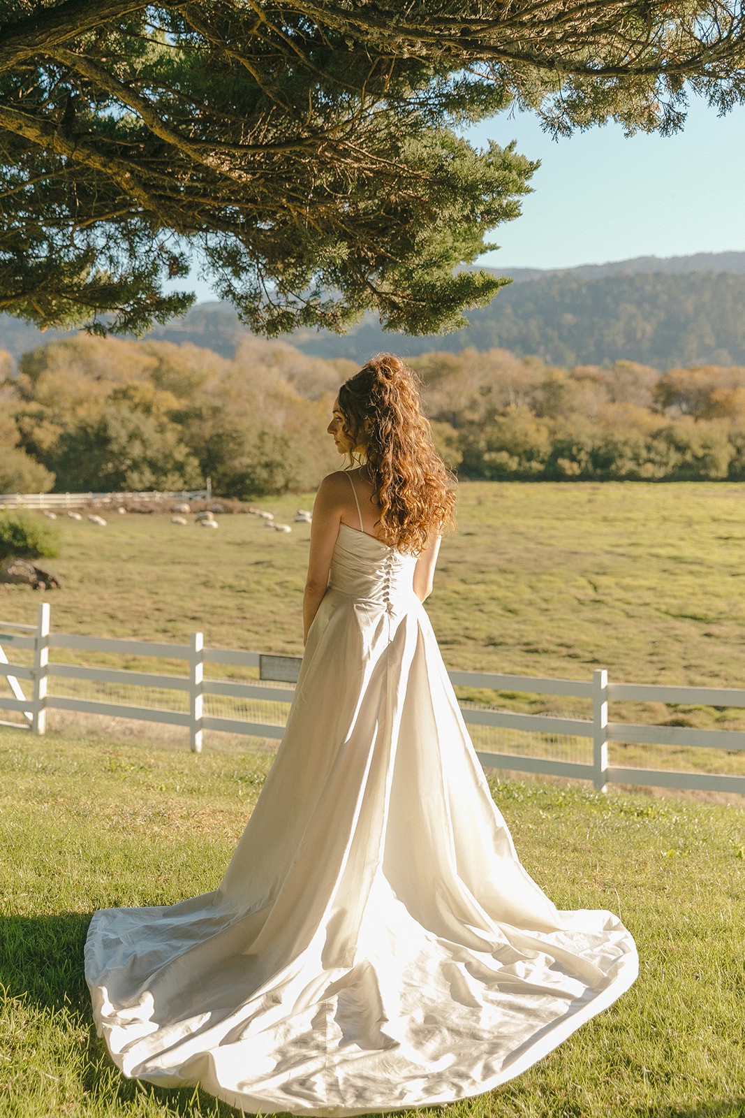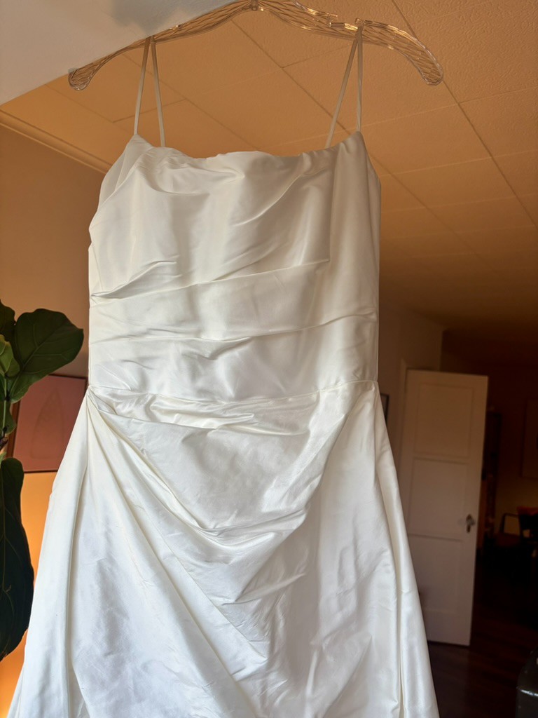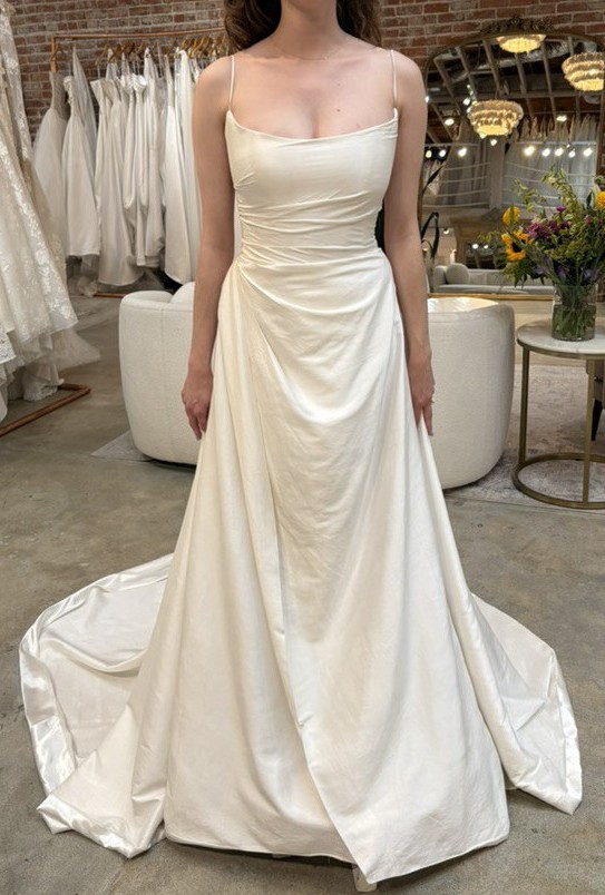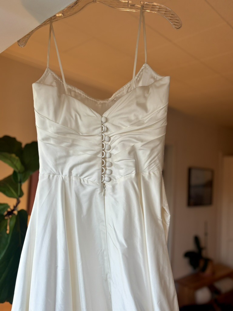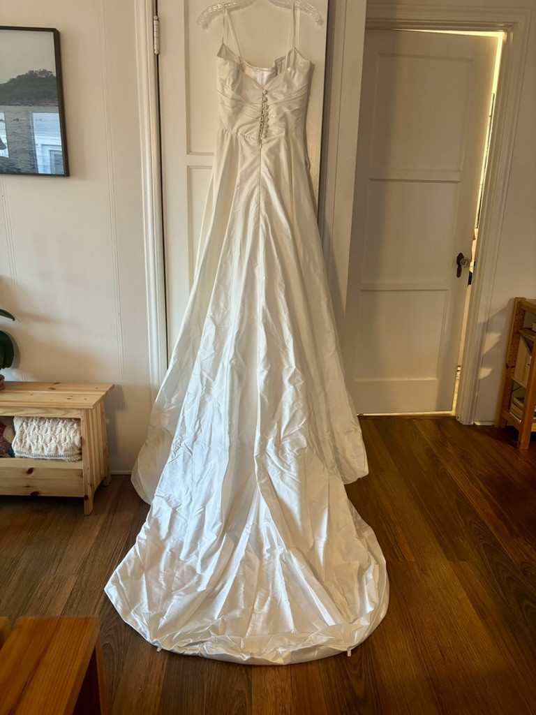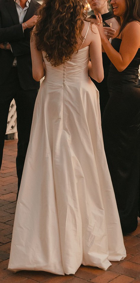 Gorgeous Emma dress by Karen Willis Holmes. This dress is a beautiful ivory and very comfortable. The top has corset boning built in, and a hidden bustle has been added (buttons along the inside that makes the dress look one length when bustled - you can see it in the last picture!) I'm 5'6 and wore 3 inch heels.