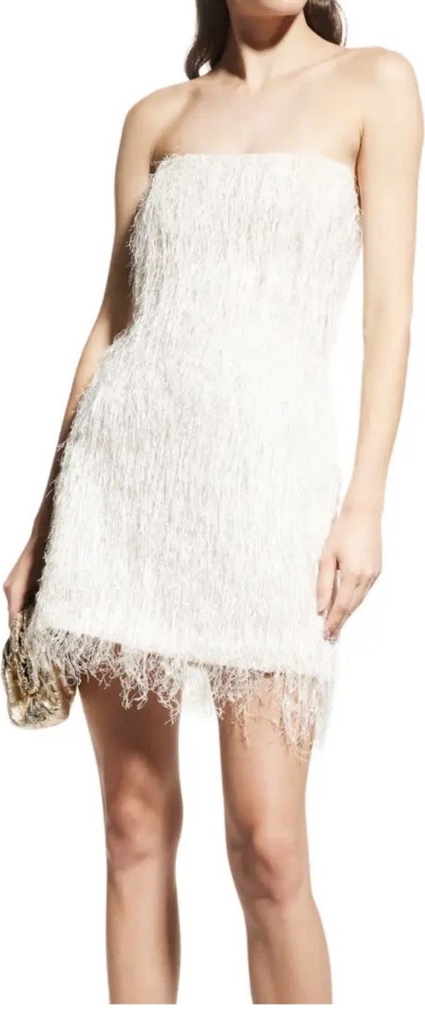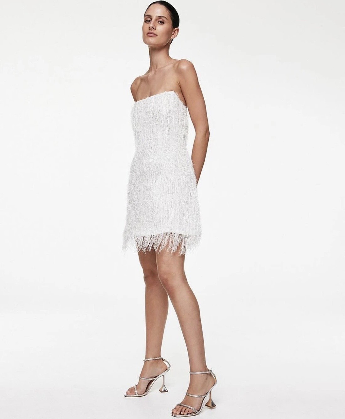 The curve neckline beautifully accentuates the décolletage, while the low back adds a touch of sensuality. Strapless yet secure, this dress allows for ease of movement as you twirl on the dance floor. Above-the-knee length enhances the playful nature of the dress, making it an ideal choice for a chic city wedding or a stylish reception.