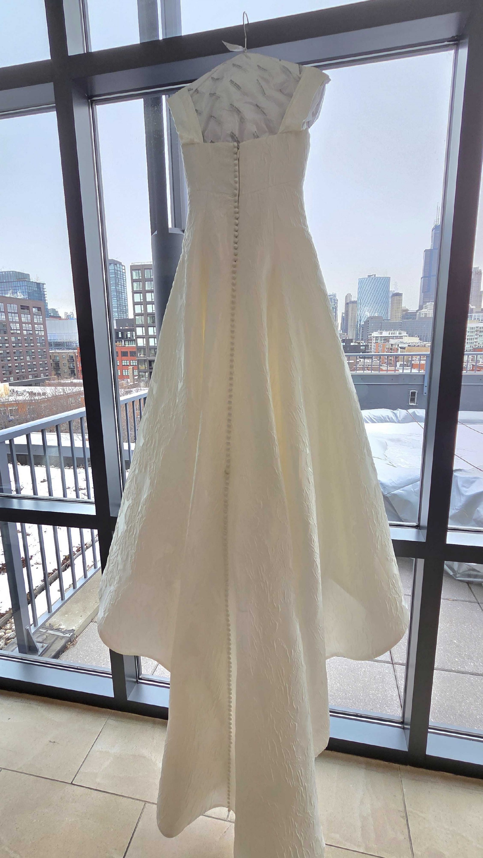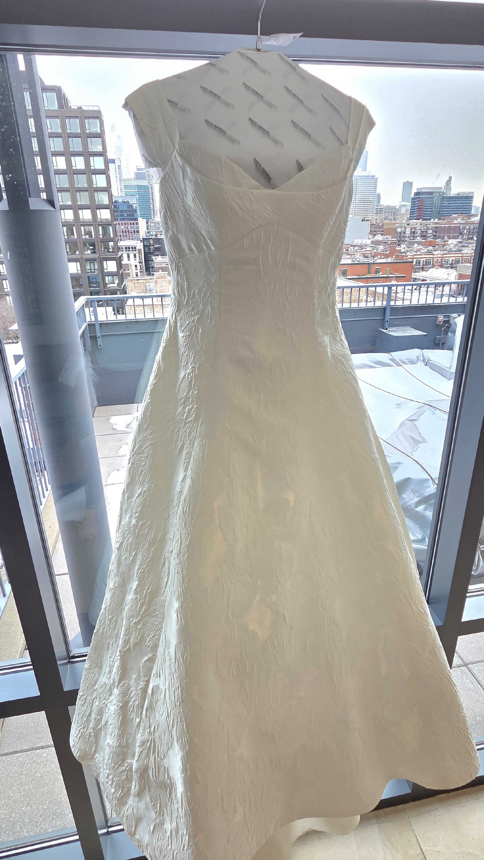 Dress has been dry cleaned and is pristine - no stains or presence of prior wear. The fabric is stunning and does not show wrinkles which made sitting throughout the day more relaxing!