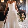Strapless fitted gown with snoop neckline and delicate tulle draping. Crafted from signature crepe, and includes a corset bodice, thigh-high slit, and sweeping train.