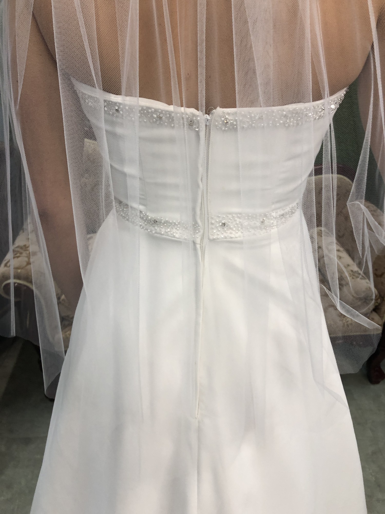 There may be a few loose threads/beads in places, loose elastic button loops, or very light marks as samples (easily remedied during your alterations if noticed). Missing som of the hooks & eyes and on the girdle. Hook and Eye have marked rust inside the gown (easily cleaned.) It is a sample length. All bridal gowns need alterations for that custom fit; whether you're 4 foot 10 or 5 foot 8, this gown can be hemmed to your length.