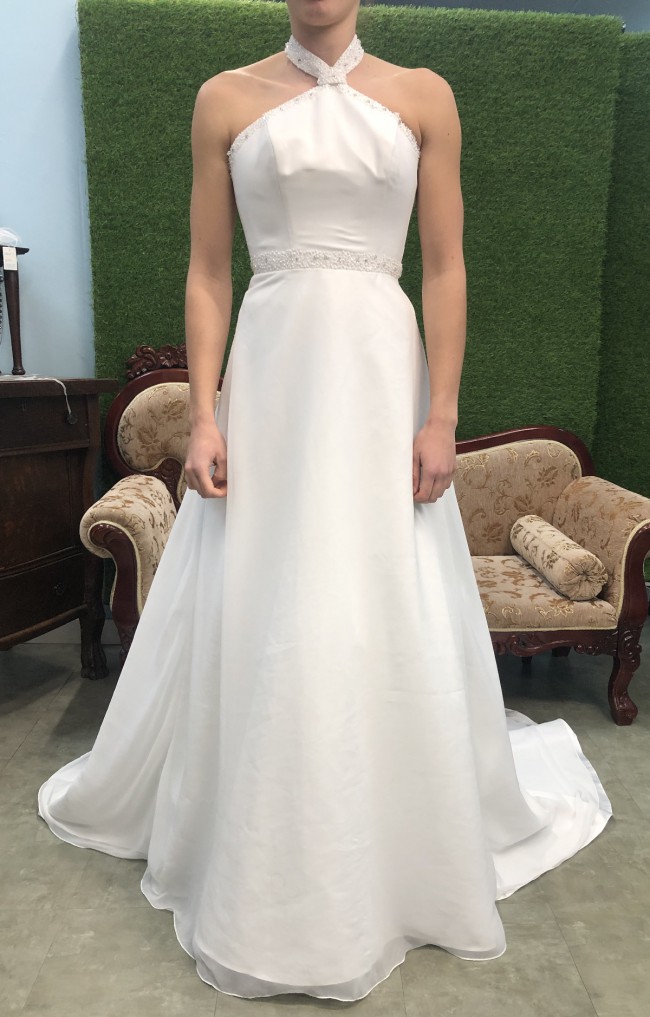 Pictures definitely don't this beautiful beachy white Chiffon gown justice! I love the Beaded Choker Halter (So flattering and unique) Super sexy, sophisticated Aline bridal gown that just hugs the curves in all of the right places! The Blingy cummerbund waistband is cinched & super flattering. So unique & unexpected! This classic gown would be brilliant for any beach or destination cruise wedding, country or barn or garden wedding. Ask your seamstress about adding POCKETS and even a LEG SLIT!!