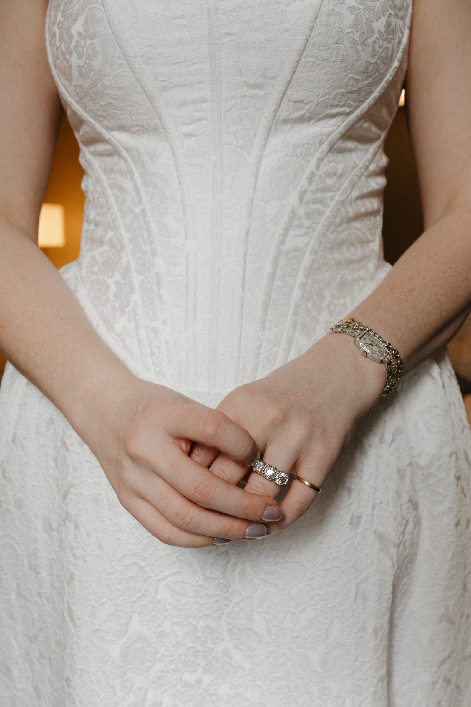 - Hem shortened, train shortened, straps shortened, waist taken in, bust cups added, bustle added