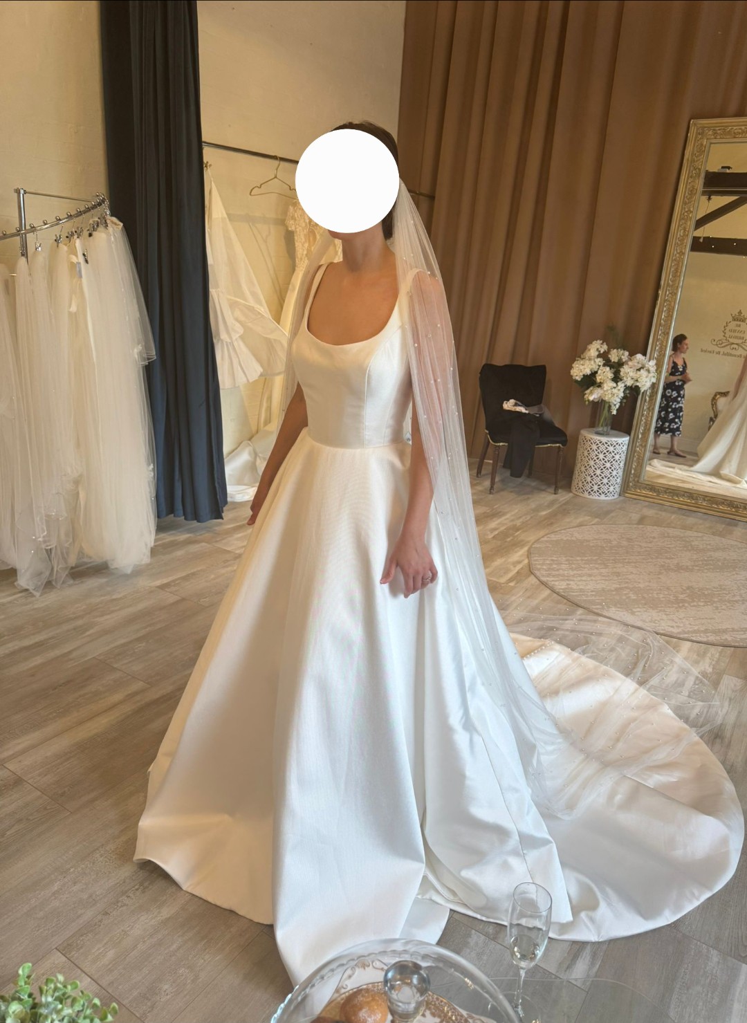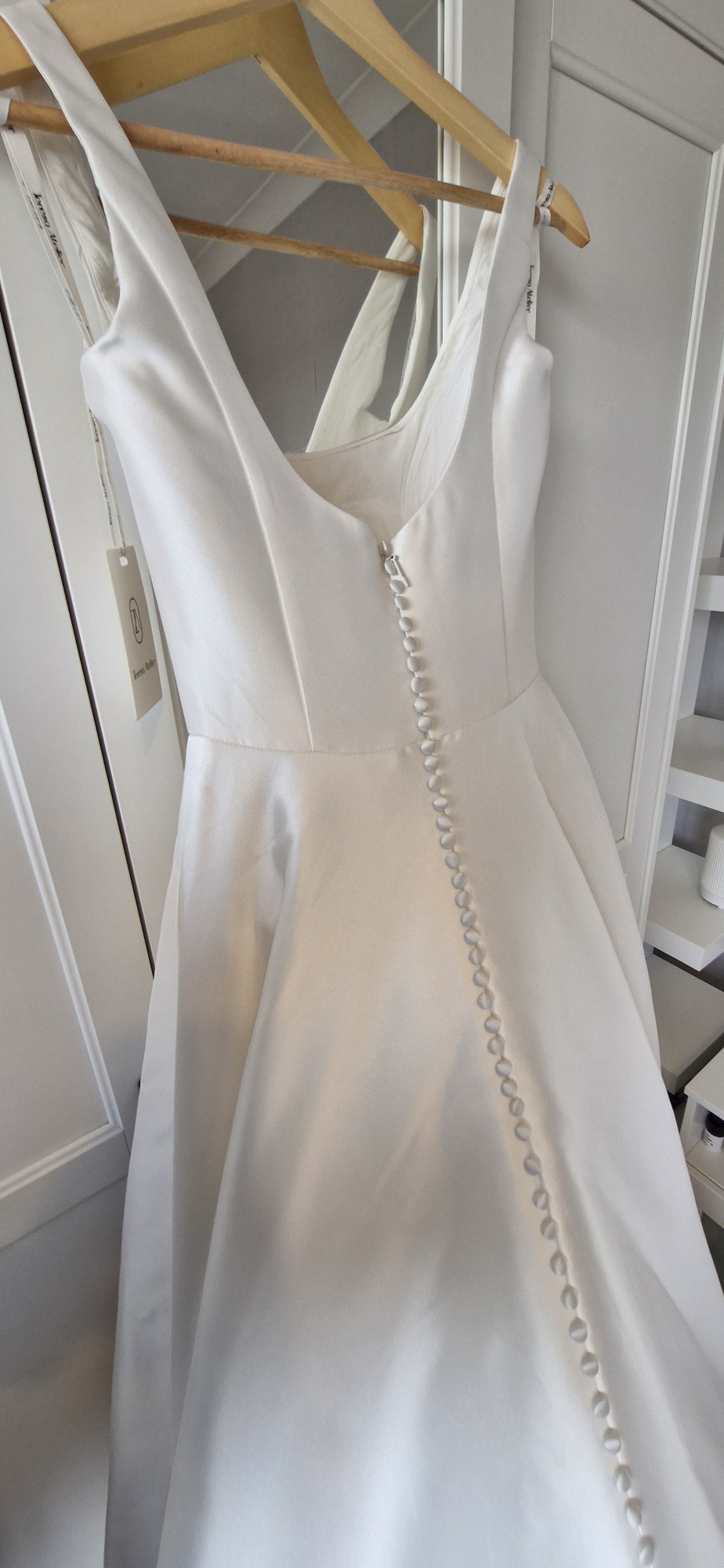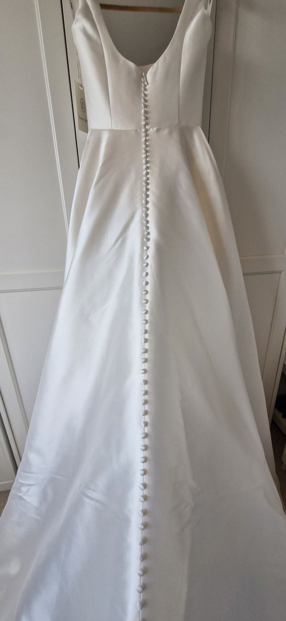 This dress has never been worn other than when trying on once. I purchased this dress and unfortunately just didnt think it was the one for me when trying on for the second time, mainly due to my personal shape. It is in perfect condition, only out of the bag twice. This is a zip up dress, but zip cannot be seen due to button detail. It is a beautiful, simple and classic mikado dress that I think for the right bride will look incredible.