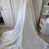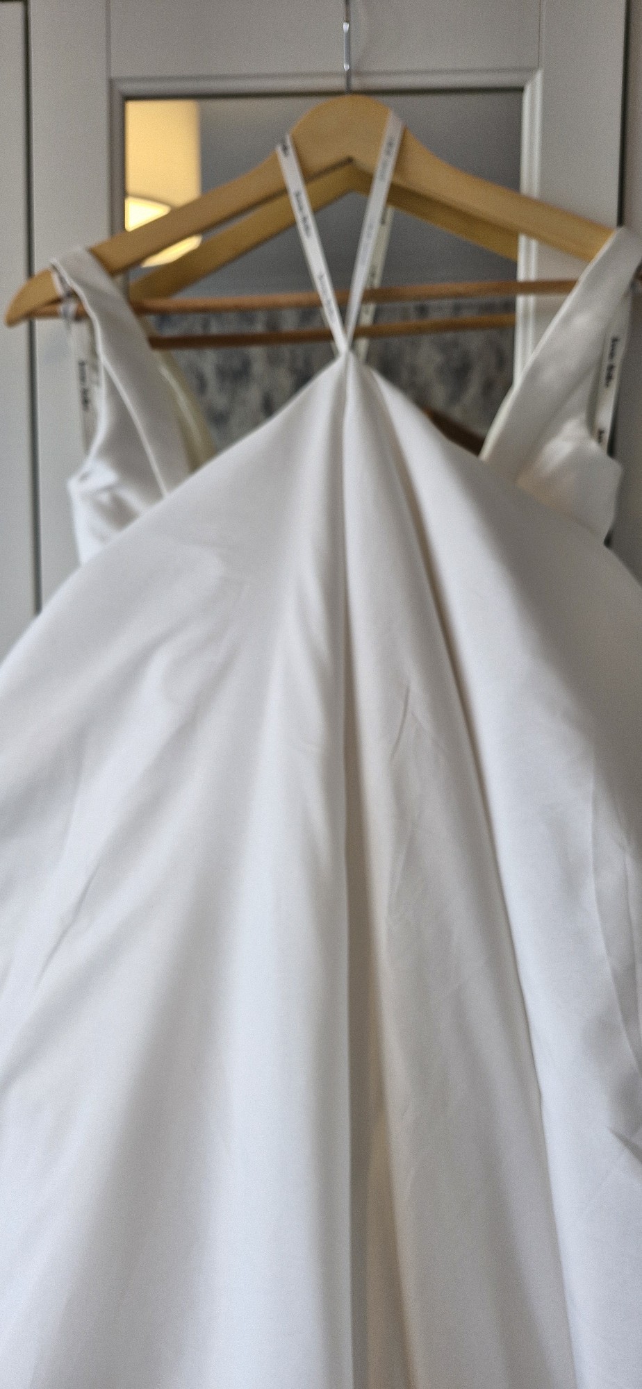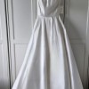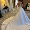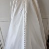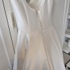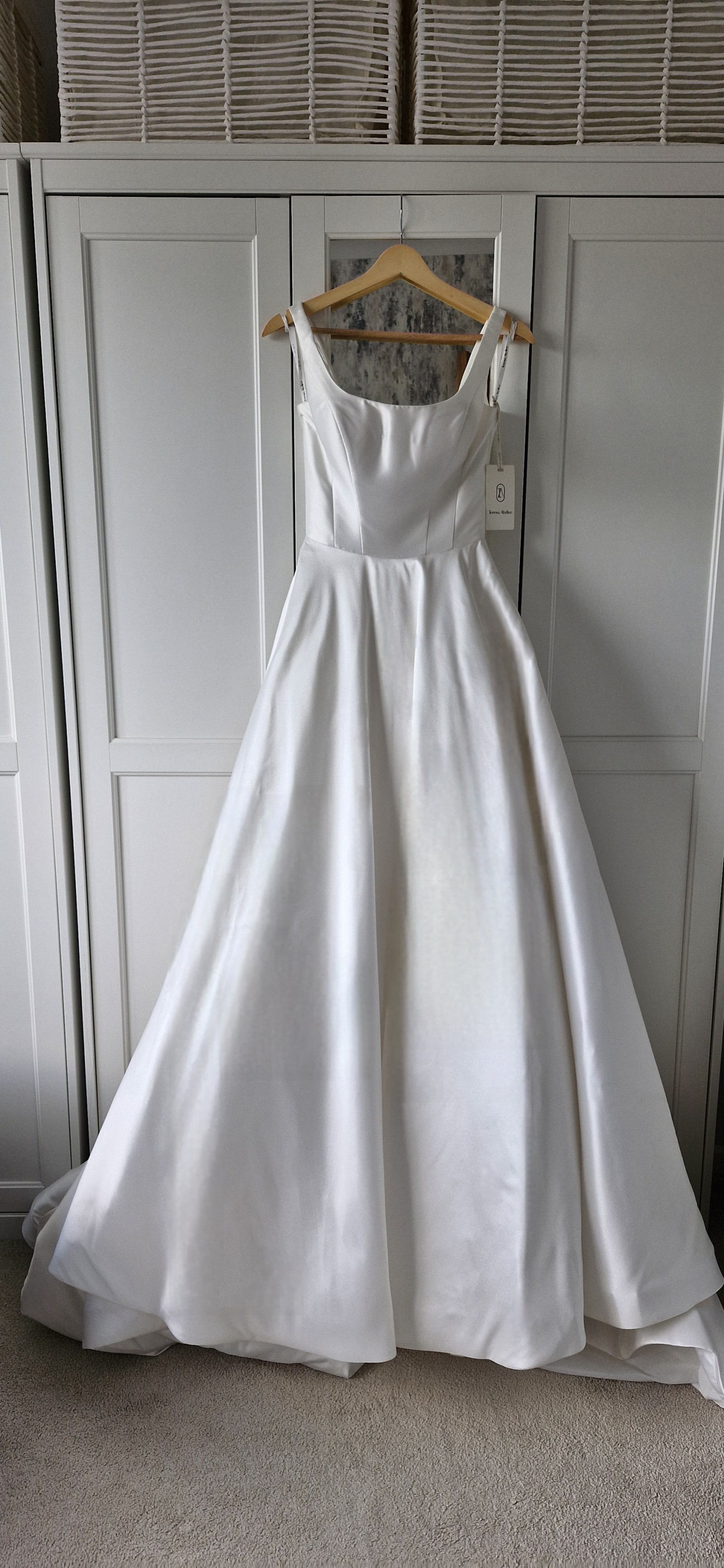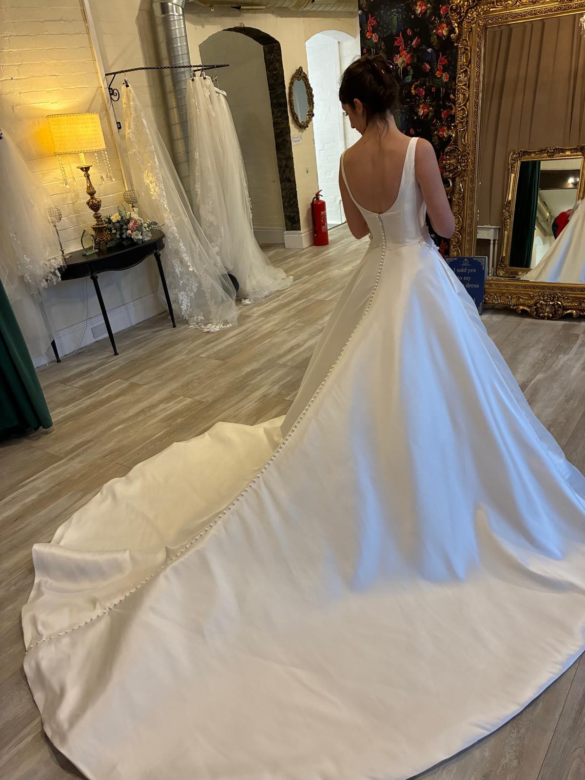 This dress has never been worn other than when trying on once. I purchased this dress and unfortunately just didnt think it was the one for me when trying on for the second time, mainly due to my personal shape. It is in perfect condition, only out of the bag twice. This is a zip up dress, but zip cannot be seen due to button detail. It is a beautiful, simple and classic mikado dress that I think for the right bride will look incredible.