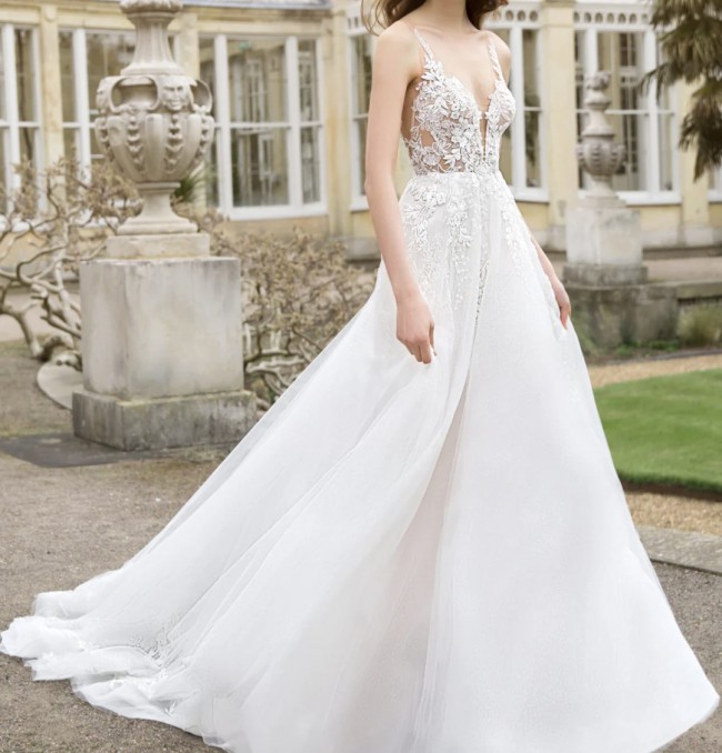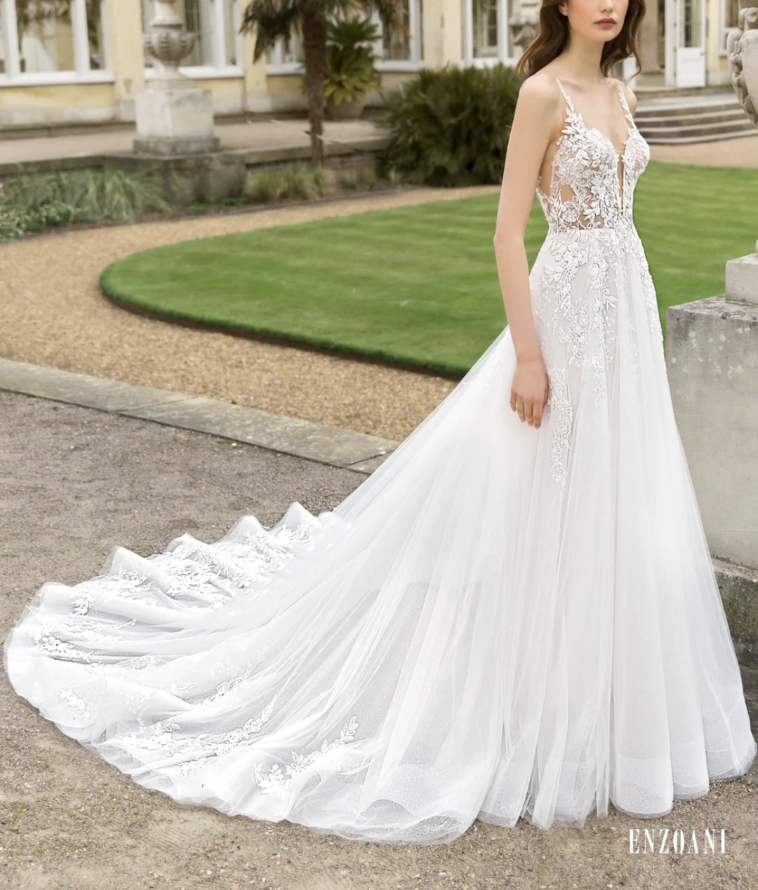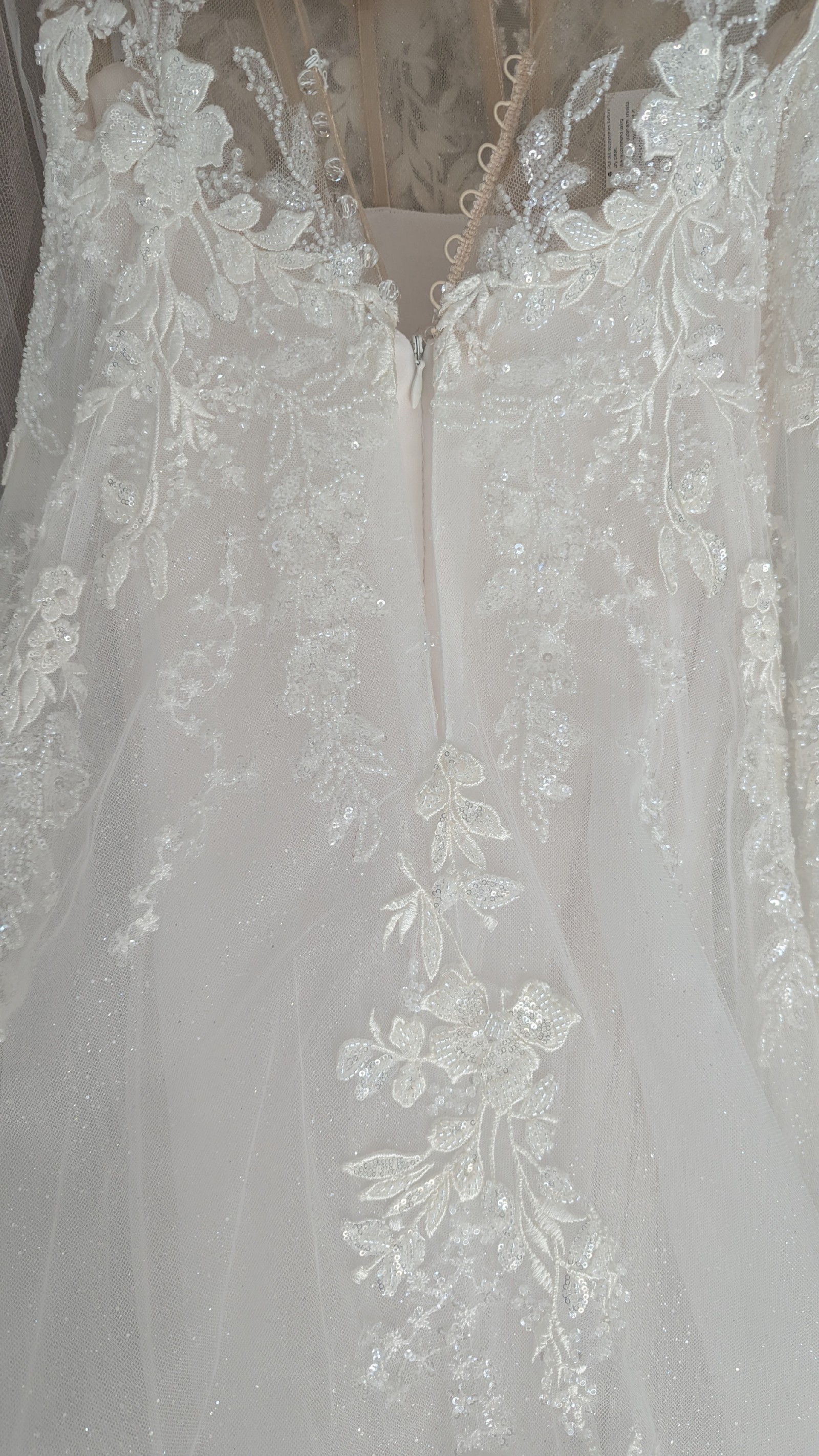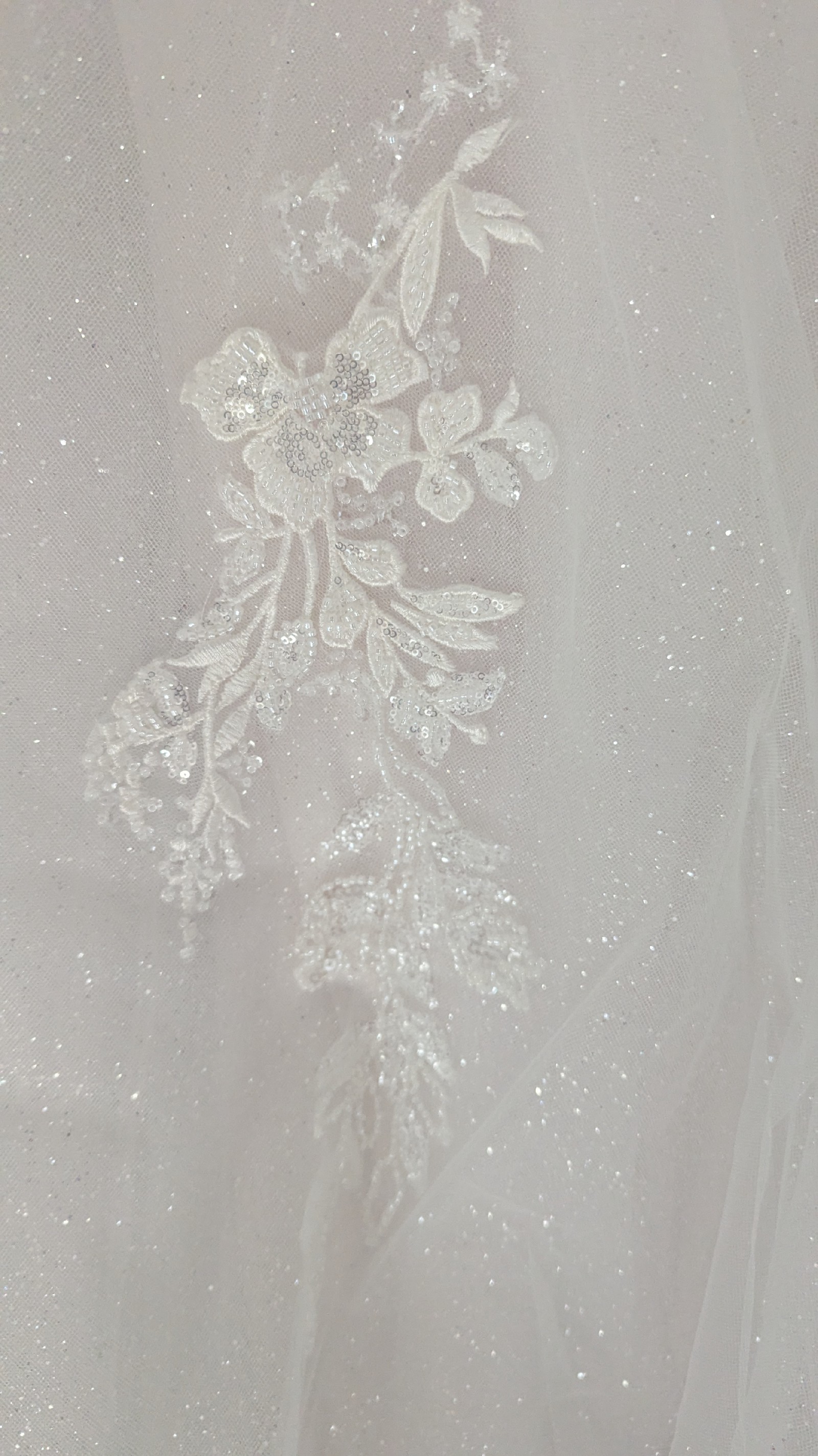 Full airline silhouette with its feature light Volume for an ultra romantic aisle style serenity features a plunging illusion V neckline on an illusion corset bottles open V back and a long lavish organza and tool trains with a shimmering layer underneath for added texture and subtle sparkle exquisite 3D beaded floral motifs and the customized thick dimensional floral embroider lace from top to bottom completes it's real look.