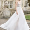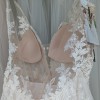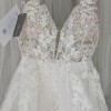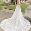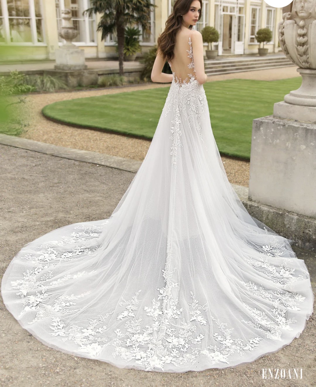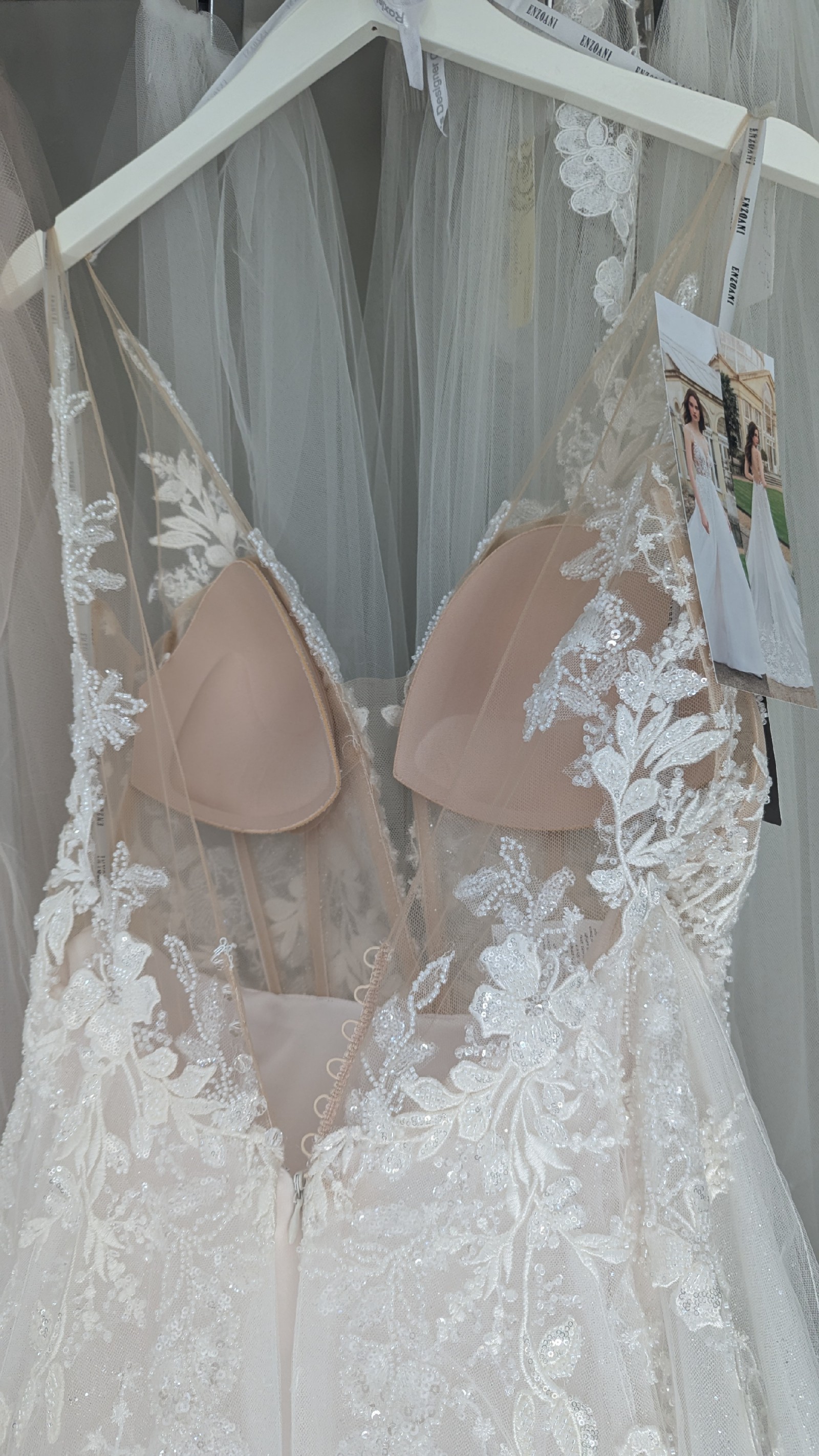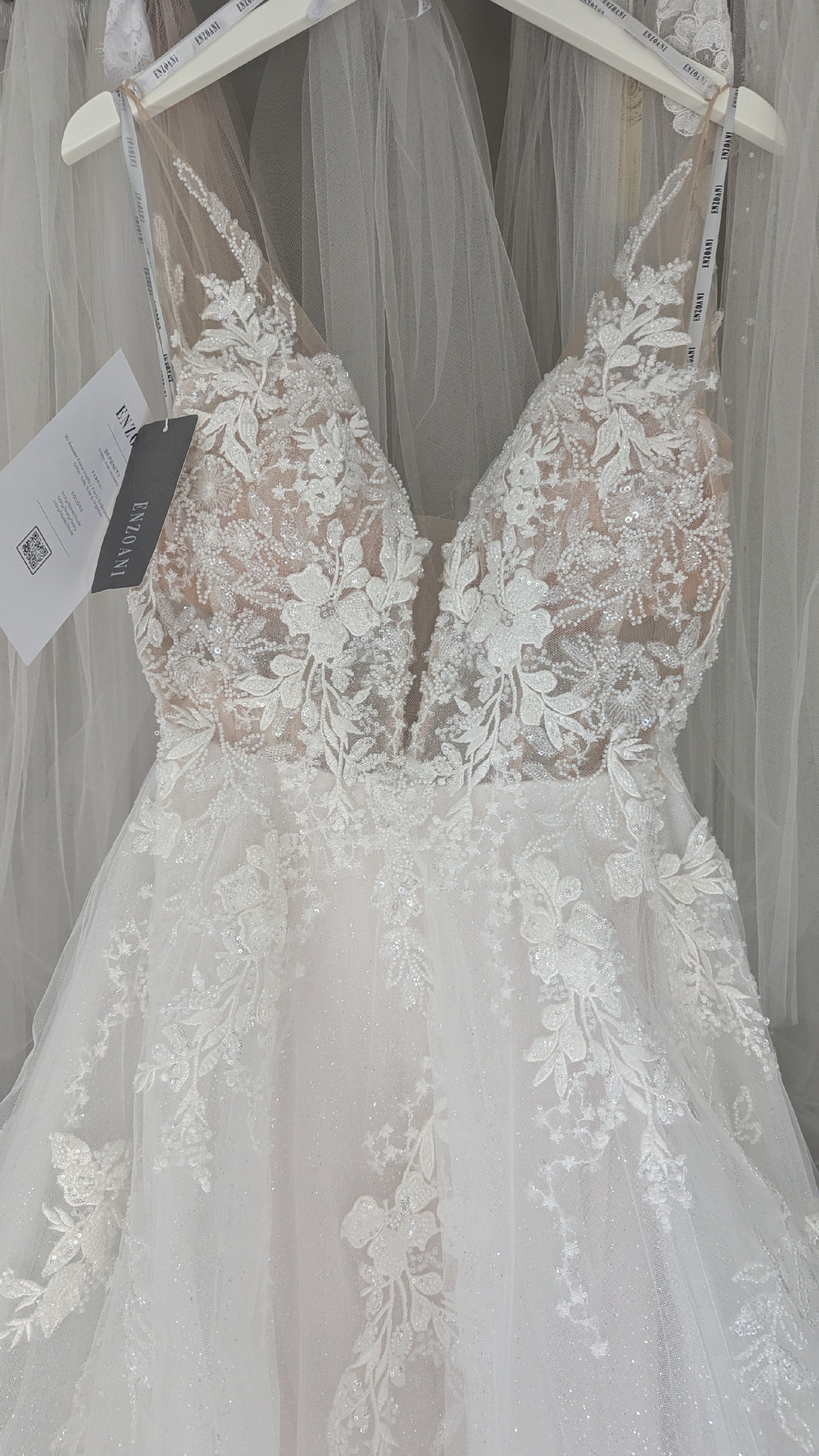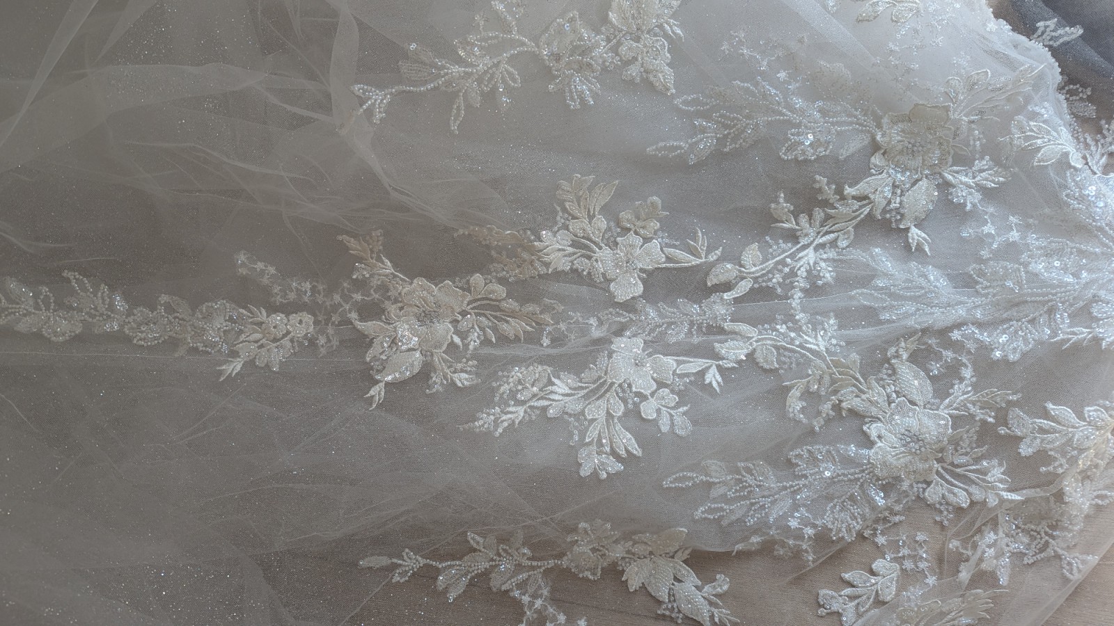 Full airline silhouette with its feature light Volume for an ultra romantic aisle style serenity features a plunging illusion V neckline on an illusion corset bottles open V back and a long lavish organza and tool trains with a shimmering layer underneath for added texture and subtle sparkle exquisite 3D beaded floral motifs and the customized thick dimensional floral embroider lace from top to bottom completes it's real look.