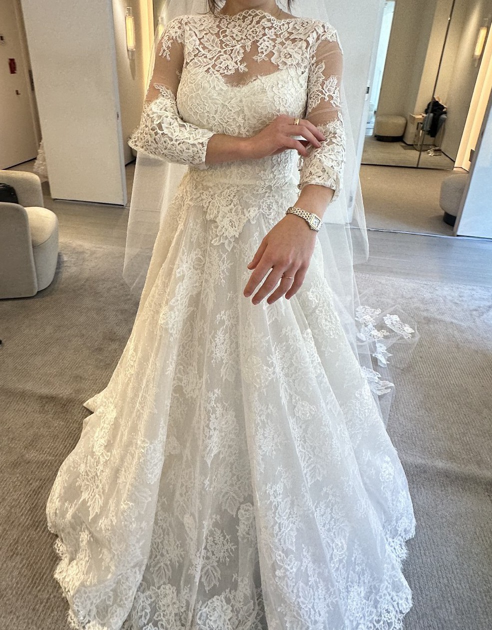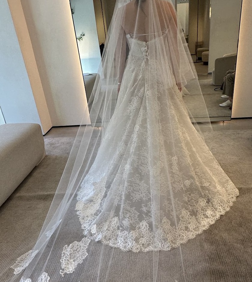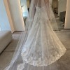 The mid-back design adds a hint of allure, ensuring that this gown is as captivating from behind as it is from the front. The accompanying jacket, which is delicate chantilly lace, featuring delicate sleeves, offers versatility and a handmade lace overlay, that is perfect for transitioning from ceremony to reception. The floor-length design creates an air of grandeur, allowing you to make a statement as you celebrate your special day.