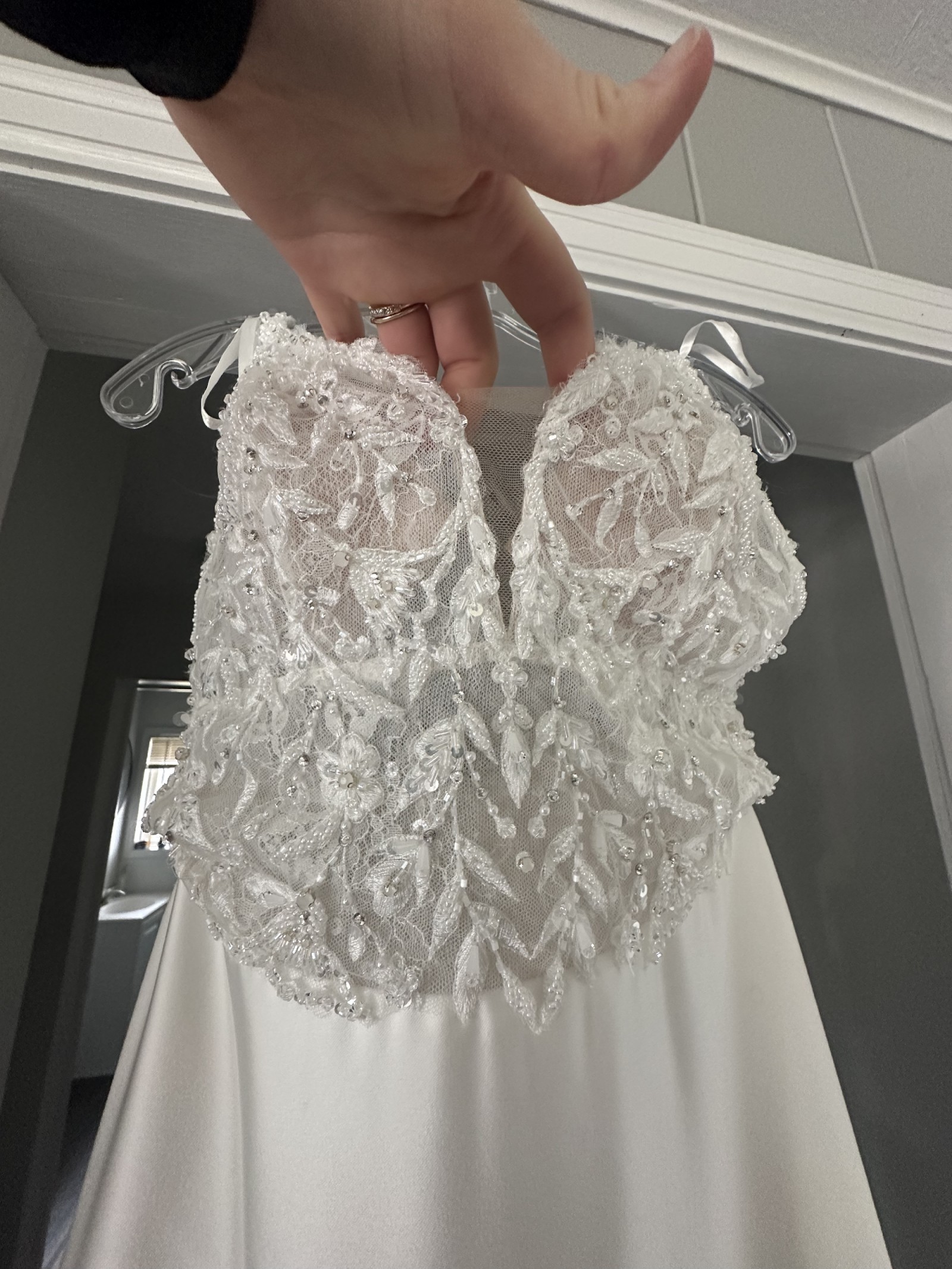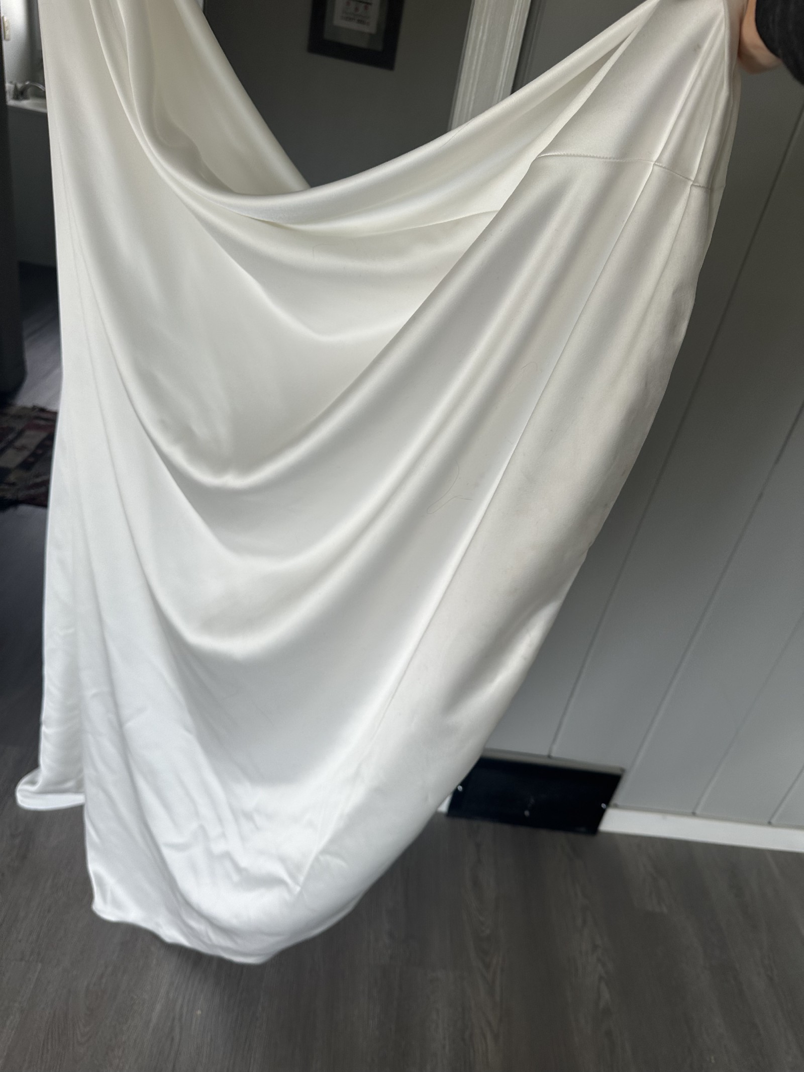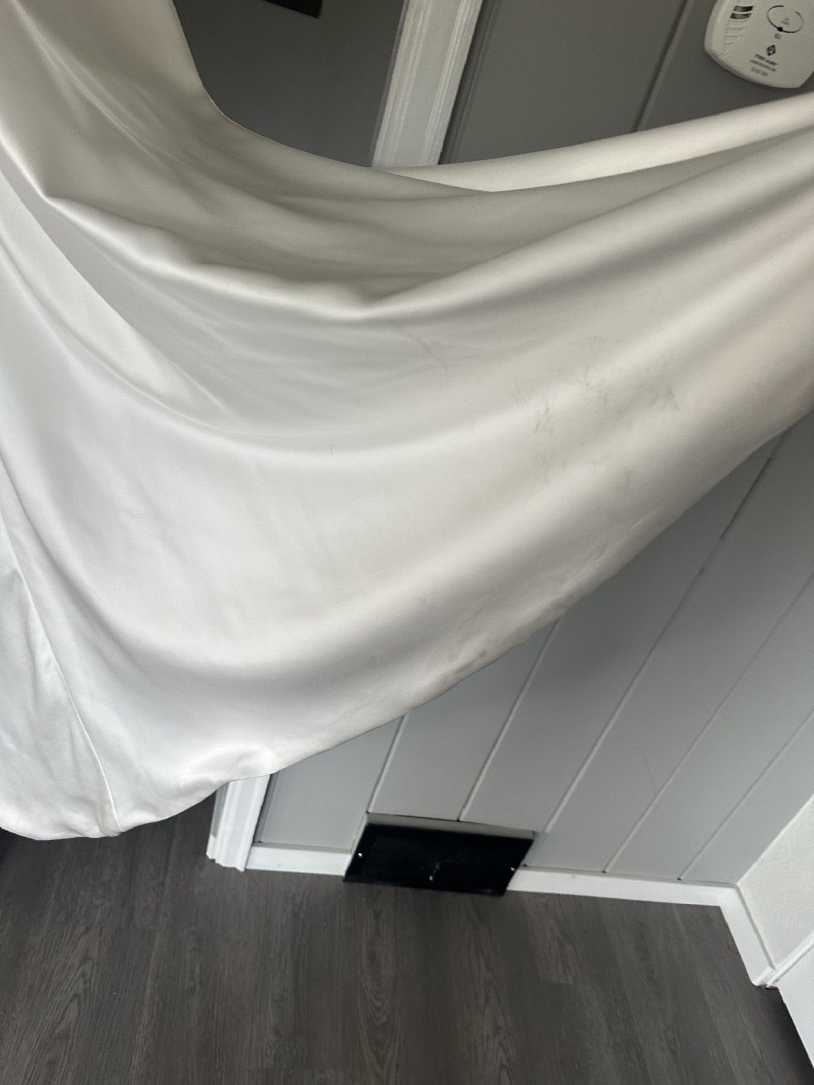 This Dress has some darker spots near the bottom of the dress ( photos included). The dress has been dry cleaned.