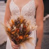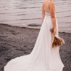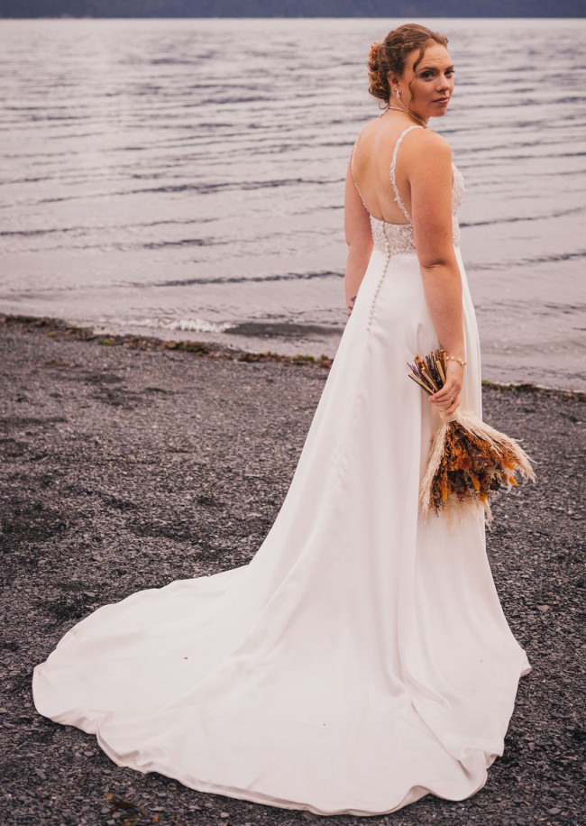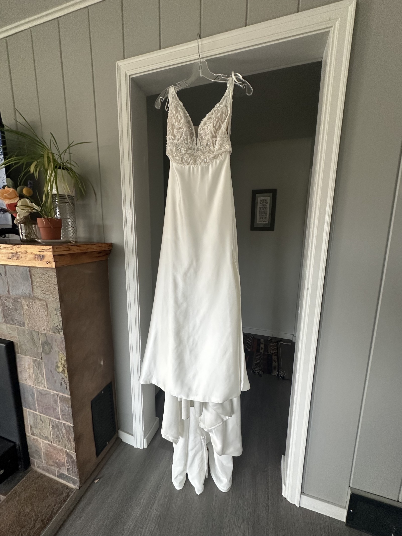 Chic and sexy, this fluid charmeuse wedding dress effortlessly moves. With a tasteful V-neckline, the illusion bodice is detailed with a Chantilly lace layer and is embellished with carefully hand-beaded embroidery that beautifully glistens as it catches the light. The light and airy A-line silhouette is finished with a seductive skirt slit and buttons to the end of the zipper. If preferred, this dress is also available without the slit.