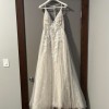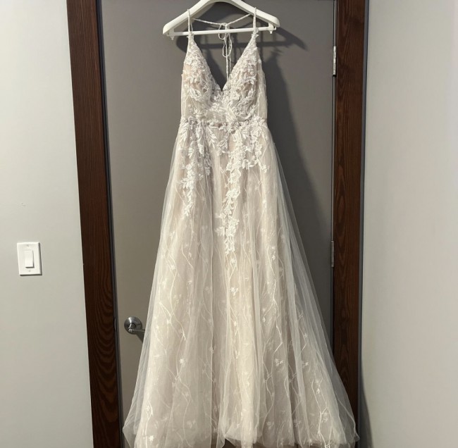 Size 12 Wedding dress. Sample sale, no alterations. Worn once. PRONOVIAS designs- HYPERION blush dress in tulle with floral placements, spaghetti straps, open leg slit, and unique back detail. Comes with hanger and garment bag from Novella Bridal