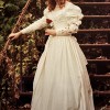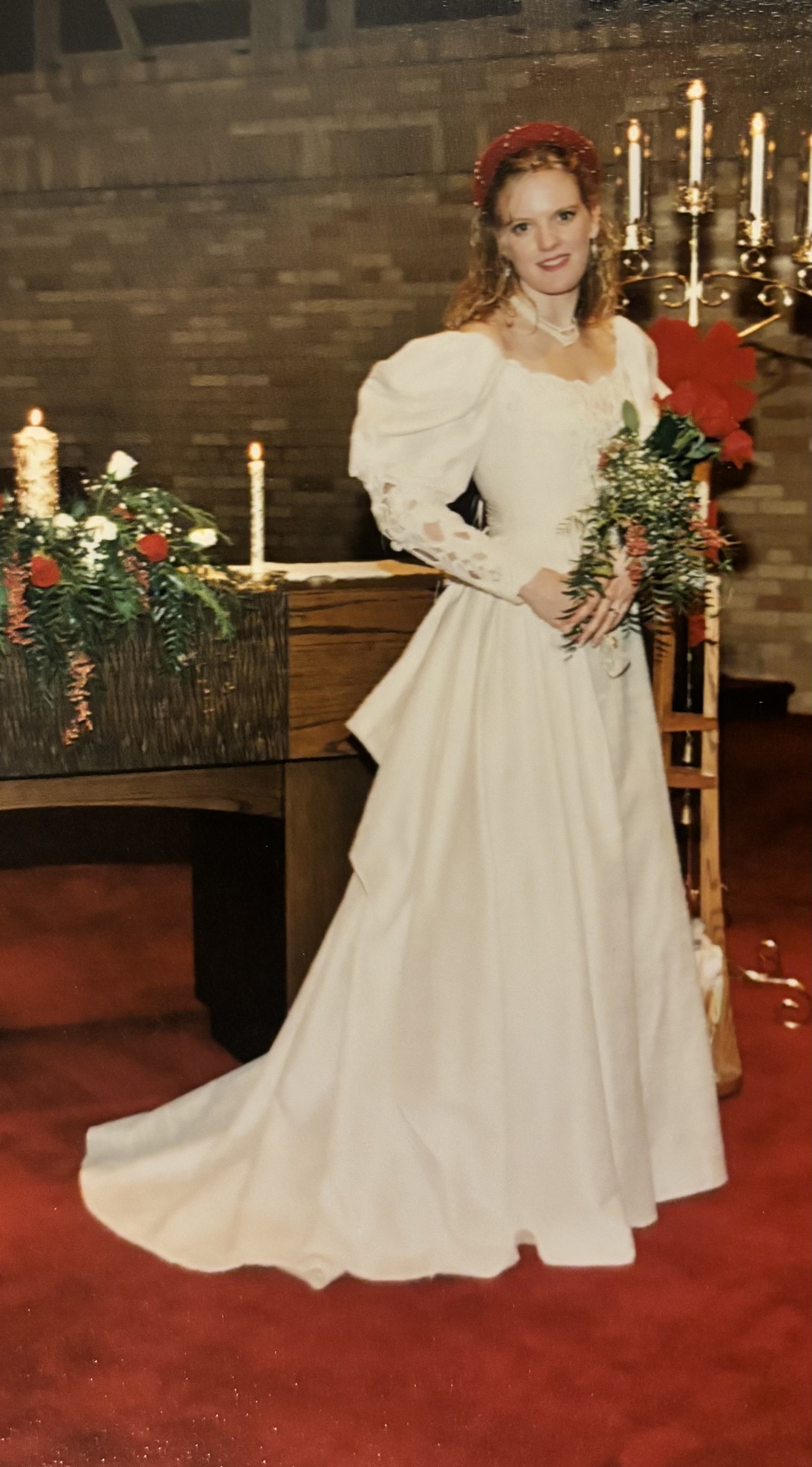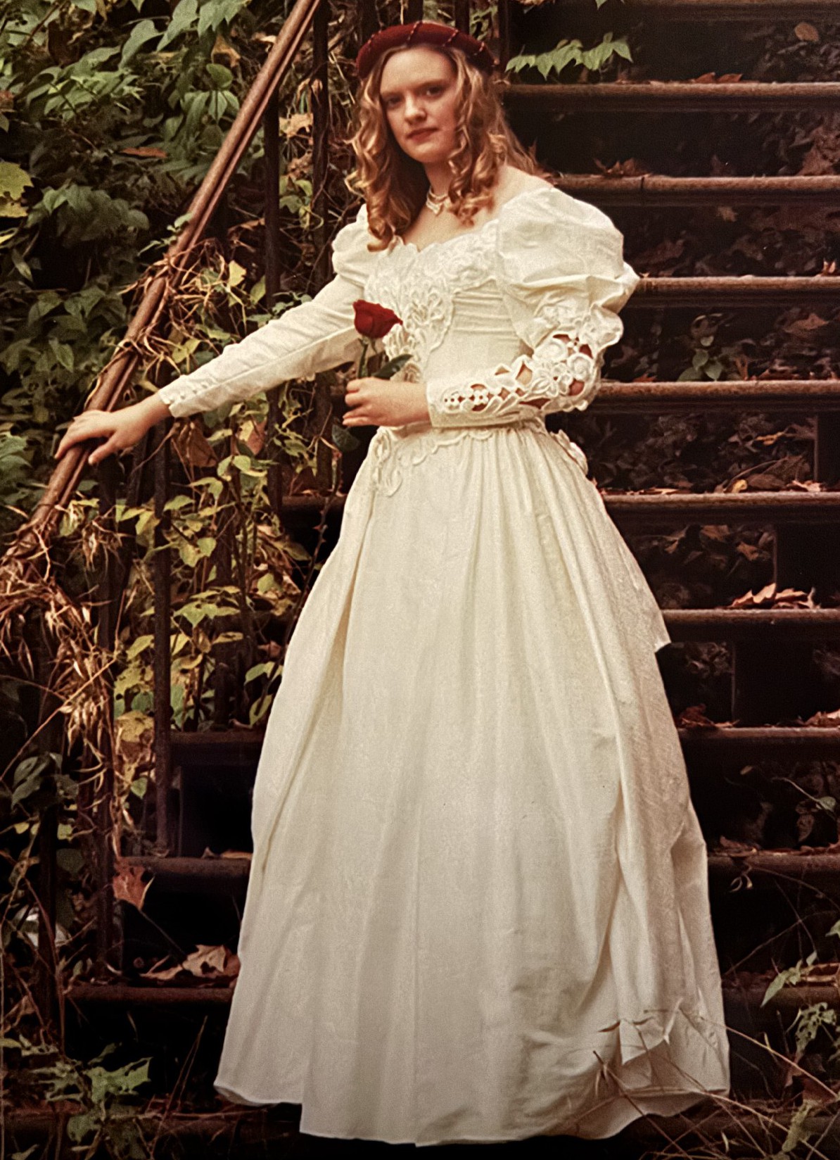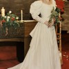 Silk, dupioni gown with a sweetheart neck line, venice appliqués and trim, puff sleeves, back bustle, roses and long full skirt. the details on this dress are so fun.