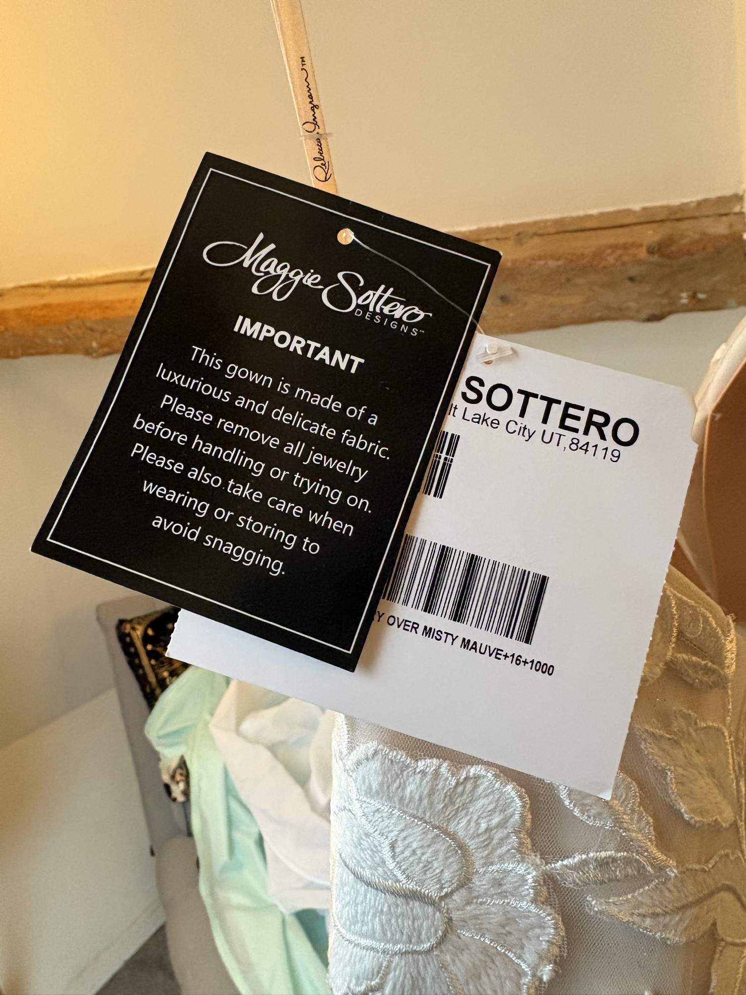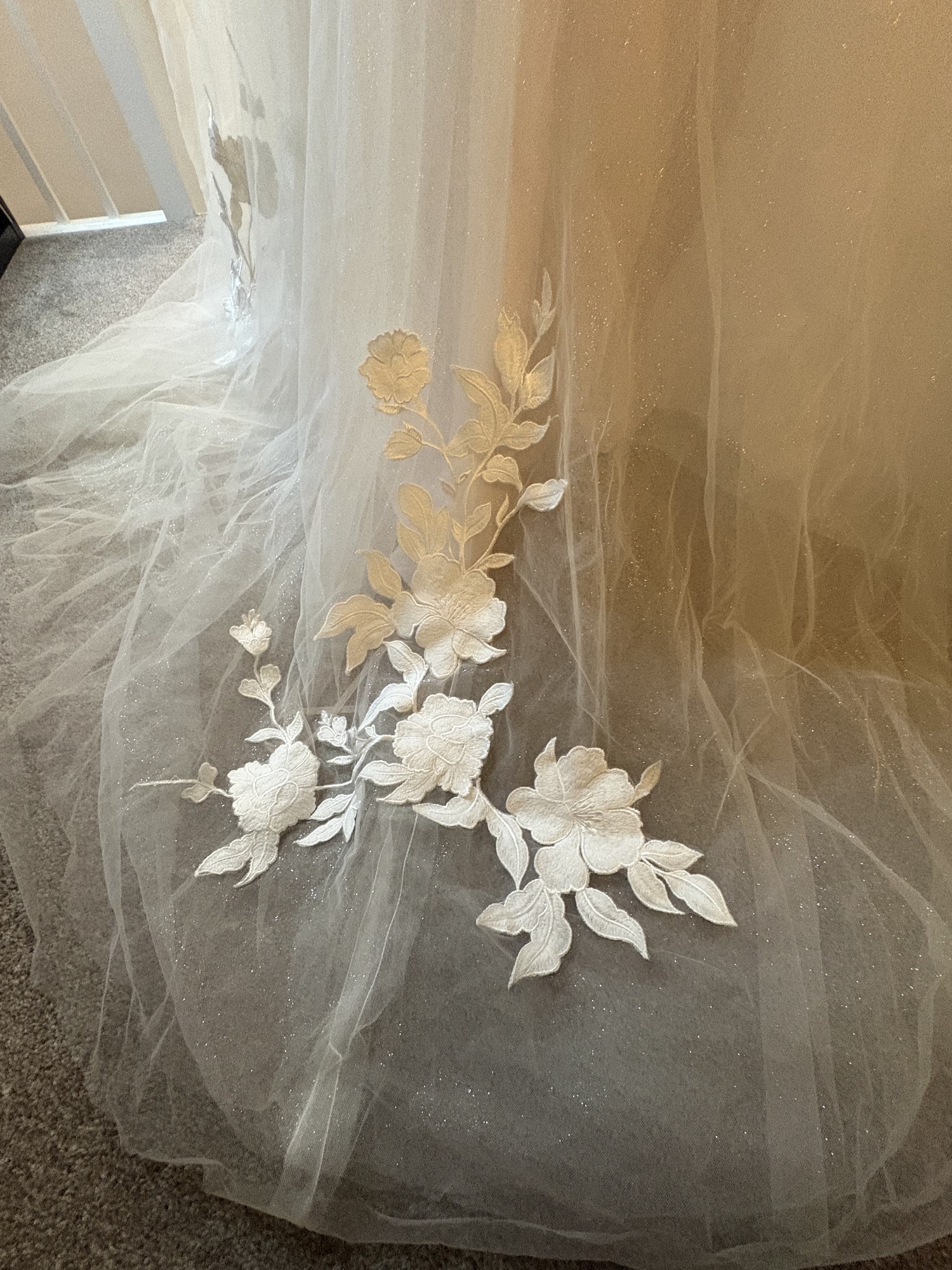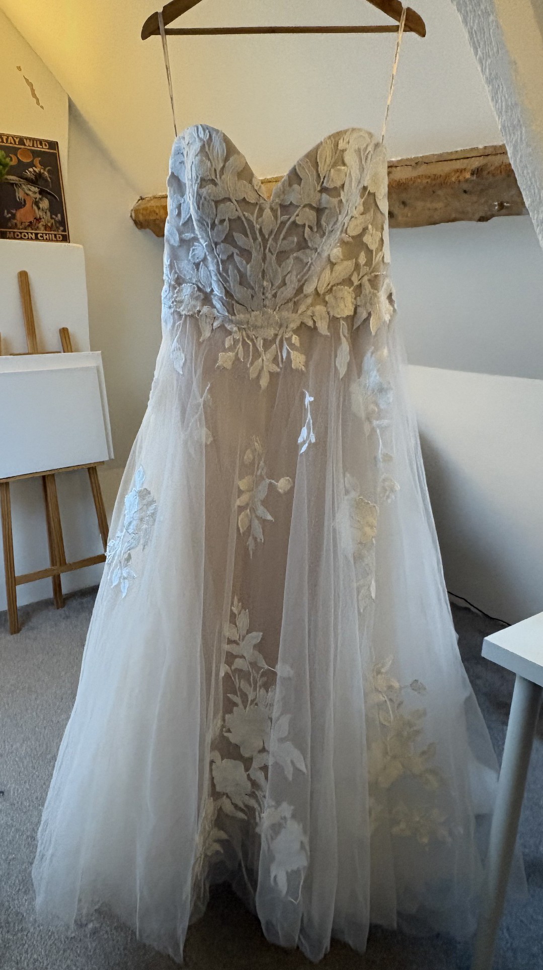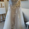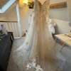 This dress was purchased new and has never been worn and has been stored in a smoke-free home, preserved in the original dress bag. We later moved our wedding to a different season, and I chose another gown better suited to the change. The dress has never been worn, altered, or tried on beyond the boutique.