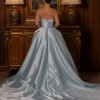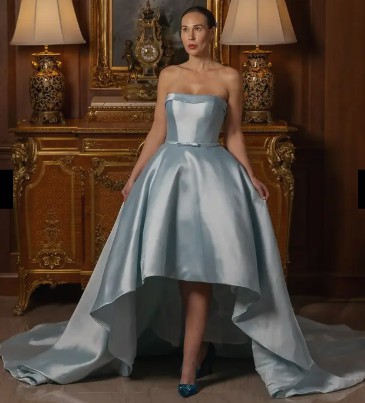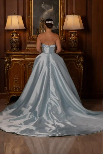 The Linda gown epitomizes classic elegance with its strapless, straight-across neckline that beautifully frames the shoulders and features a polished collar for added sophistication. The sleek bodice, cinched with a delicate mikado ribbon, flows into a full, luxurious skirt that embodies timeless grace and sophistication. The back is adorned with a trail of covered buttons, extending into a magnificent chapel-length train, making it perfect for a bride who desires a blend of modern simplicity and traditional grandeur. This gown is a sample gown and has not been worn by a bride. There are no stains or other imperfections.