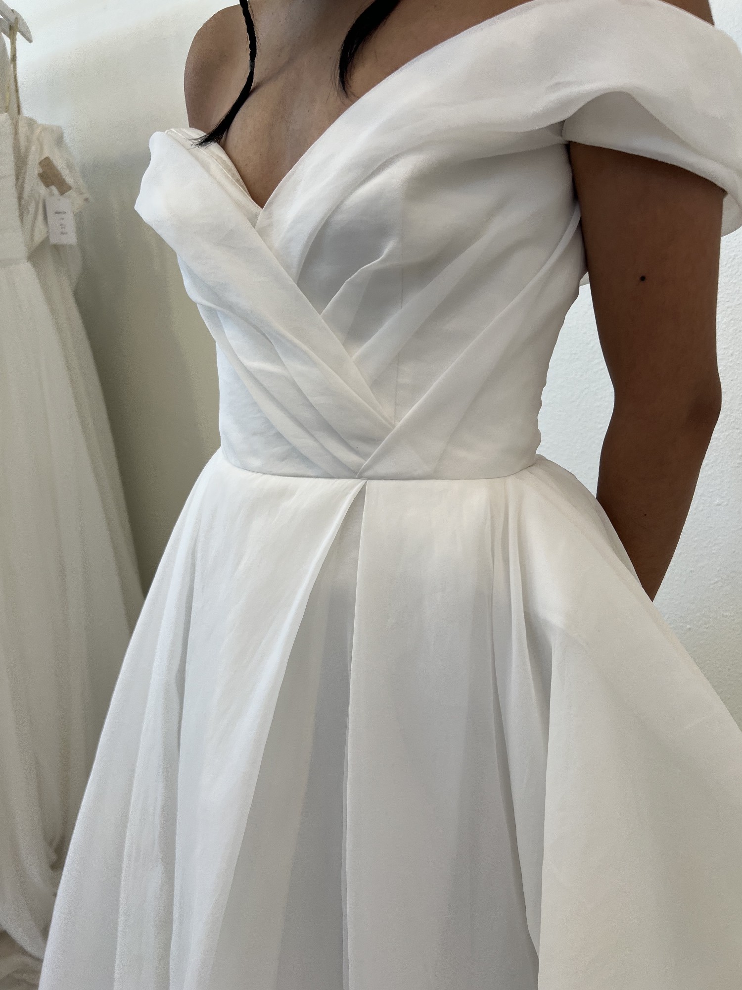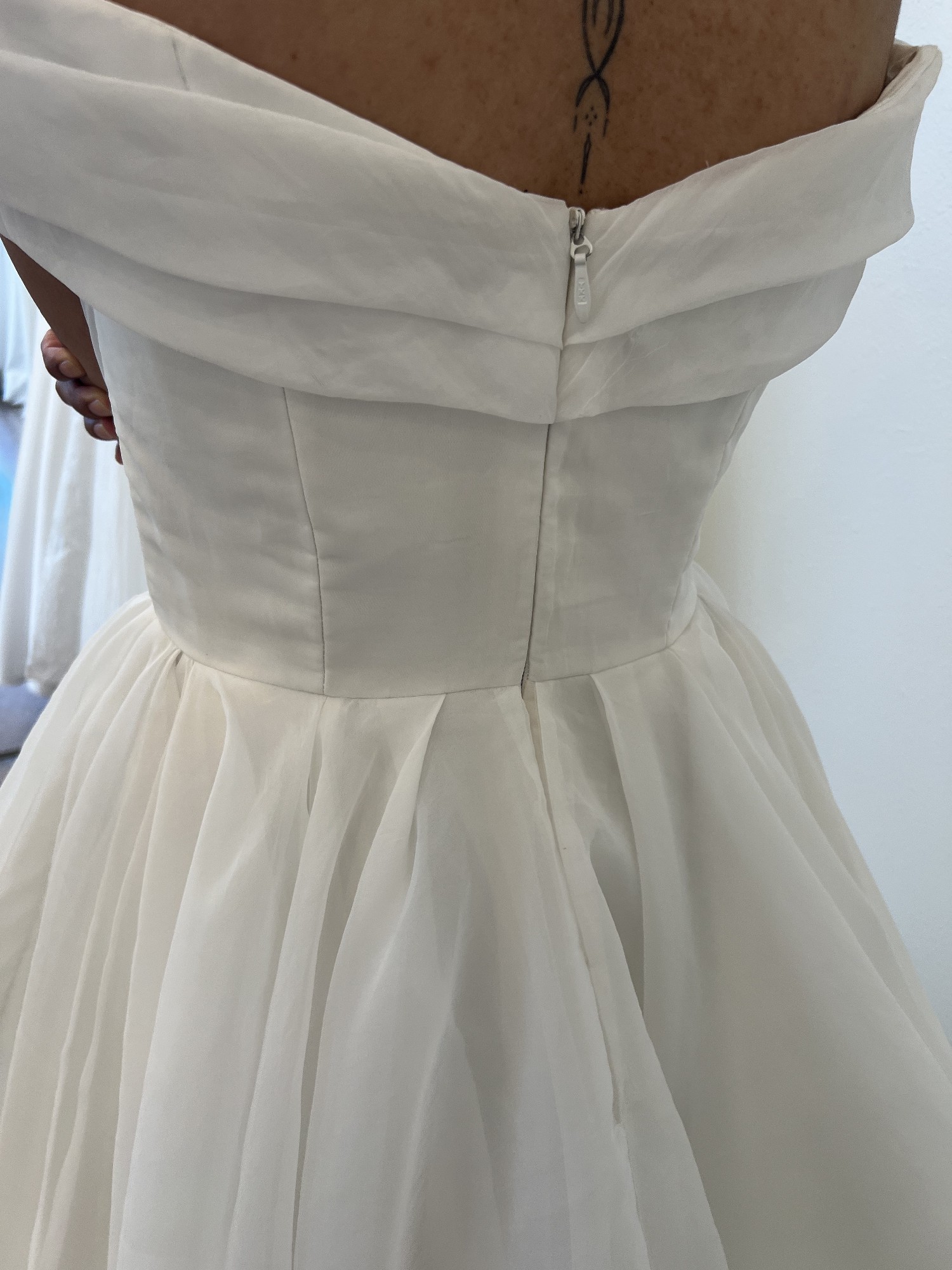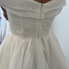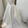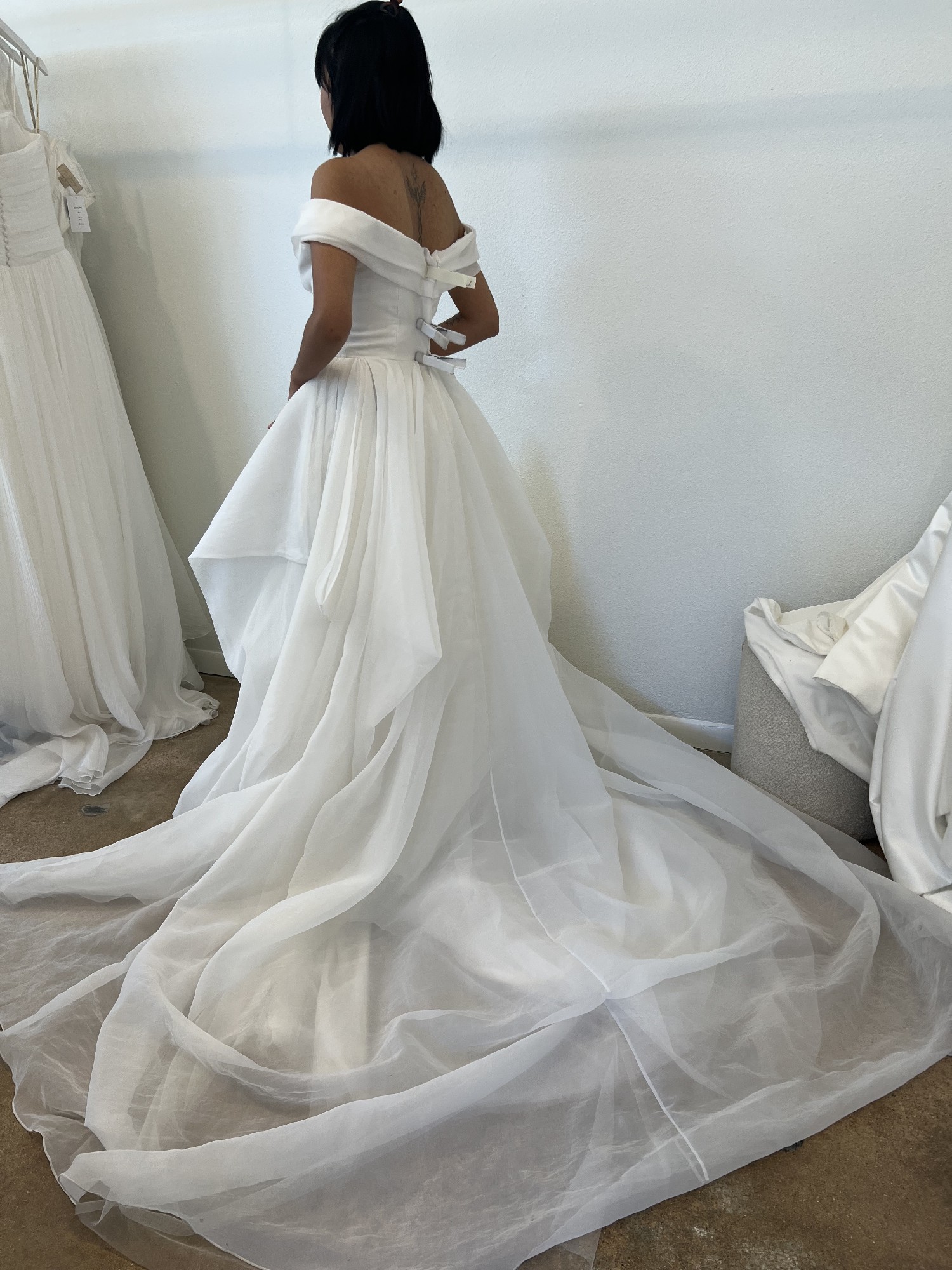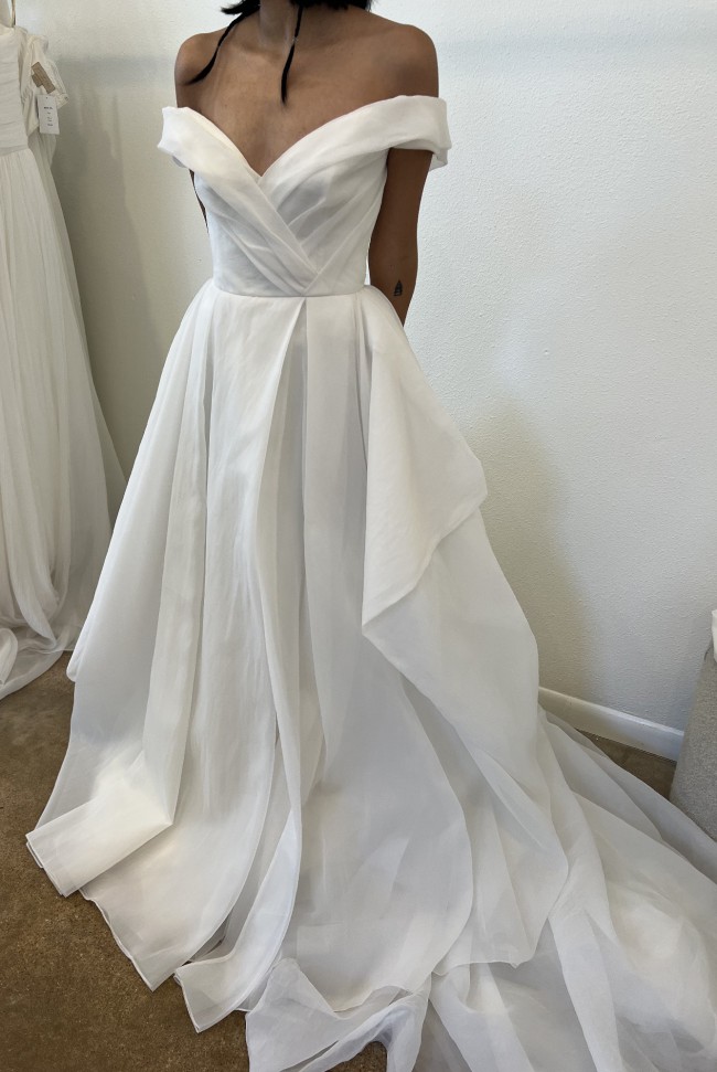 Item was a floor sample and does have some signs of wear. The dress has never been altered. Damage shown in pictures. Some discoloration on train.