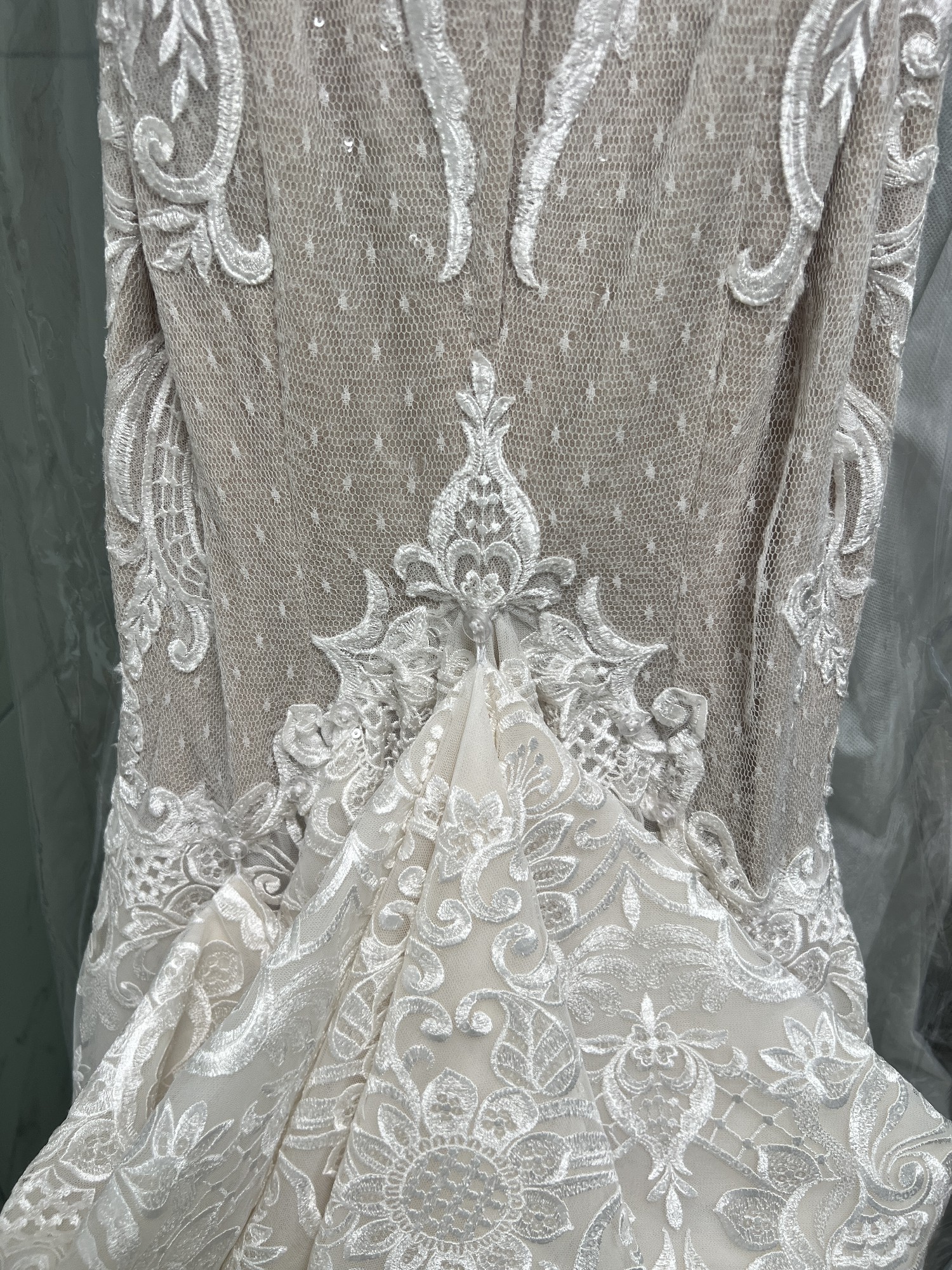 The intricate embroidery and delicate sequins catch the light beautifully, creating a dreamy shimmer that truly sets this dress apart. The spaghetti straps provide just the right amount of support, while the stunning V back adds an unexpected allure. The floor-length design ensures a timeless beauty that will be remembered in every photograph.