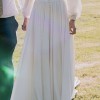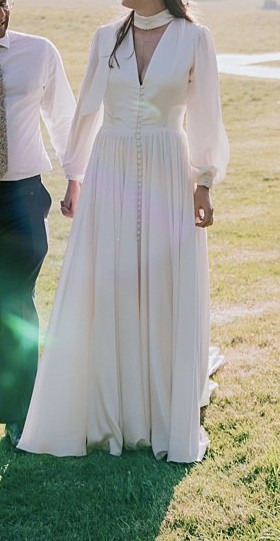One of my favorite features has to be the long, puff sleeves that evoke a feeling of romance and whimsy. They dance with every movement, creating a lovely silhouette. As I walked down the aisle in this dreamy floor-length gown, I felt like I was floating. The fabric flows so beautifully, and the way it catches the light is truly magical.